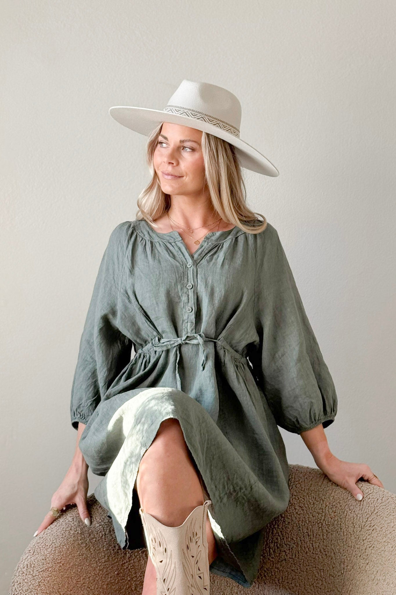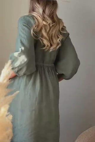 A light and feminine dress with beautiful tie details that accentuate the waist and add gorgeous volume to the hem. Pockets add practicality, front buttons provide a stylish touch, and puff sleeves with subtle cuffs complete the look