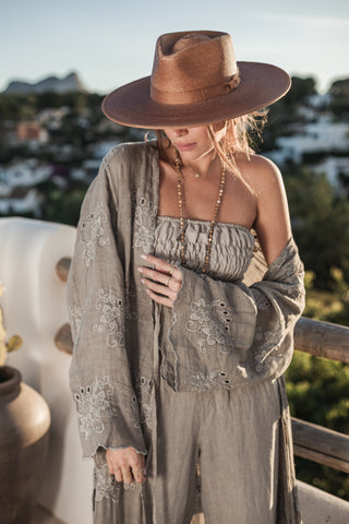 Lilias embroidered linen kimono, taupe
