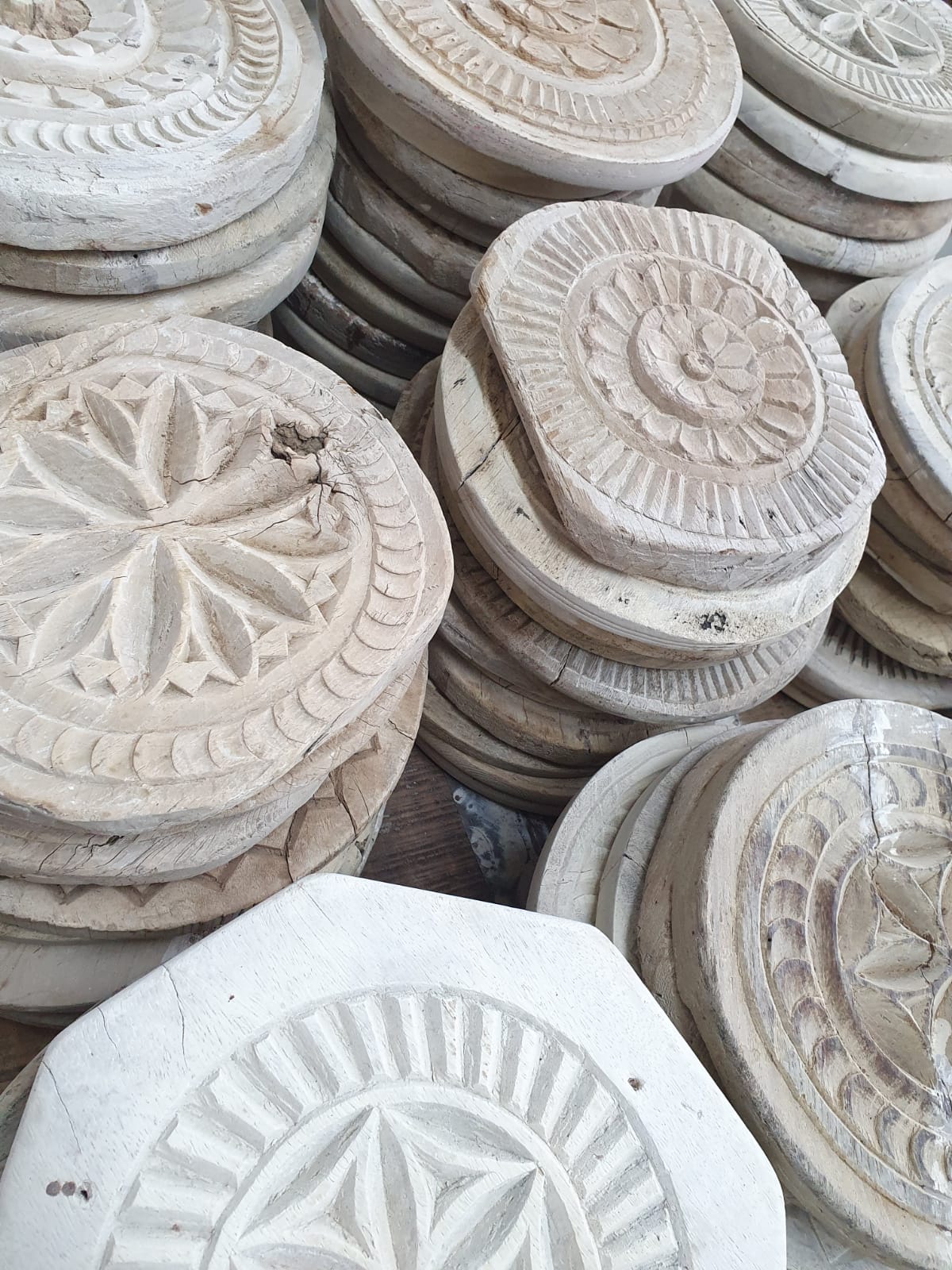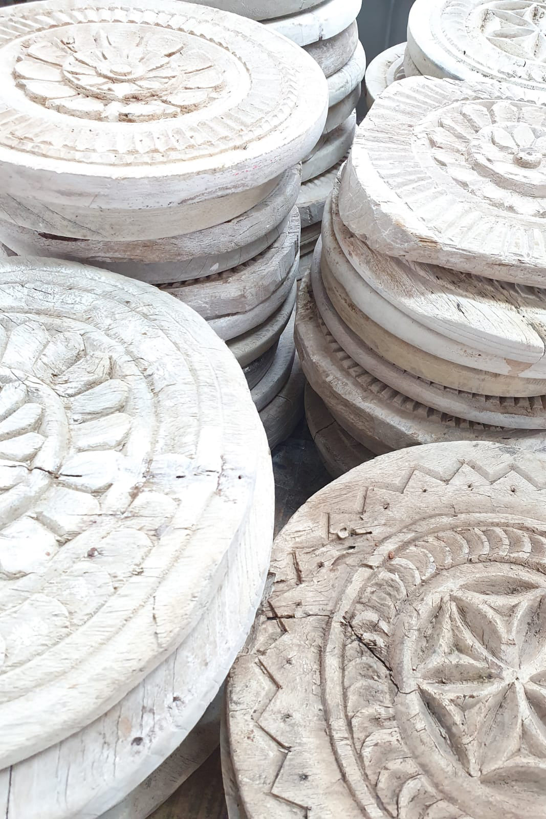 Perinteisen Chapati-leivän valmistuksessa muottina käytetty alusta. Upea, uniikki sisustusesine, joka toimii myös kauniina tarjoilualustana. Tässä mallissa ei jalkoja eikä kahvaa. Vaaleaa, käsin kaiverrettua mattapintaista puuta. Halkaisija 23-30cm yksilöstä riippuen.