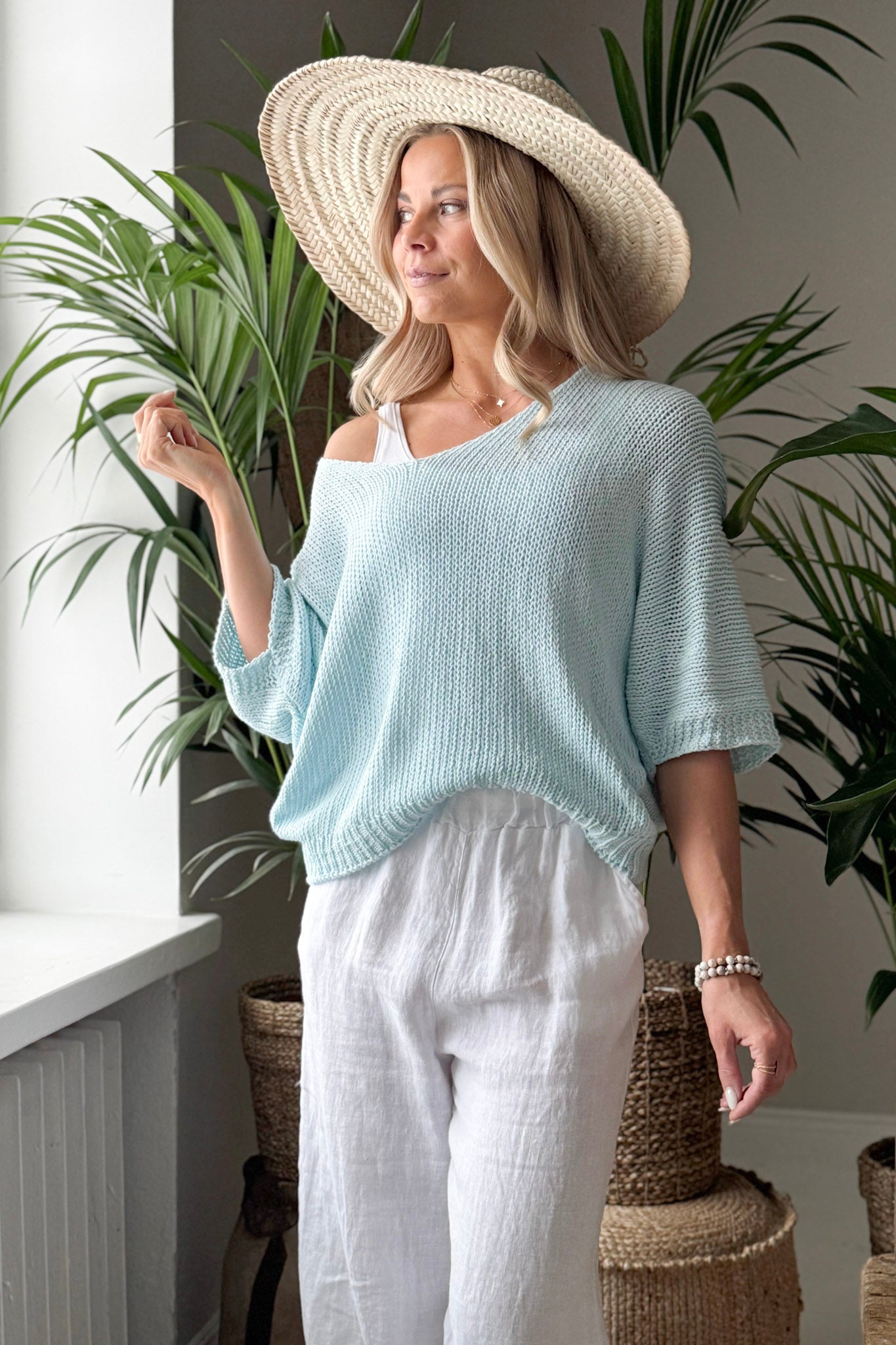 A lightweight and highly versatile cotton knit, perfect for year-round wear. The relaxed dropped shoulder line, flattering V-neckline and 3/4-length sleeves create an effortlessly stylish silhouette. Subtle ribbed trims at the hem and cuffs complete the look and make the knit easy to pair with a variety of outfits.