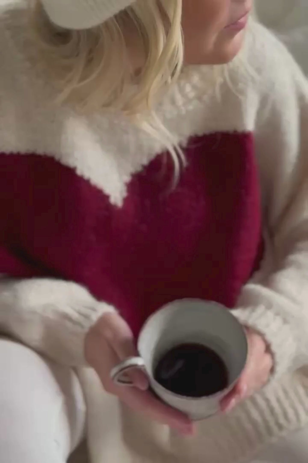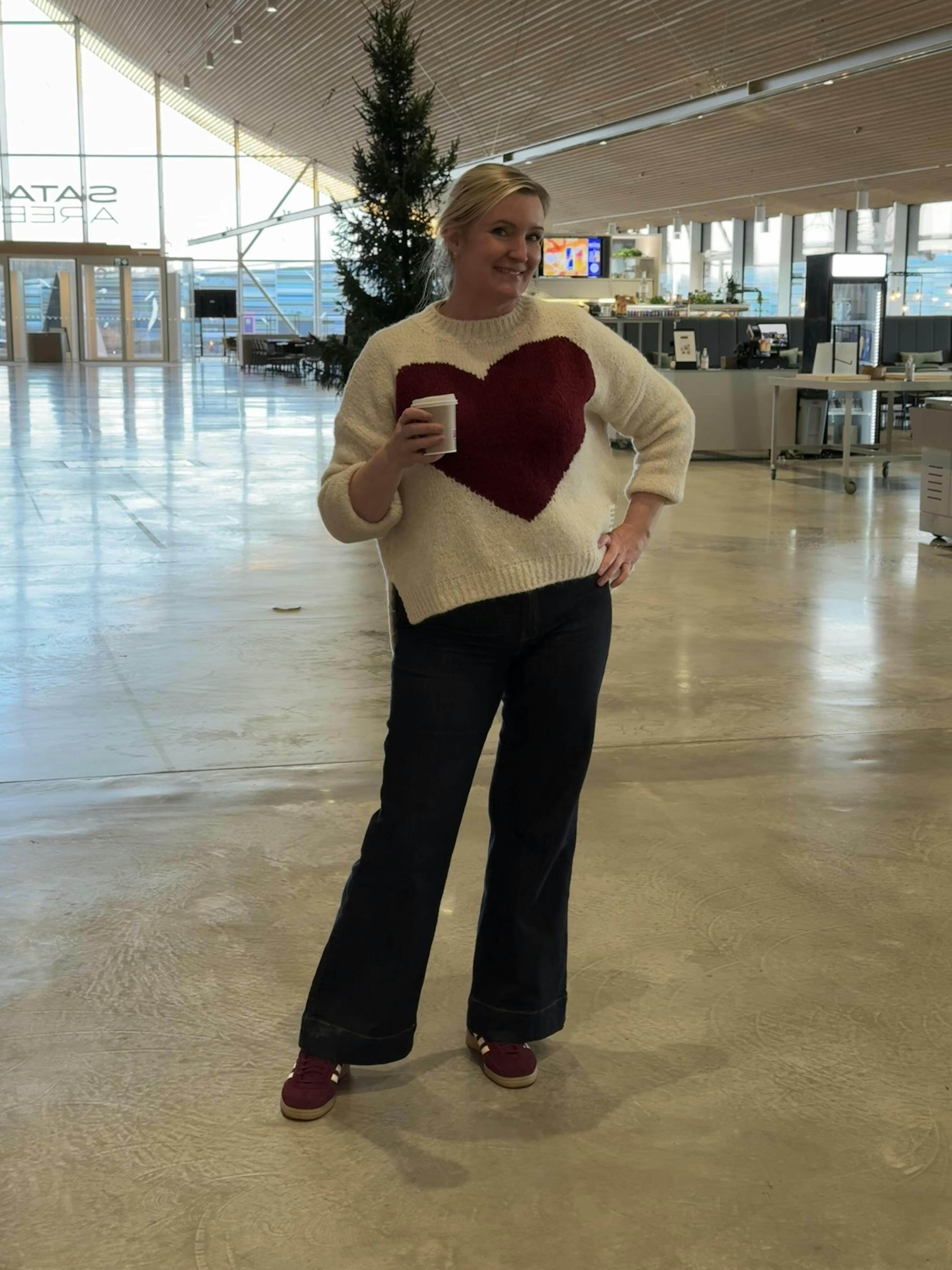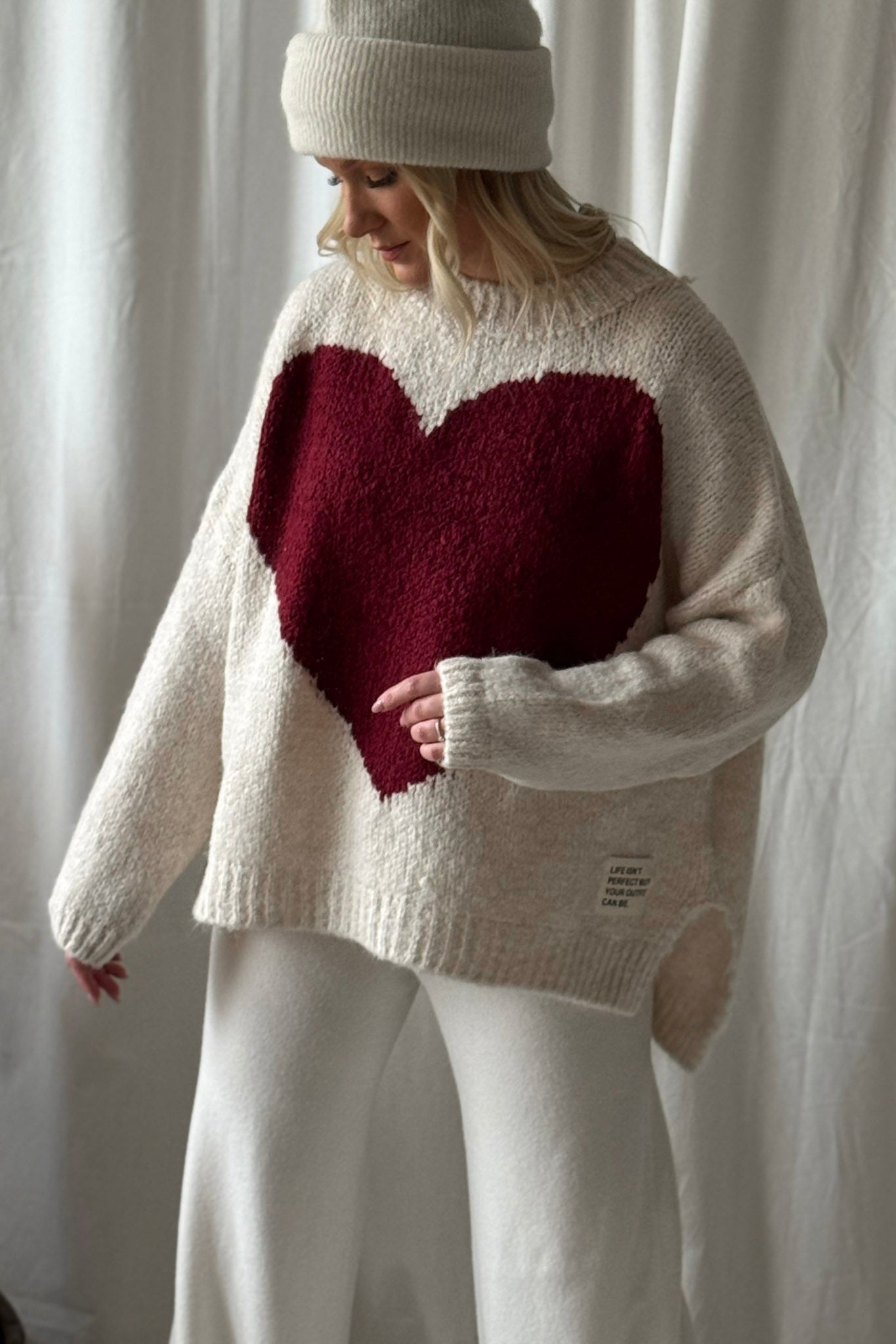 The dreamily soft heart sweater completes your hygge moments. The composition of this sweater does not itch anyone. Oversized model with side slits.