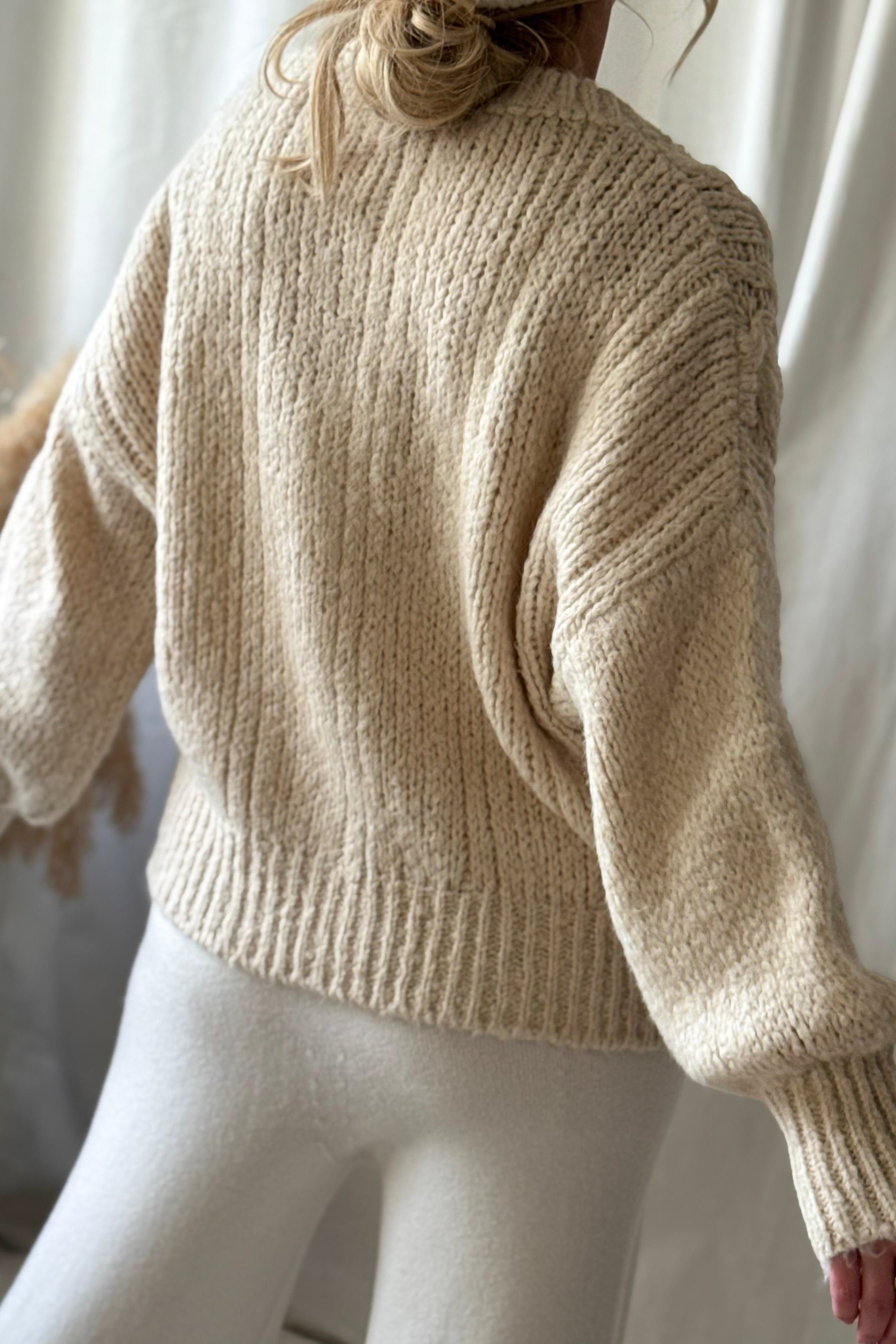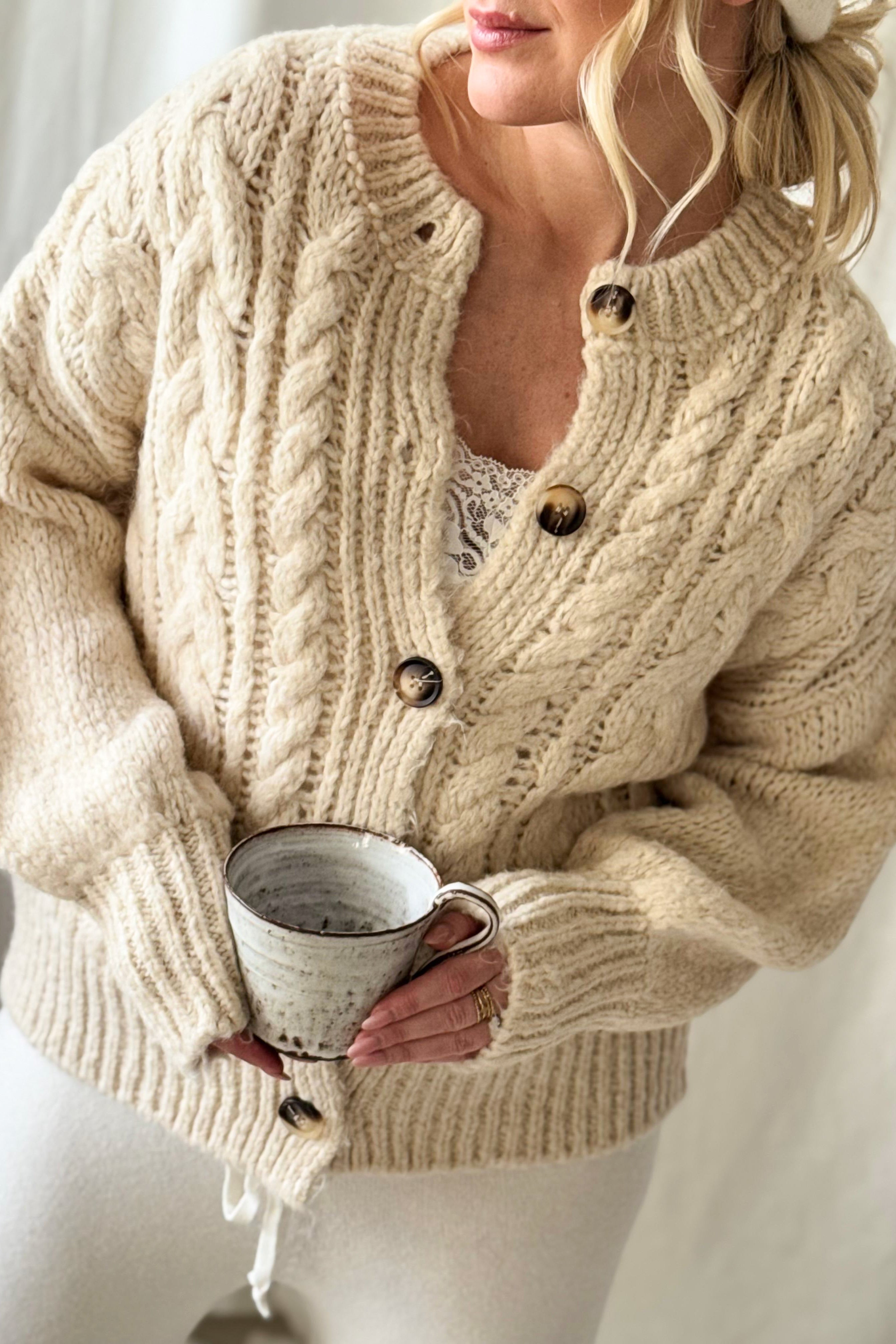 The chunky, stretchy knit that doesn’t itch even the most sensitive skin feels like a warm hug. Ribbed cuffs and large buttons crown the look of the perfect hygge cardigan. One size, fits sizes 36–42. Also available in a similar style, the Faustine cable-knit jumper with a round neckline. The shade of the cardigan is beige-toned.
