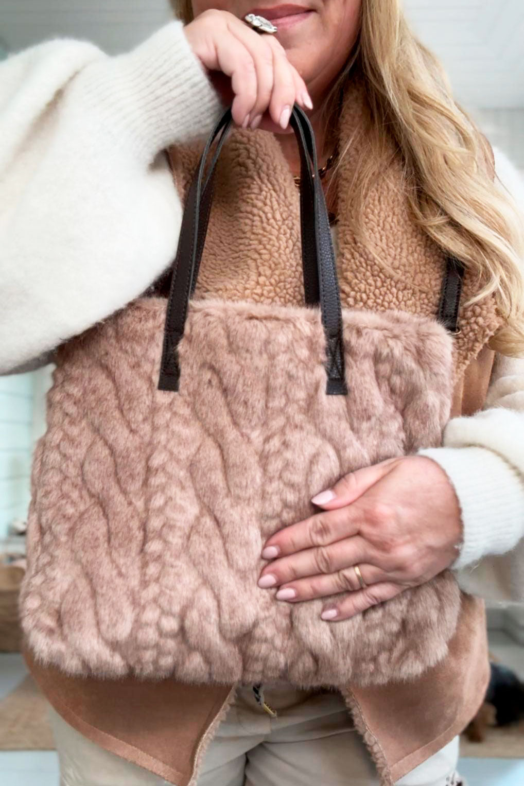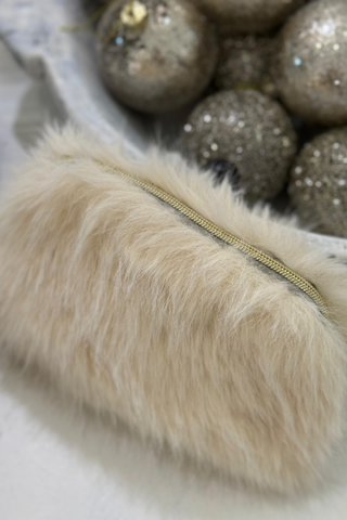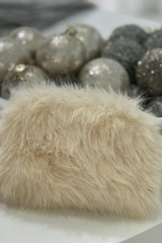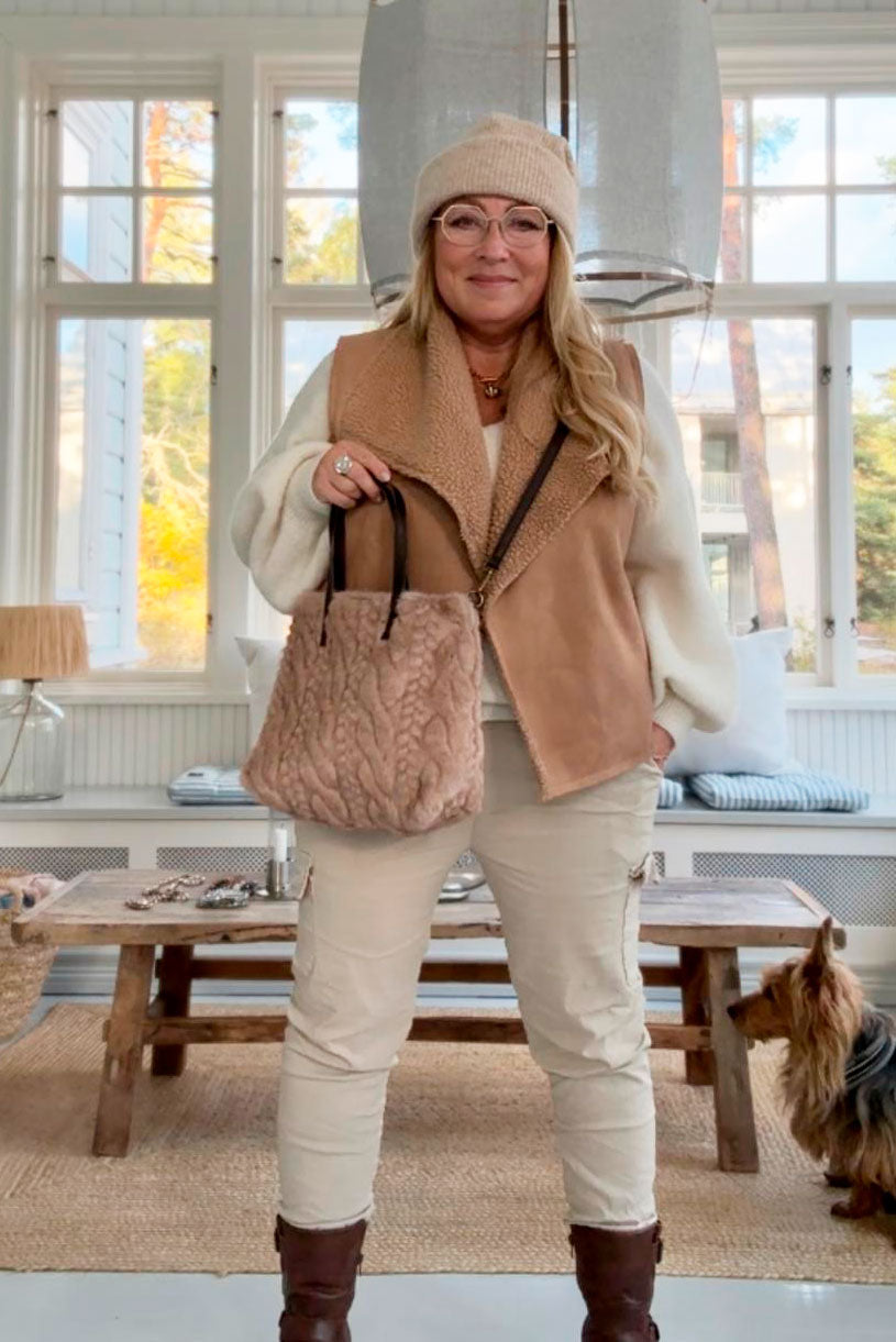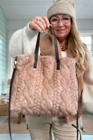 Super soft and fluffy faux fur bag with a fun braid pattern all over. A small pocket with a zipper on the inside.