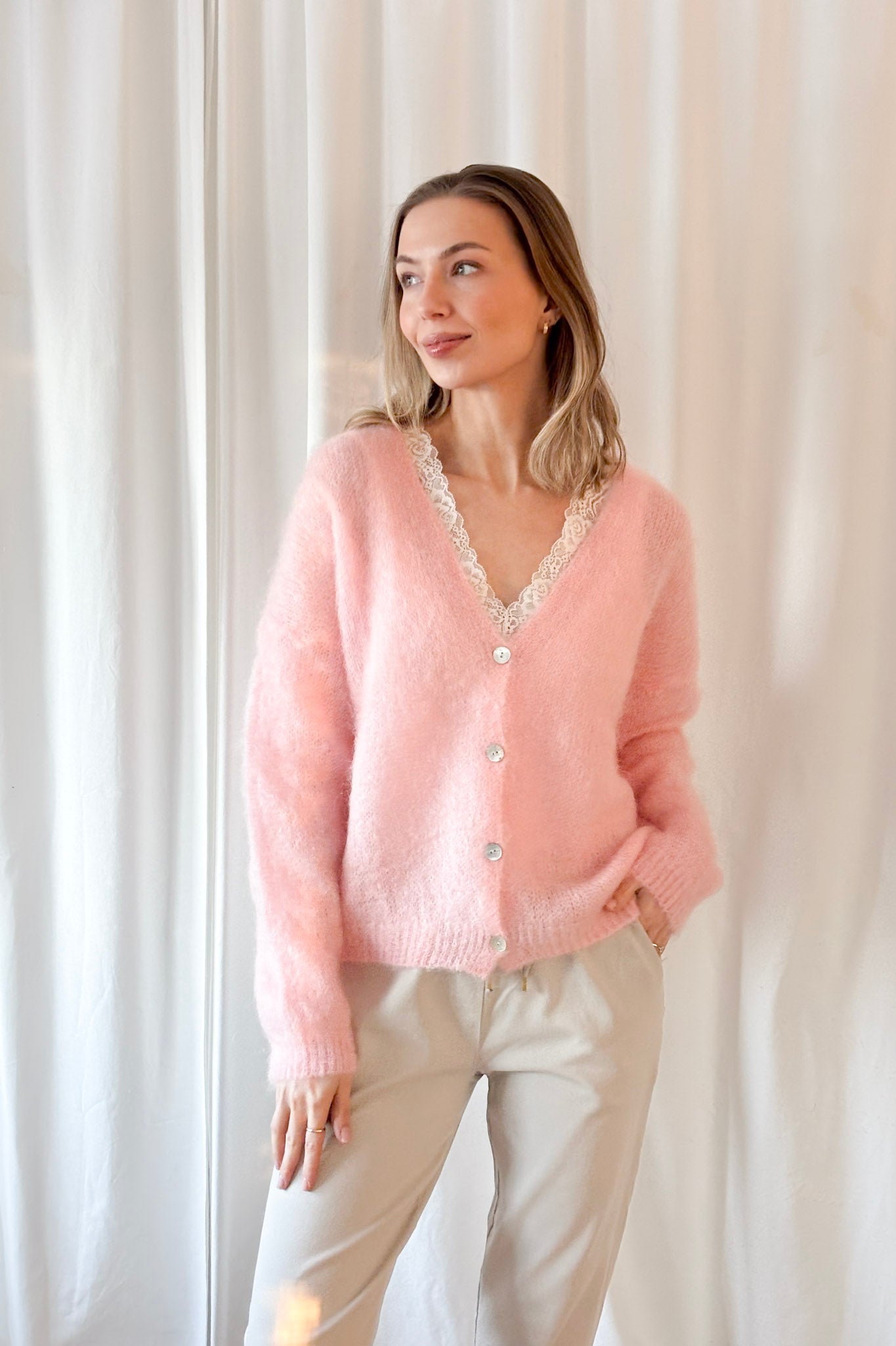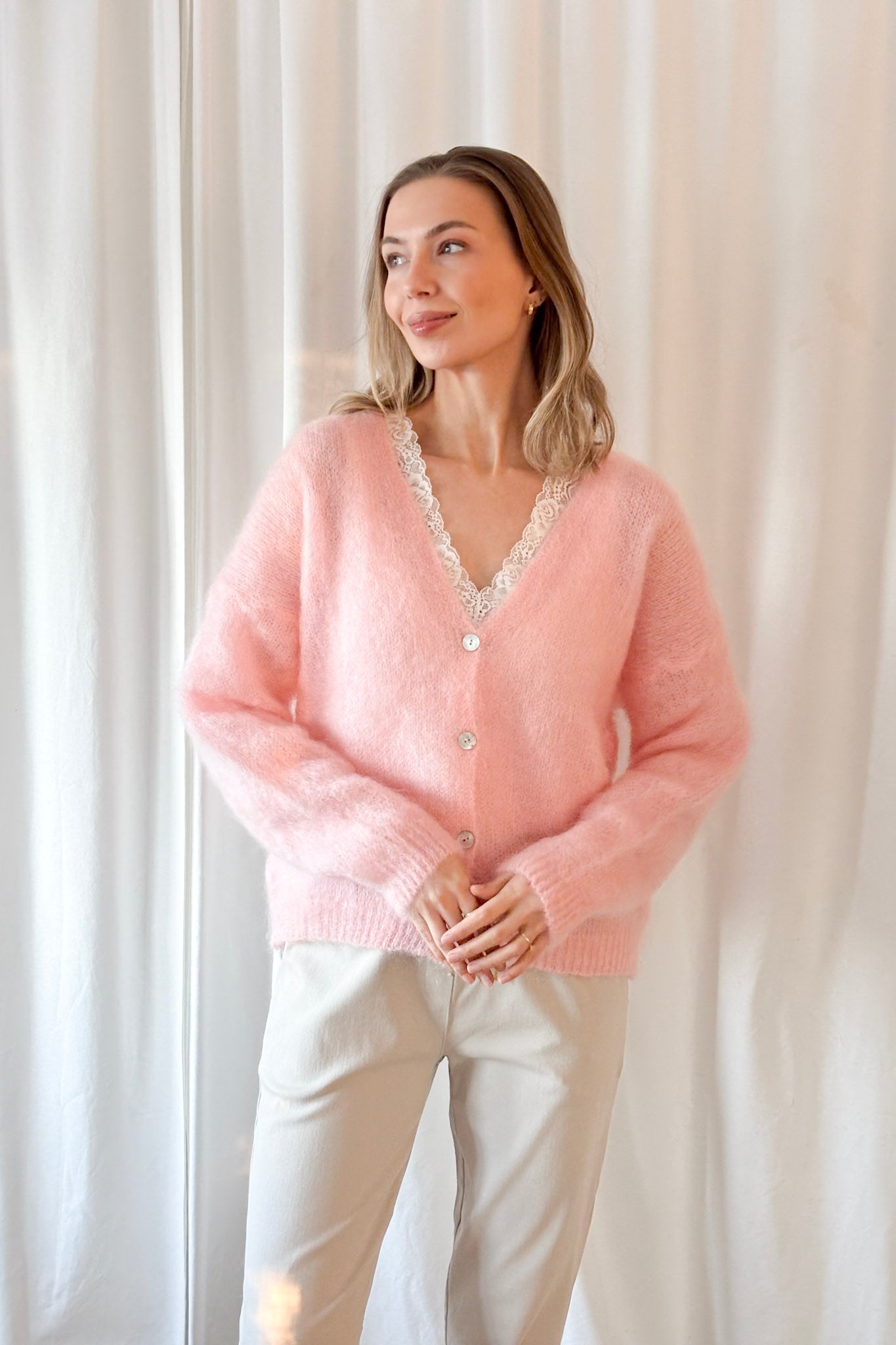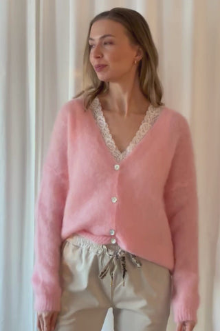 A luxurious kid mohair cardigan with a V-neckline and beautiful mother-of-pearl buttons. A timeless and elegant design with a soft, stretchy knit that feels wonderful against the skin.