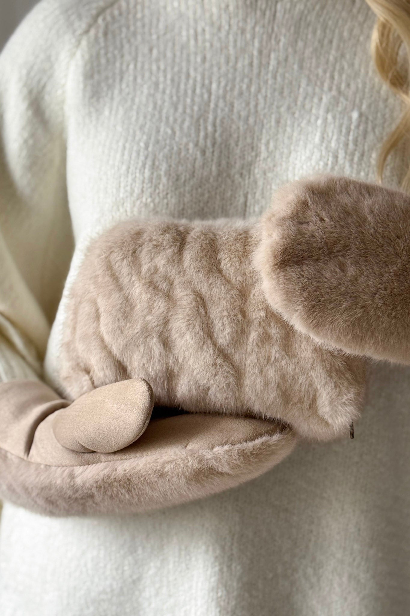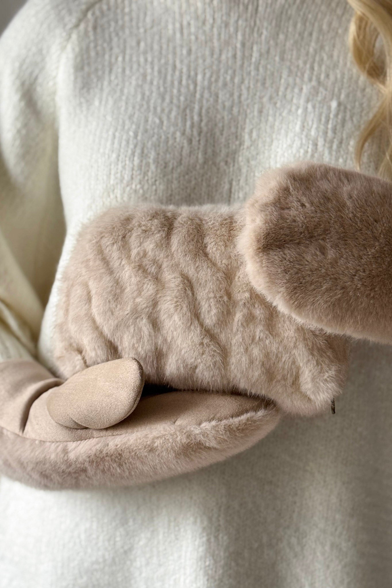 A wonderfully fluffy and soft faux fur bag. The bag closes with a zipper.