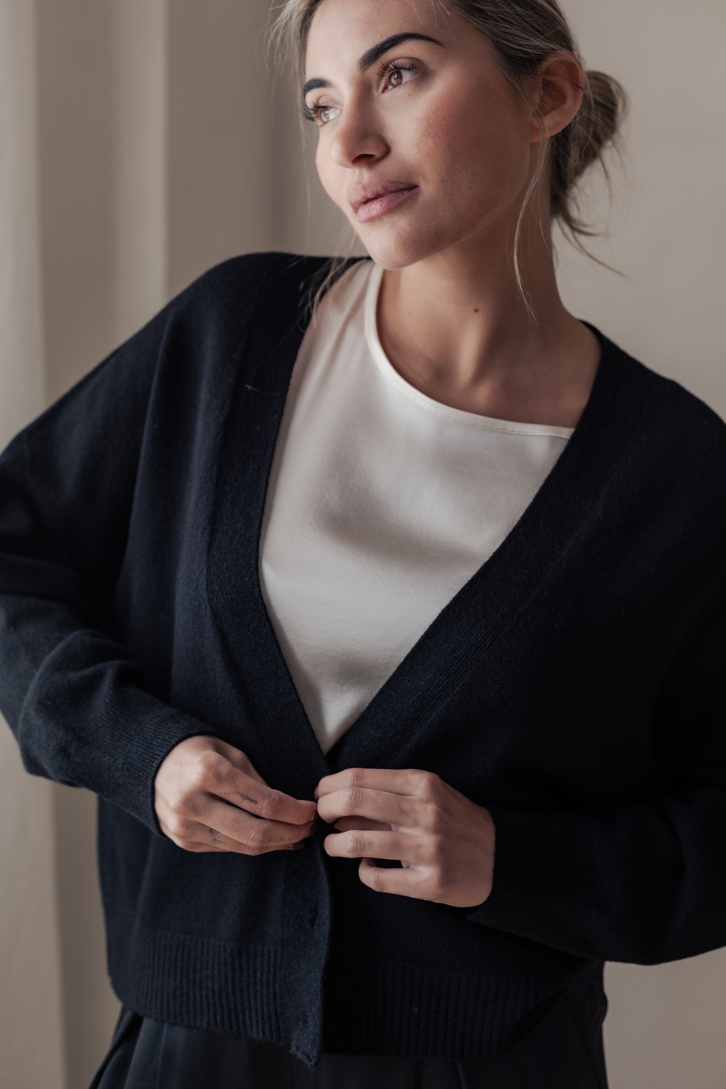 Incredibly luxurious, stretchy short-length cardigan with beautiful front buttoning. Light ribbed details at the cuffs and hem add structure. The whole piece is elevated by a special viscose-blend knit material that feels soft and lightweight against the skin.