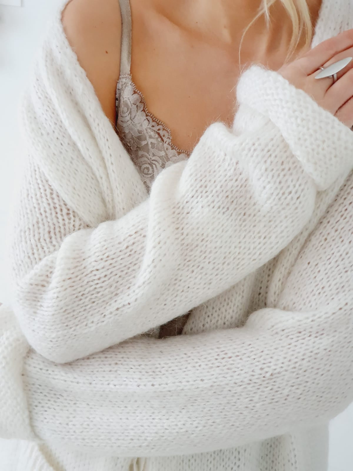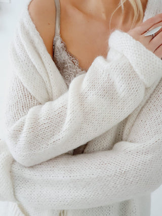 A long and soft bestseller, a sensual and airy cardigan made from a mohair blend. Turned-in, deliberately oversize relaxed cuffs.