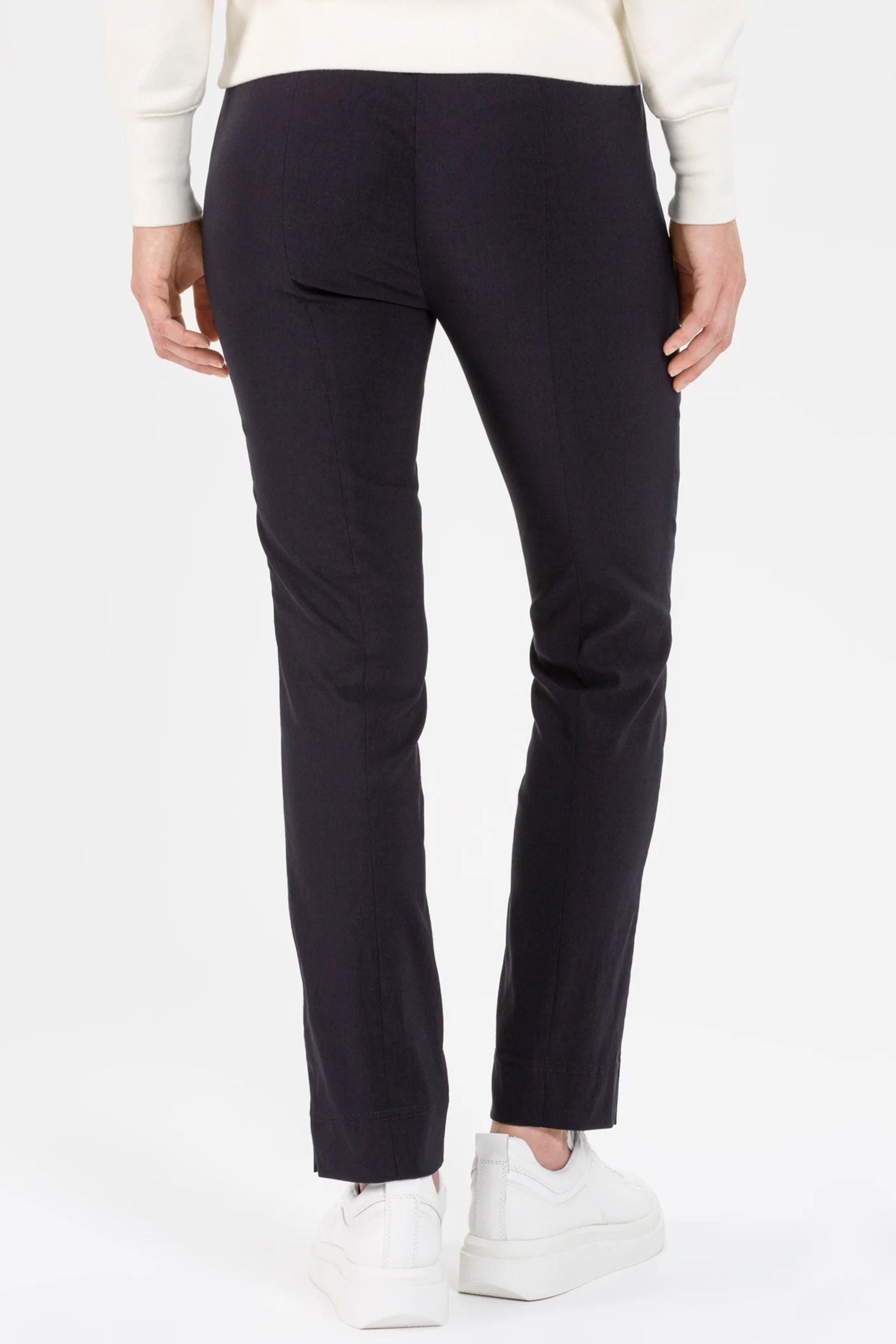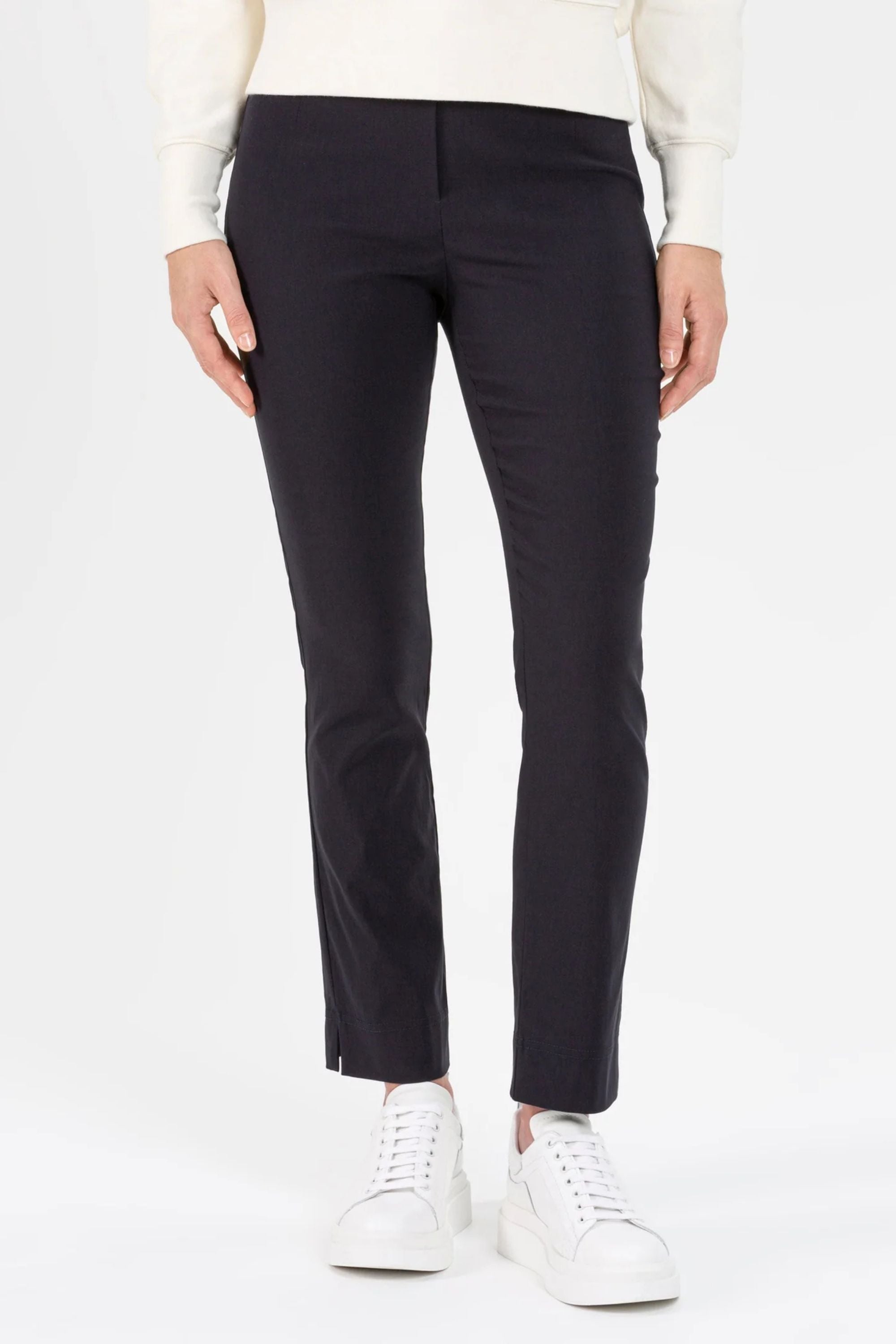 Ina bestseller stretch trousers are designed with room for the tummy, hips, and thighs, making them a flattering choice for all body types. These pull-on trousers feature no zippers or buttons, and the waistband rises comfortably high for a smooth and supportive fit. The classic design has a slightly relaxed leg with side slits for ease and movement.