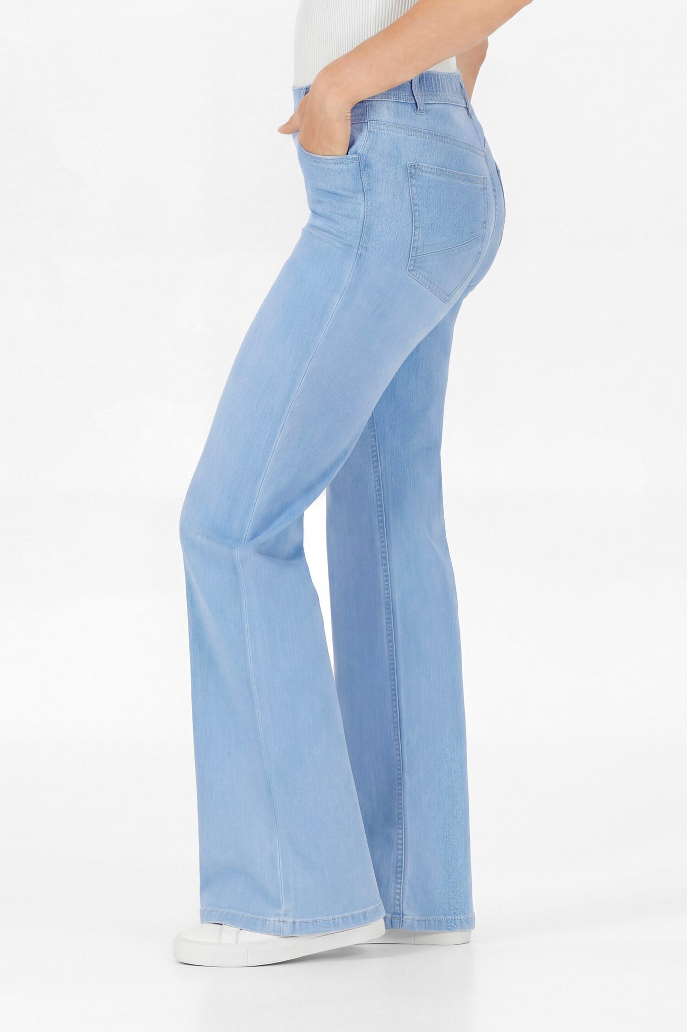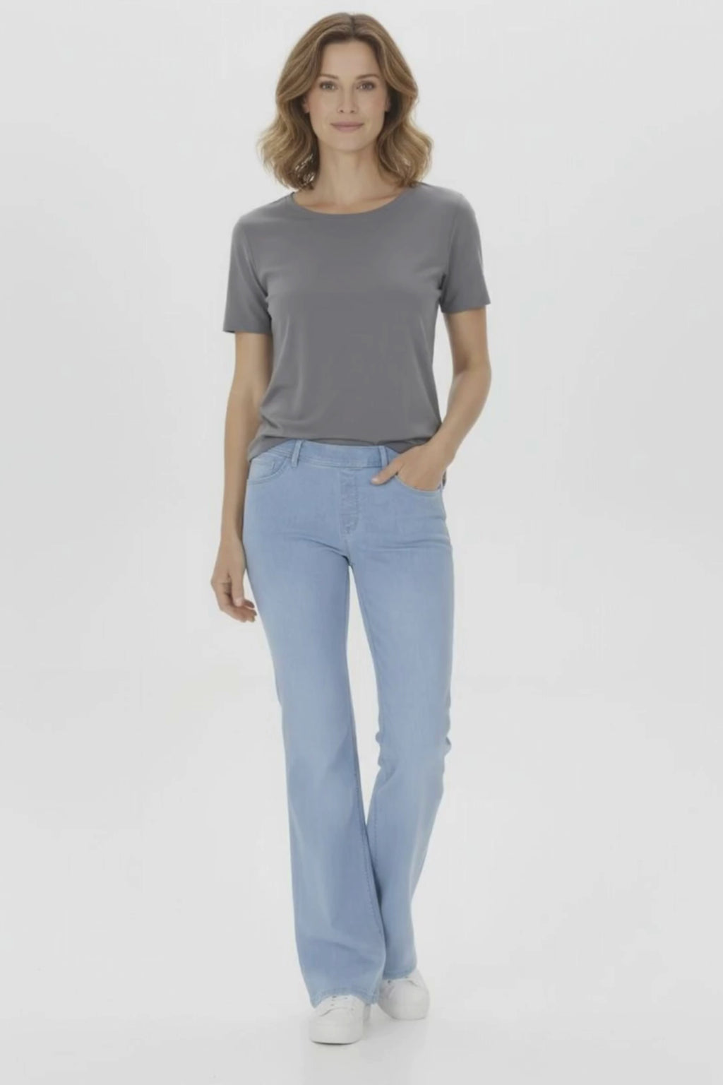 Melli jeans are 5-pocket trousers with flared legs and an elastic waistband. The power stretch denim ensures excellent comfort and a flattering fit. The straight cut with a flared leg and slightly raised waist creates a sleek and feminine silhouette.
