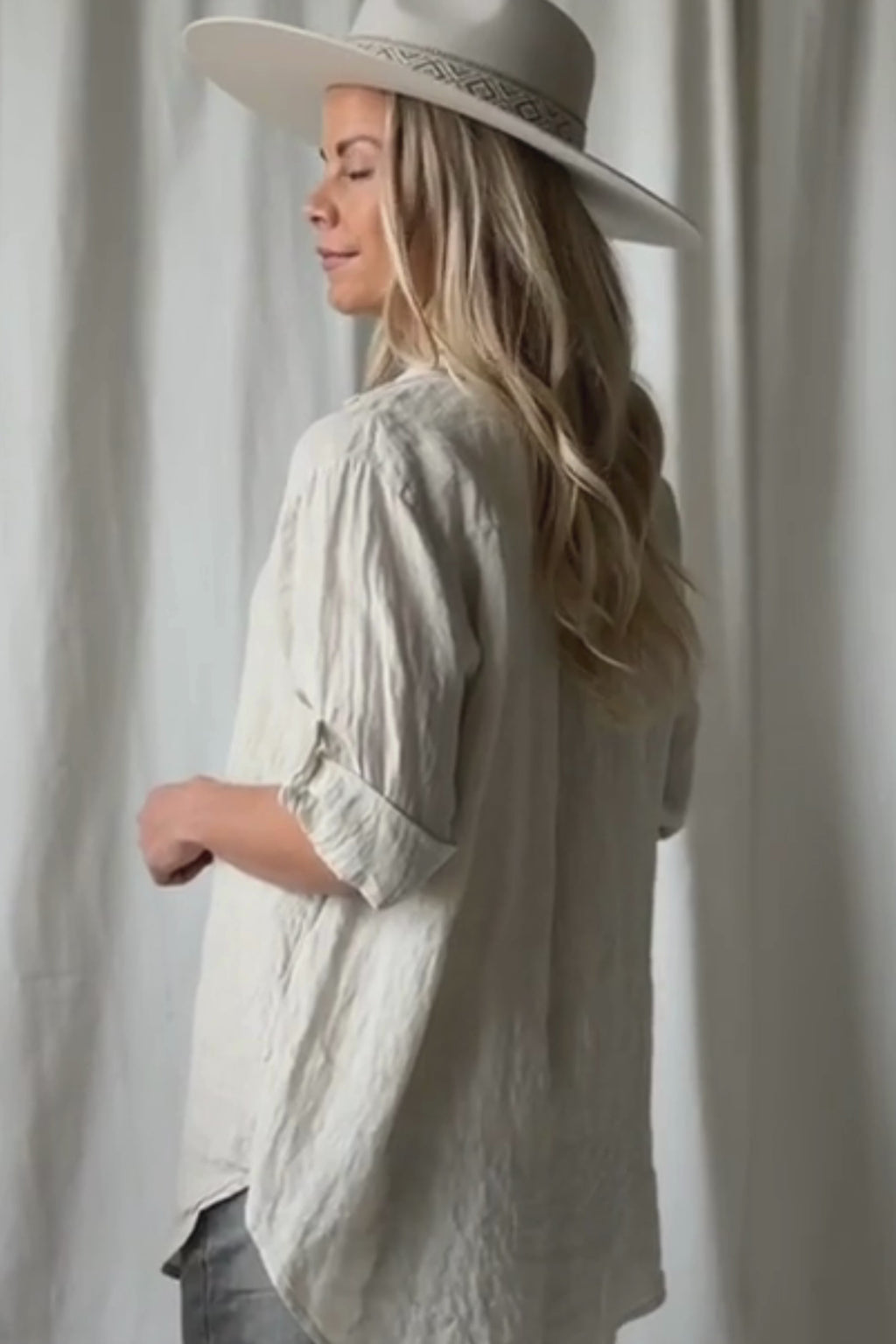 A timeless and effortlessly stylish longer, slimmer-fit linen shirt, perfect for everyday wear and relaxed occasions. The lightweight, breathable linen feels comfortable against the skin and drapes beautifully. Classic mother-of-pearl buttons on the front and sleeves complete the look. The sleeves reach mid-arm when worn closed, and when unbuttoned they fall to a 3/4 length, adding versatility to the design.