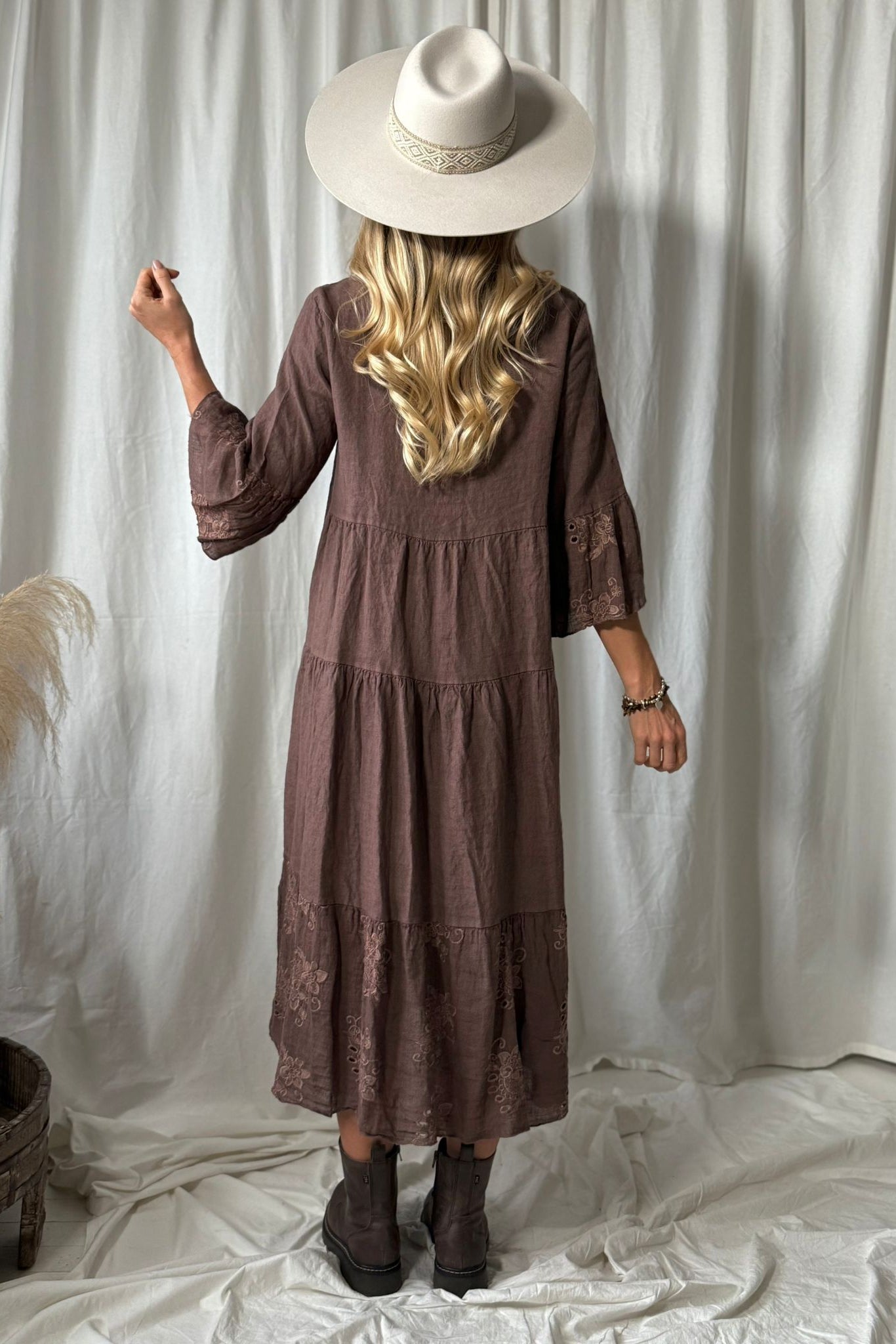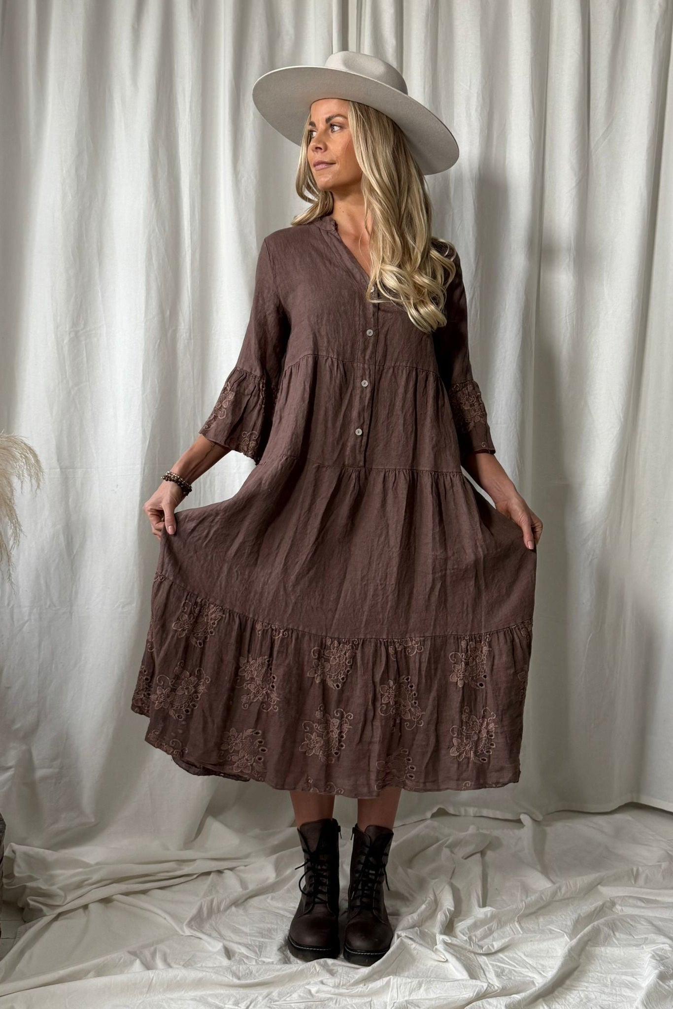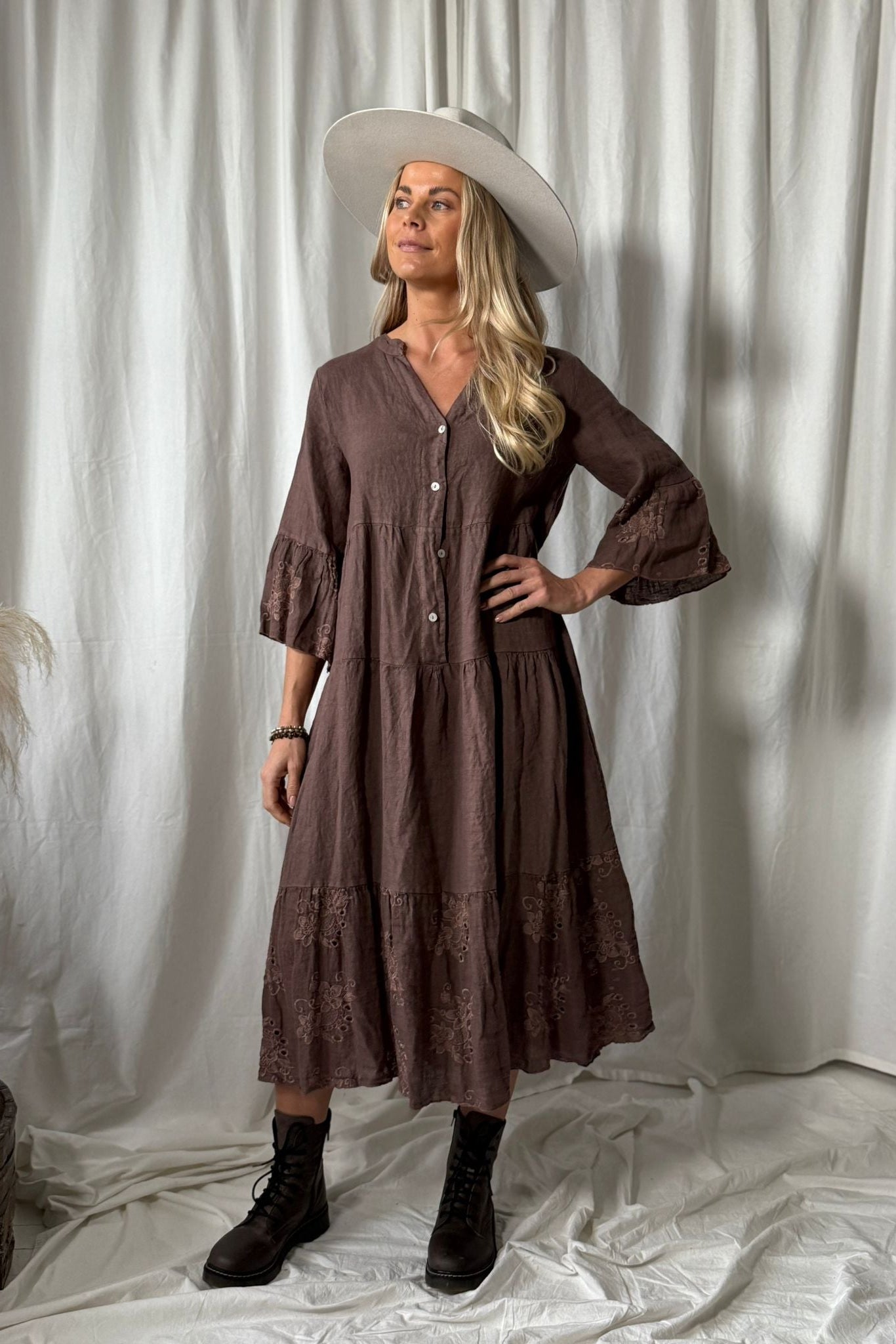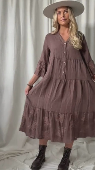 Enchanting A-line linen dress featuring a stand-up collar and V-neckline.