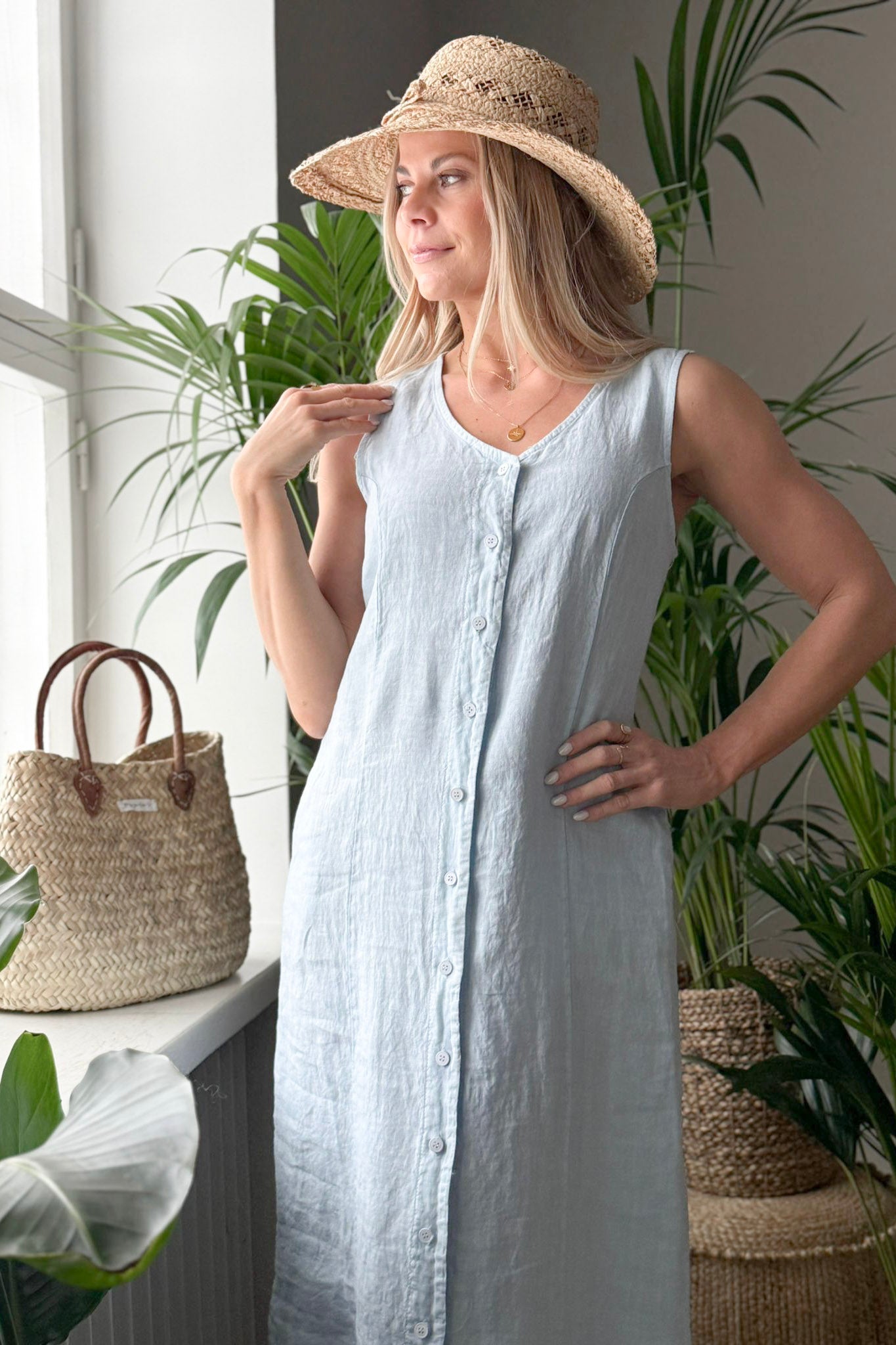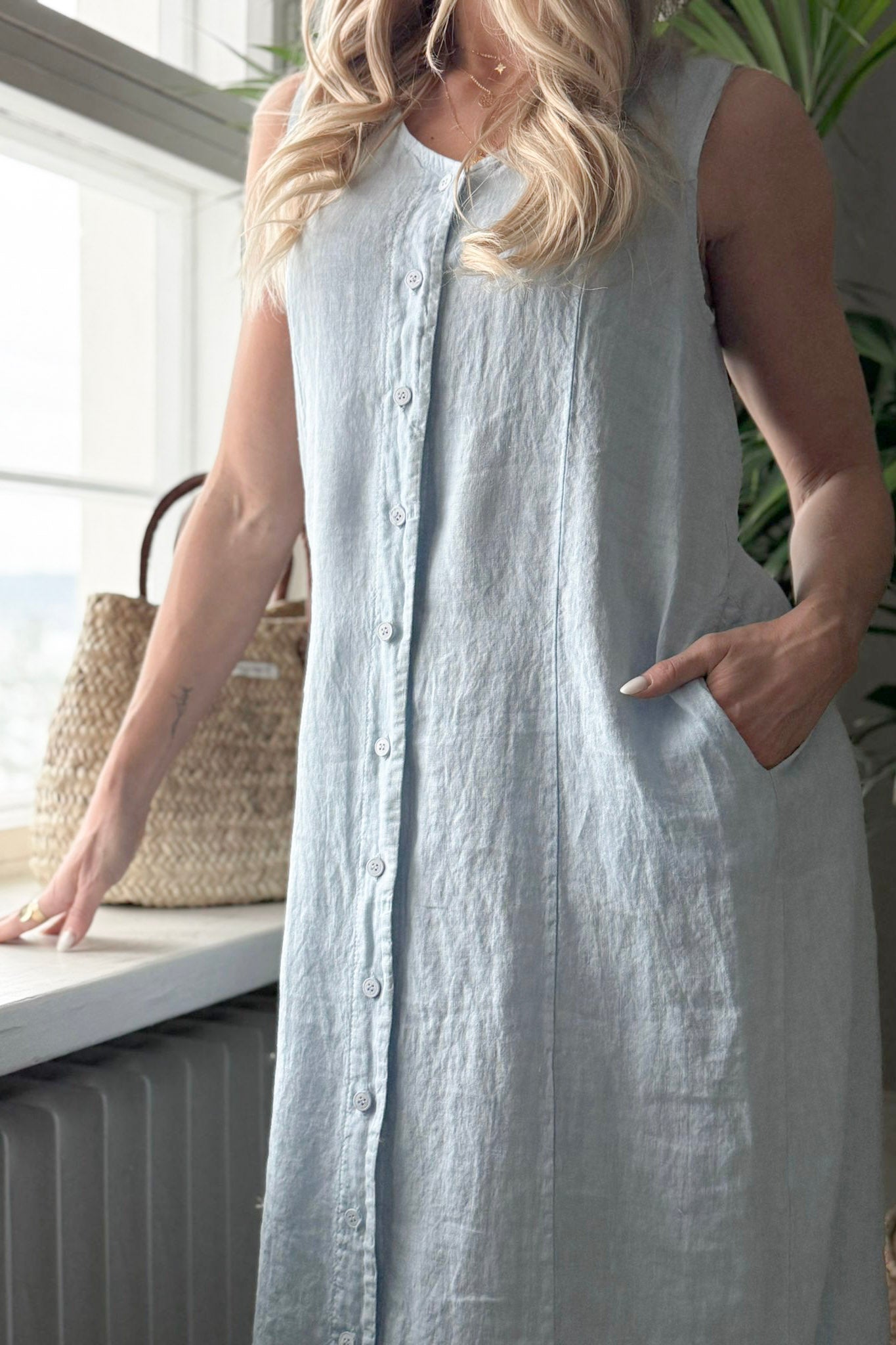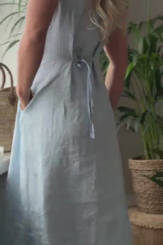 Beautiful A-line linen dress featuring a button-down front and adjustable drawstrings at the back to accentuate the waist. The breathable, lightweight linen fabric drapes softly and feels comfortable to wear. Side slits add ease of movement, while practical side pockets complete this timeless design, making it suitable for both everyday wear and more dressed-up occasions.