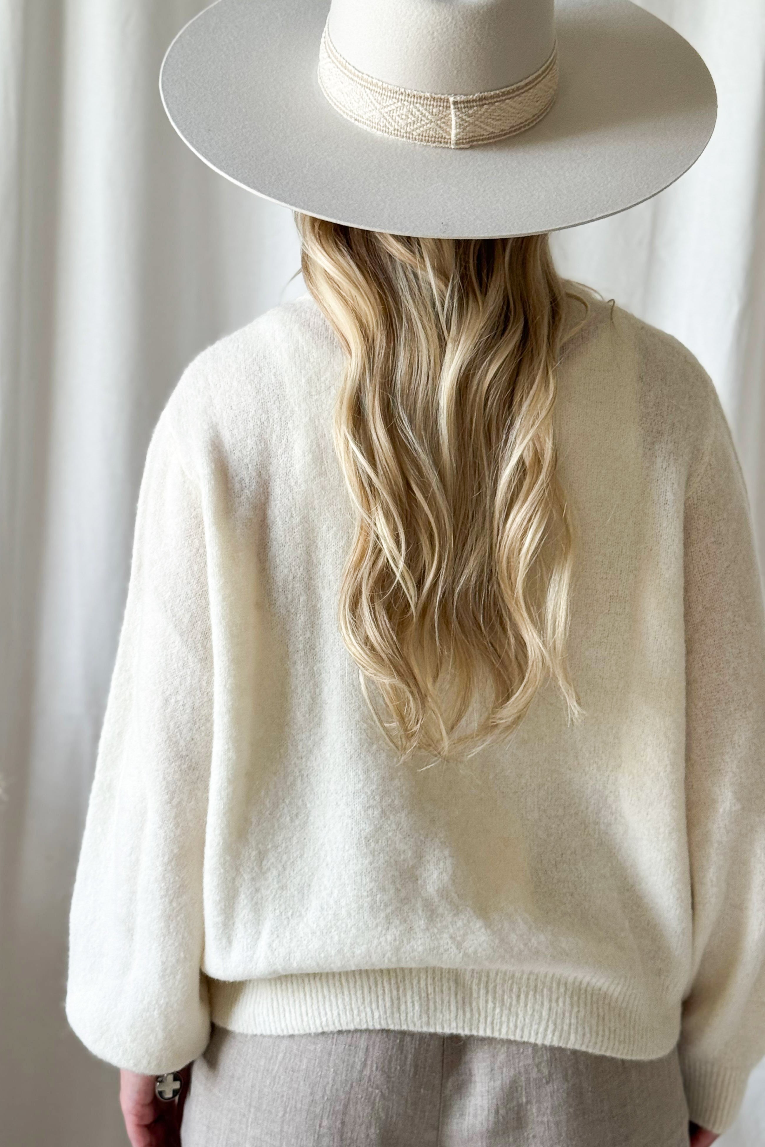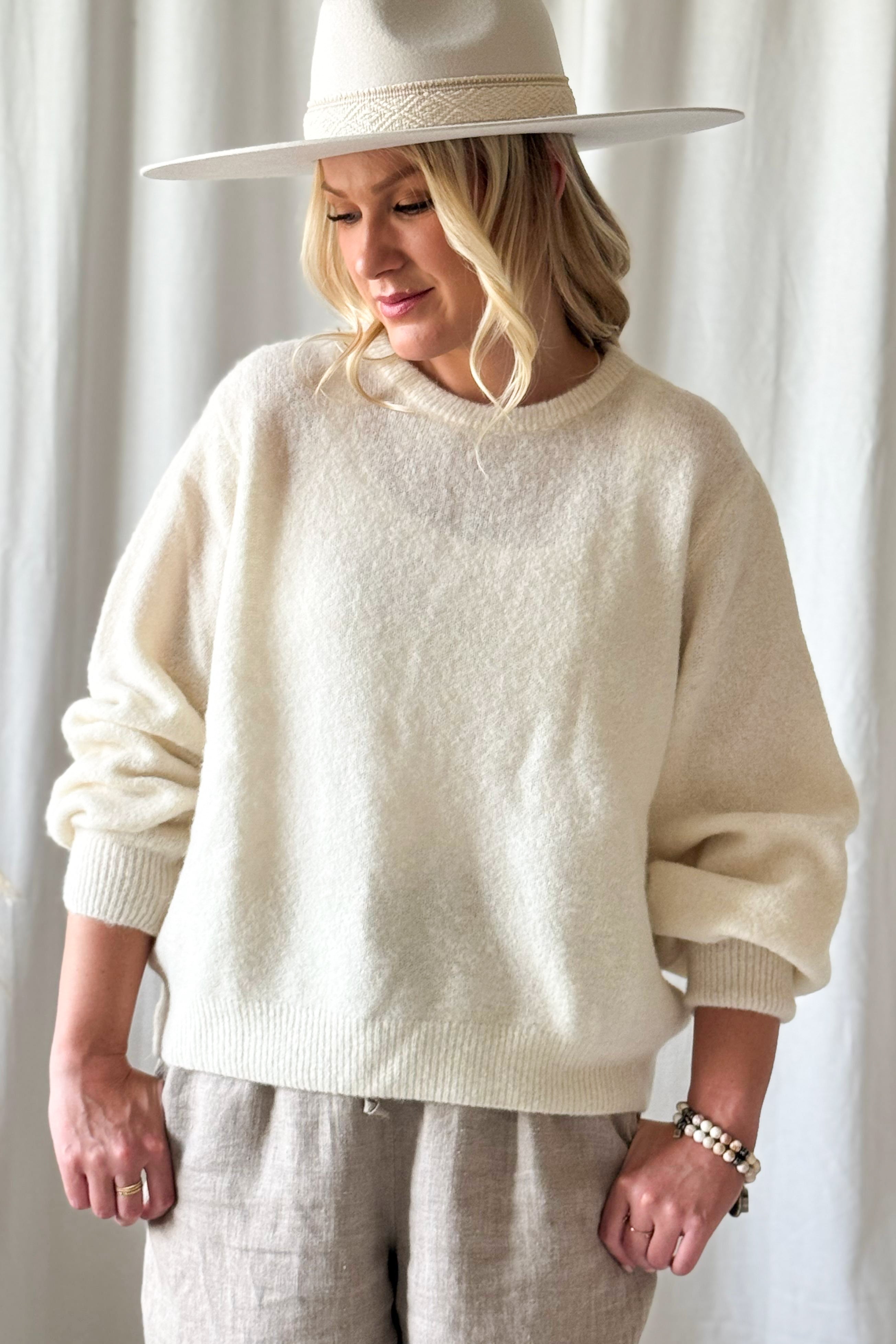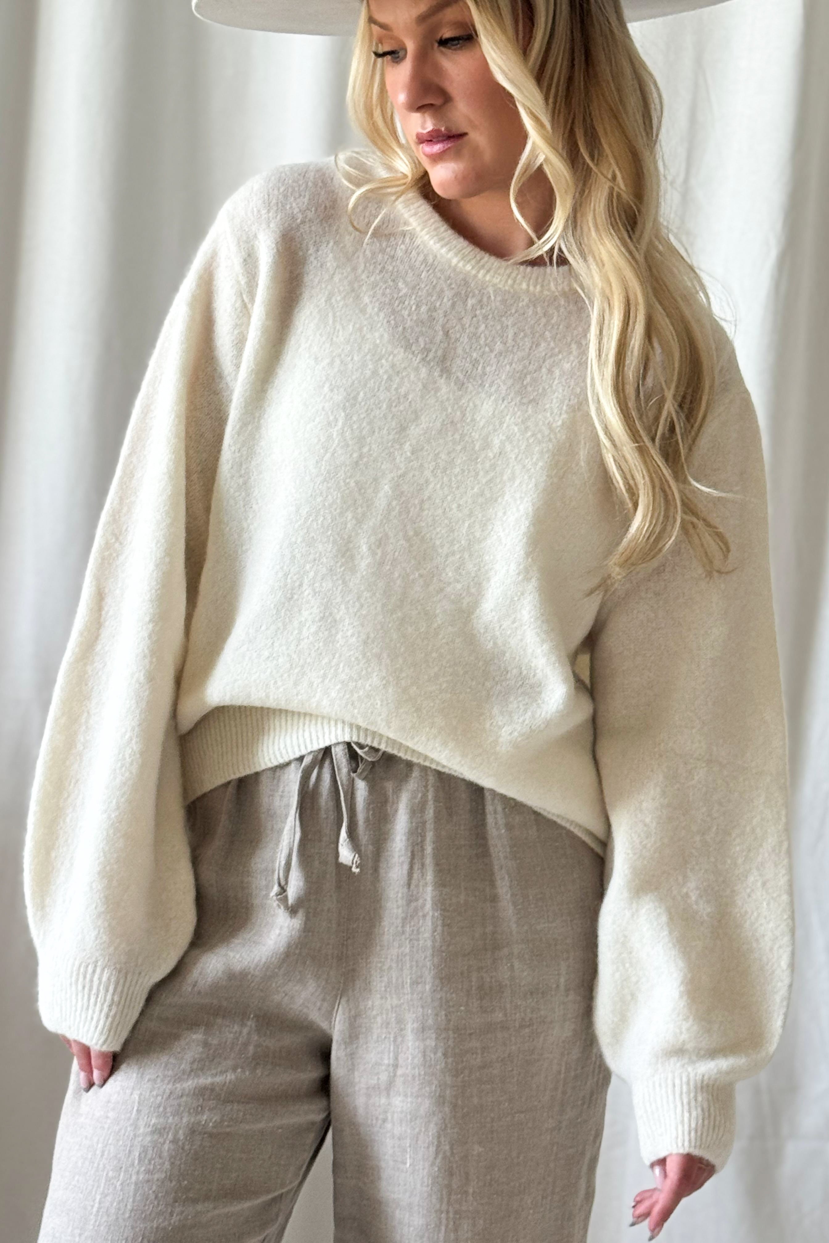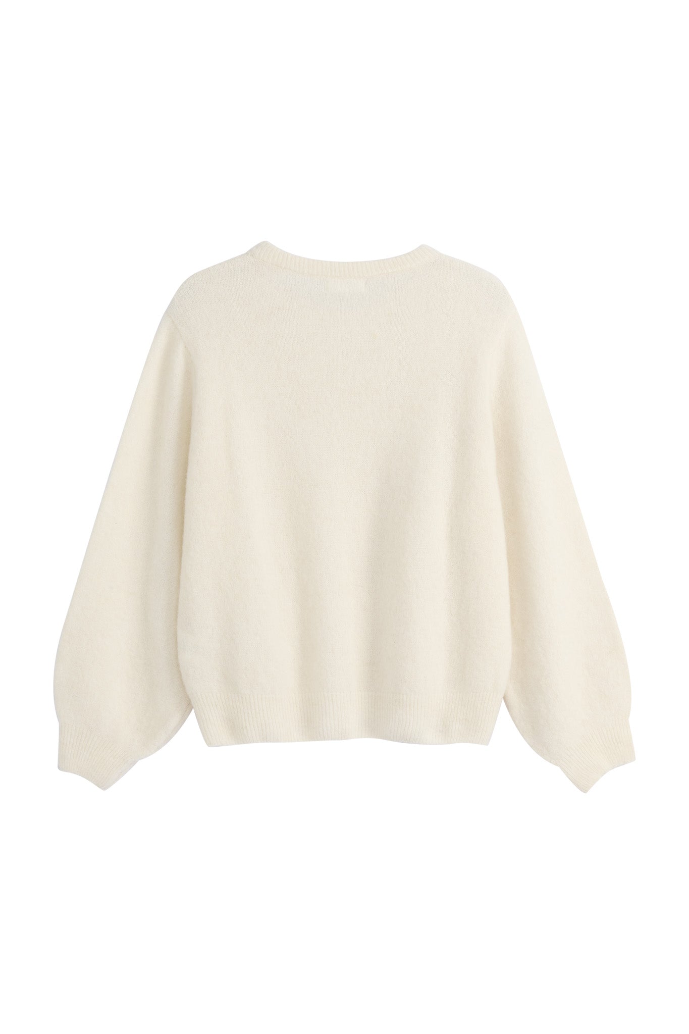 Luxuriously soft knit with a round neckline and light ribbing at the cuffs and hem. The sleeves have a subtle puffed shape.