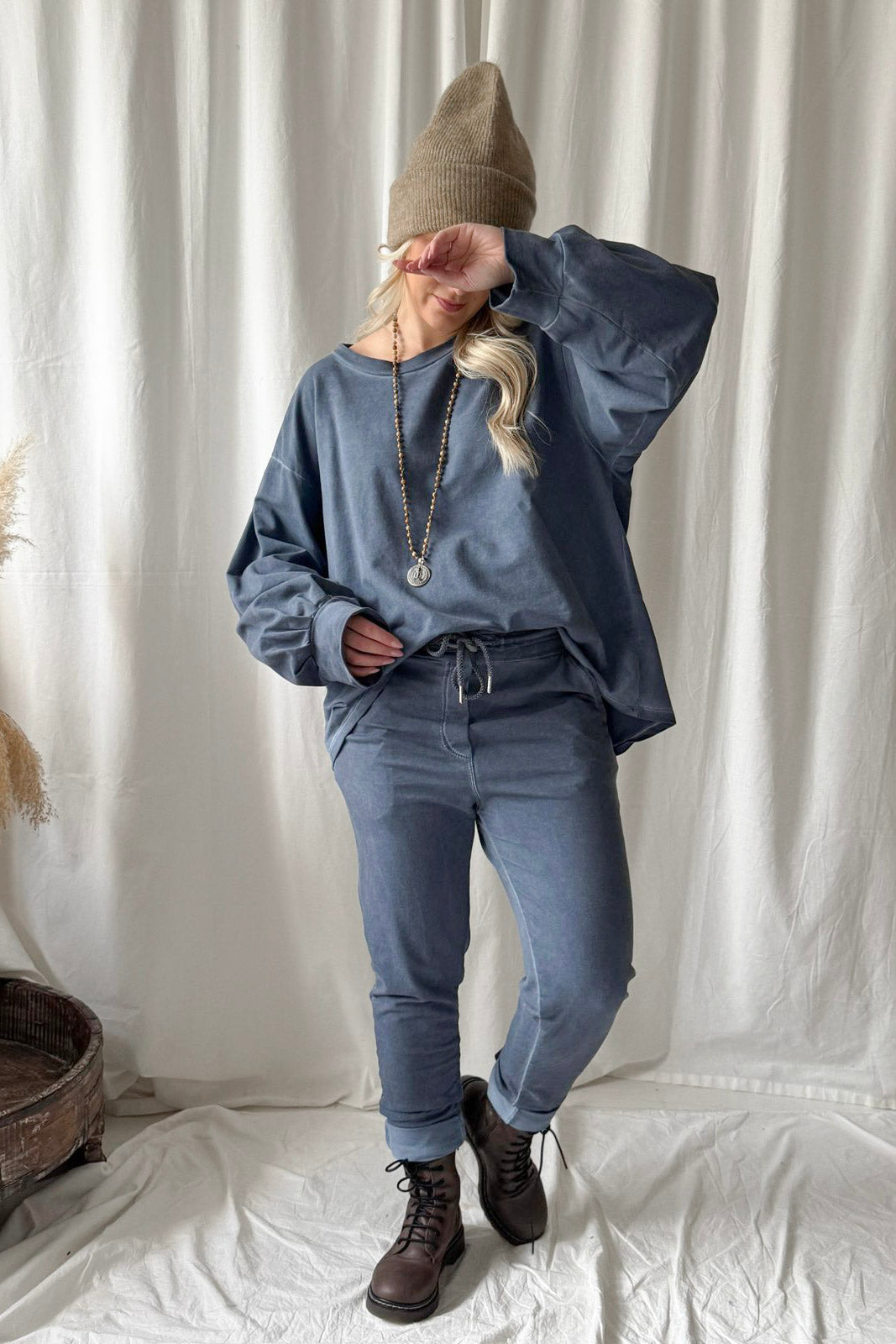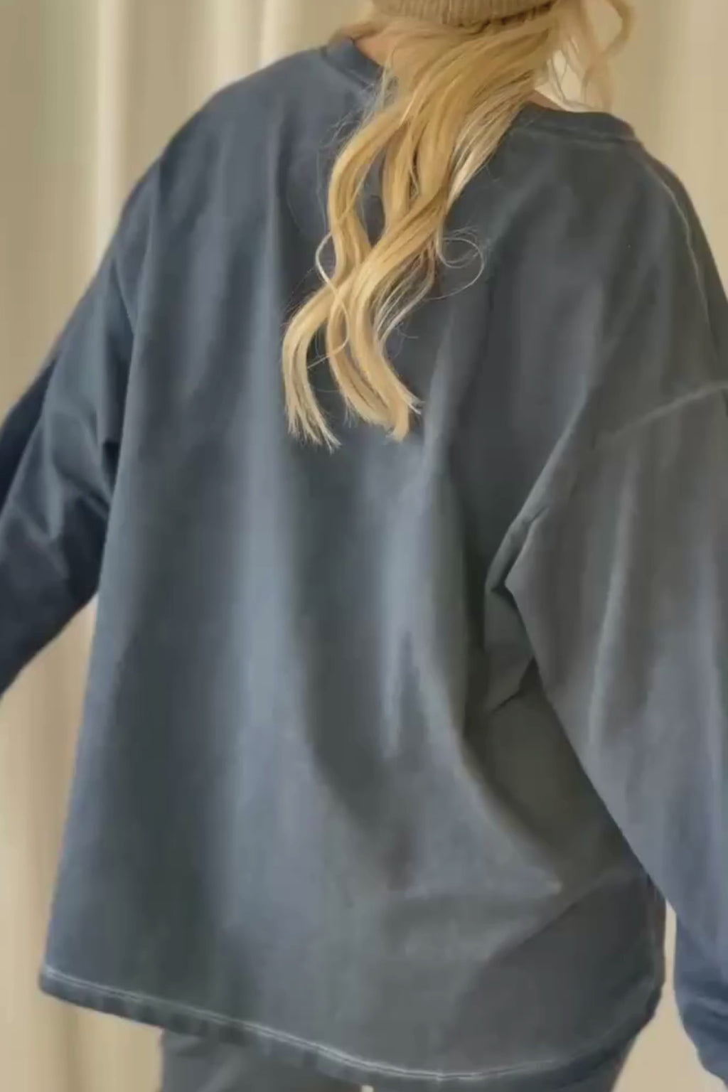 This sweatshirt with a round neckline is designed to bring softness, comfort, and a relaxed style to everyday wear. The material feels pleasant against the skin. A slightly shorter front and longer back create a relaxed, draping silhouette that is easy to pair with different bottoms. Loose sleeves, dropped shoulders, and gathered sleeve details complete the effortless and modern look.