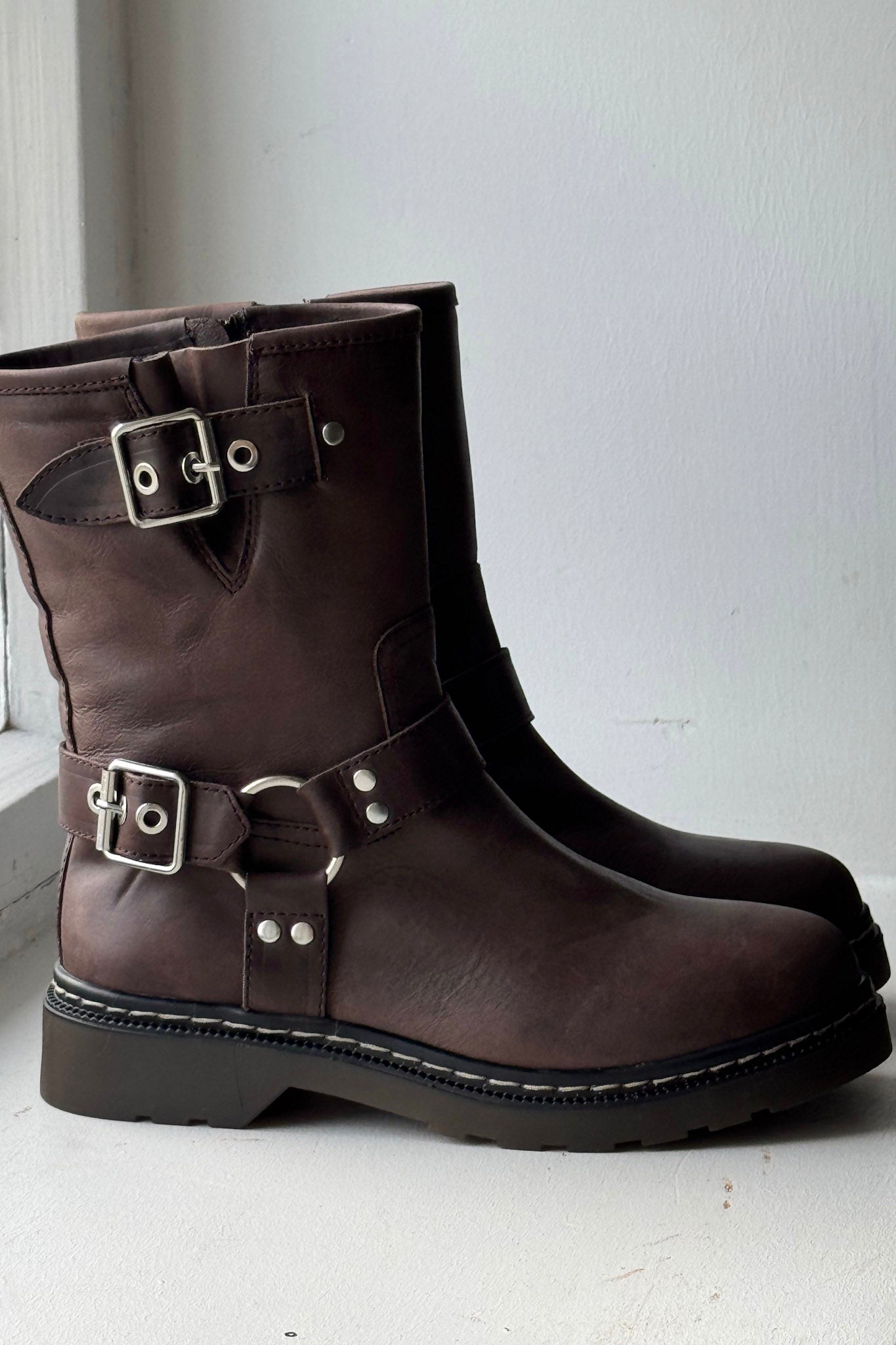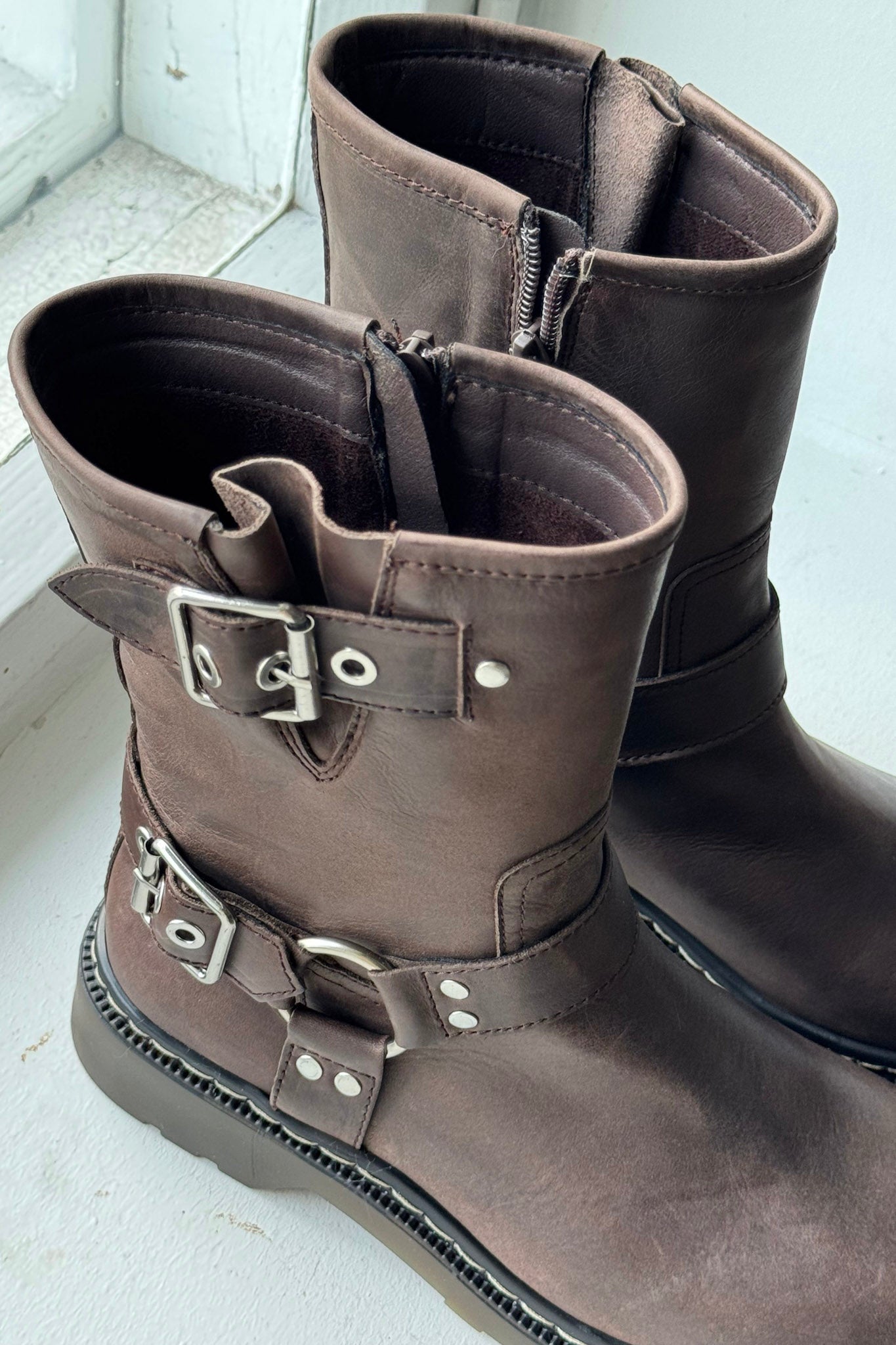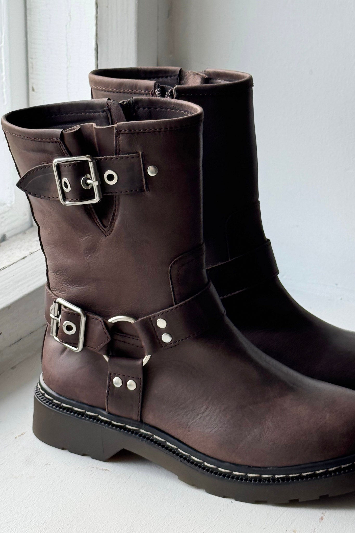 Stylish biker boots with buckle decorations. The boots have a low sole and a mid-length shaft. Zipper closure. Warm textile lining inside.