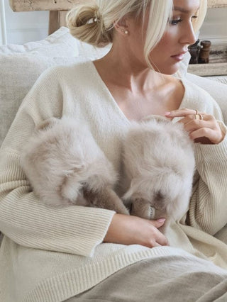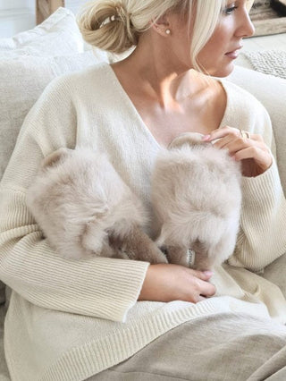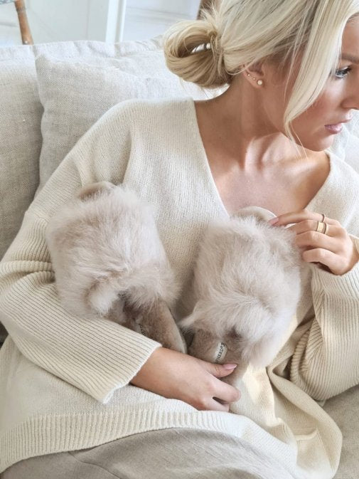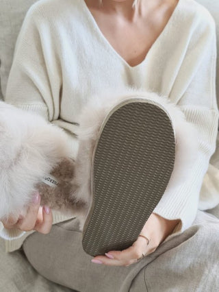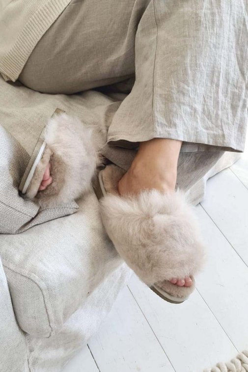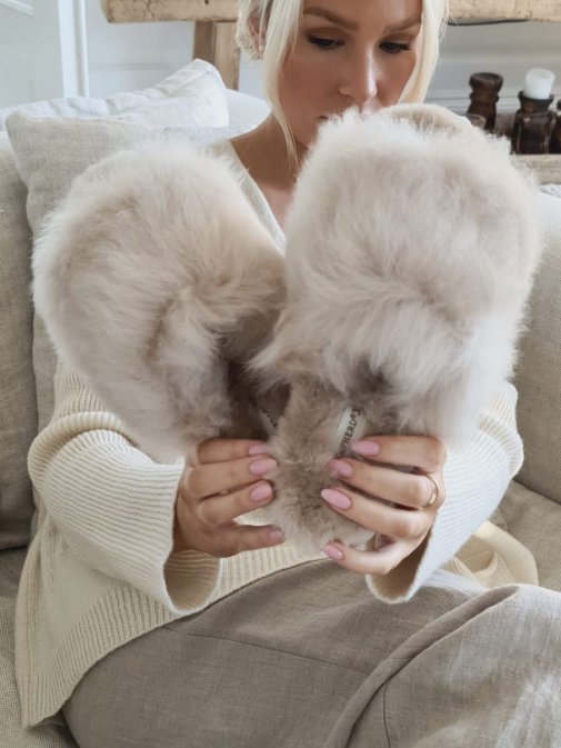 Soft slip-on sheepskin slippers. The slippers have a wide collar made of long-haired sheepskin. The outer sole is made of EVA.