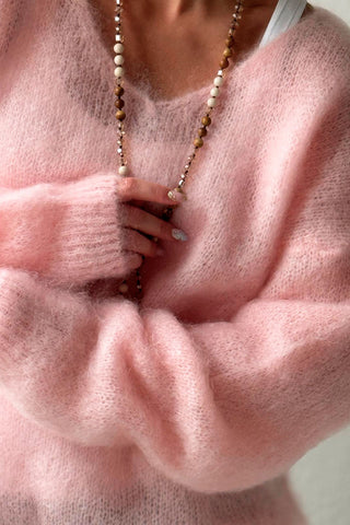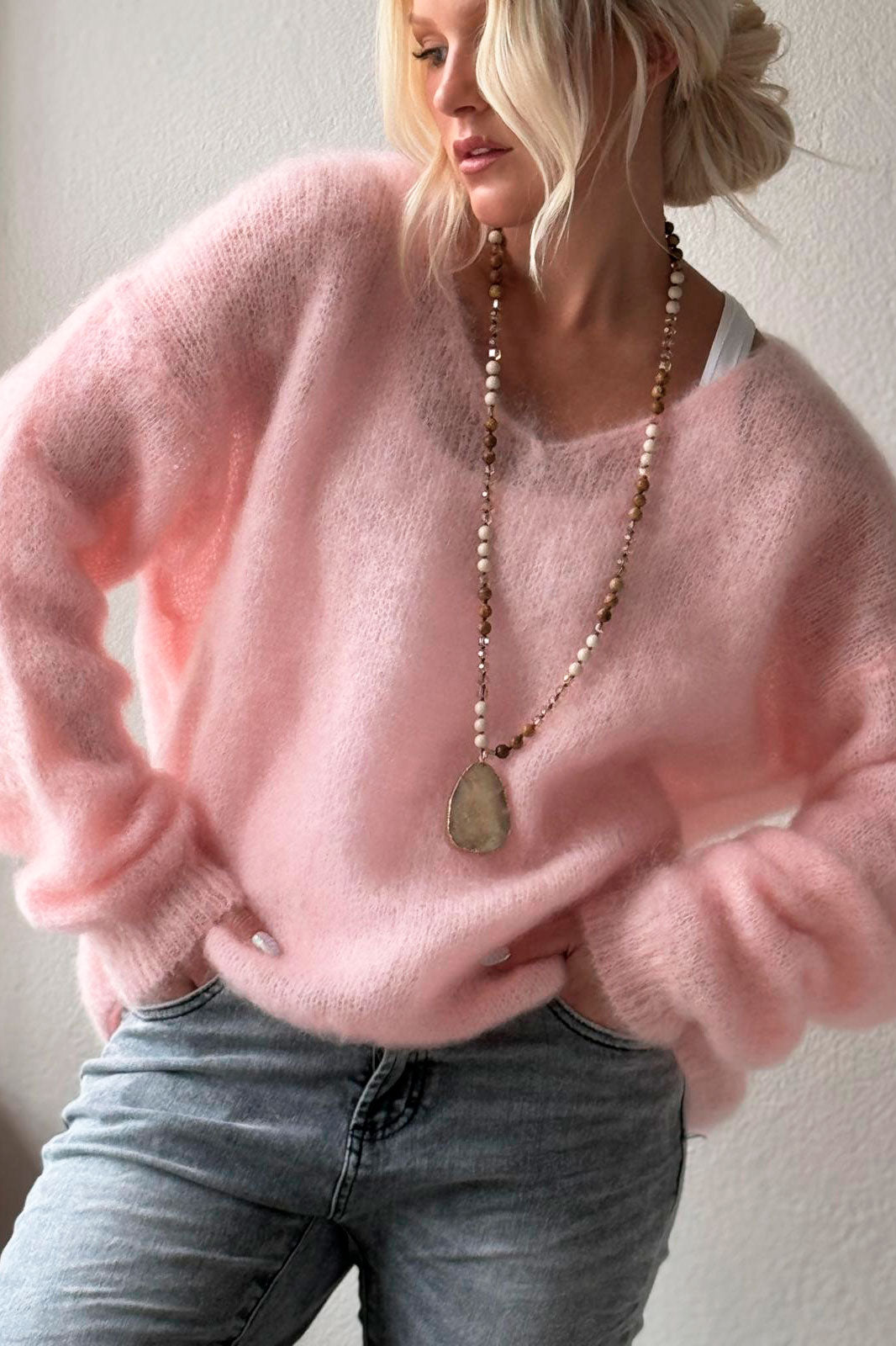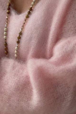 Wonderfully plush and luxurious Kid mohair sweater with a v-neckline and light elastic on the hem and cuffs. Dropped shoulder line. The sweater has a fluffy and plush feel.
