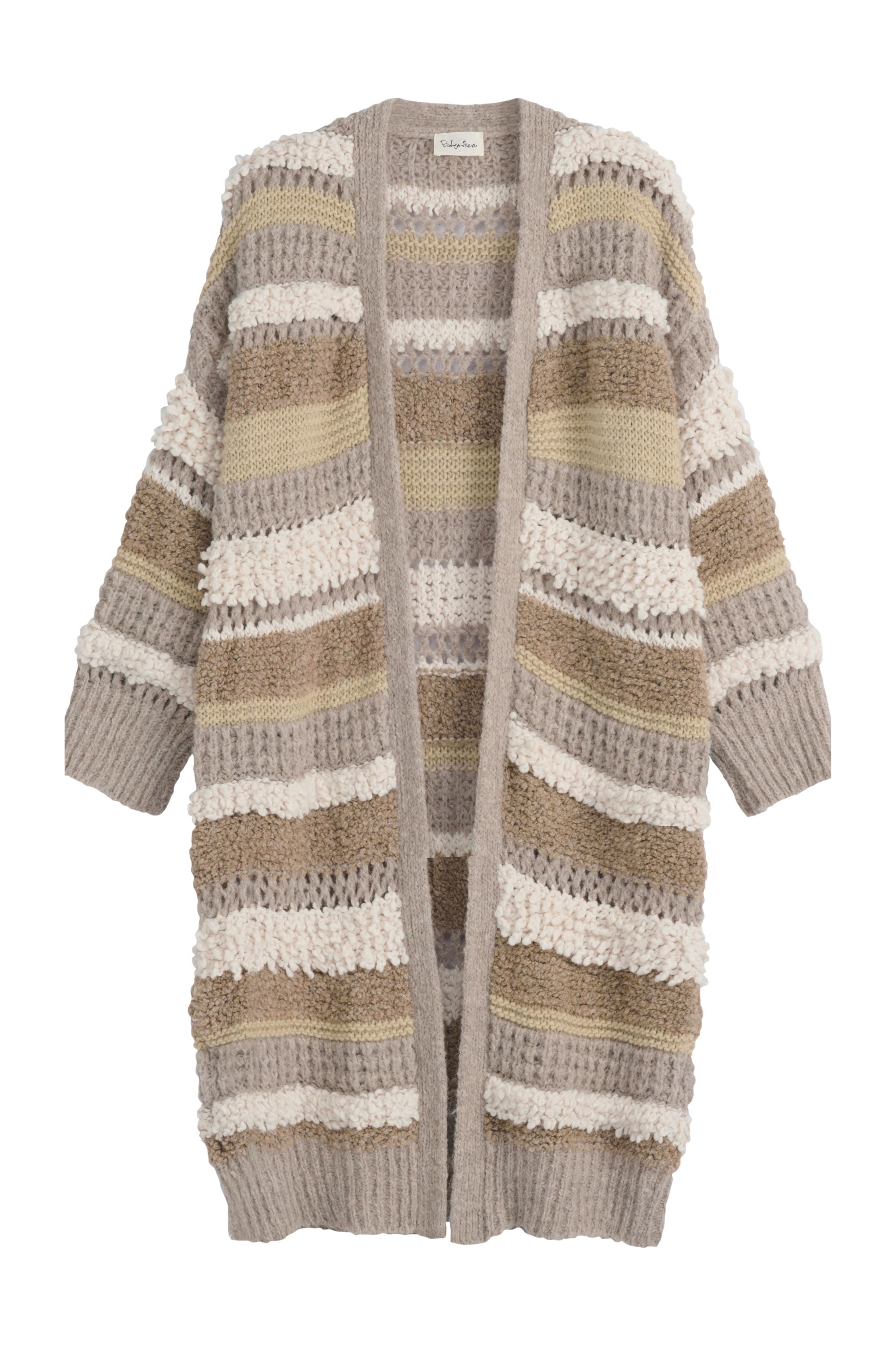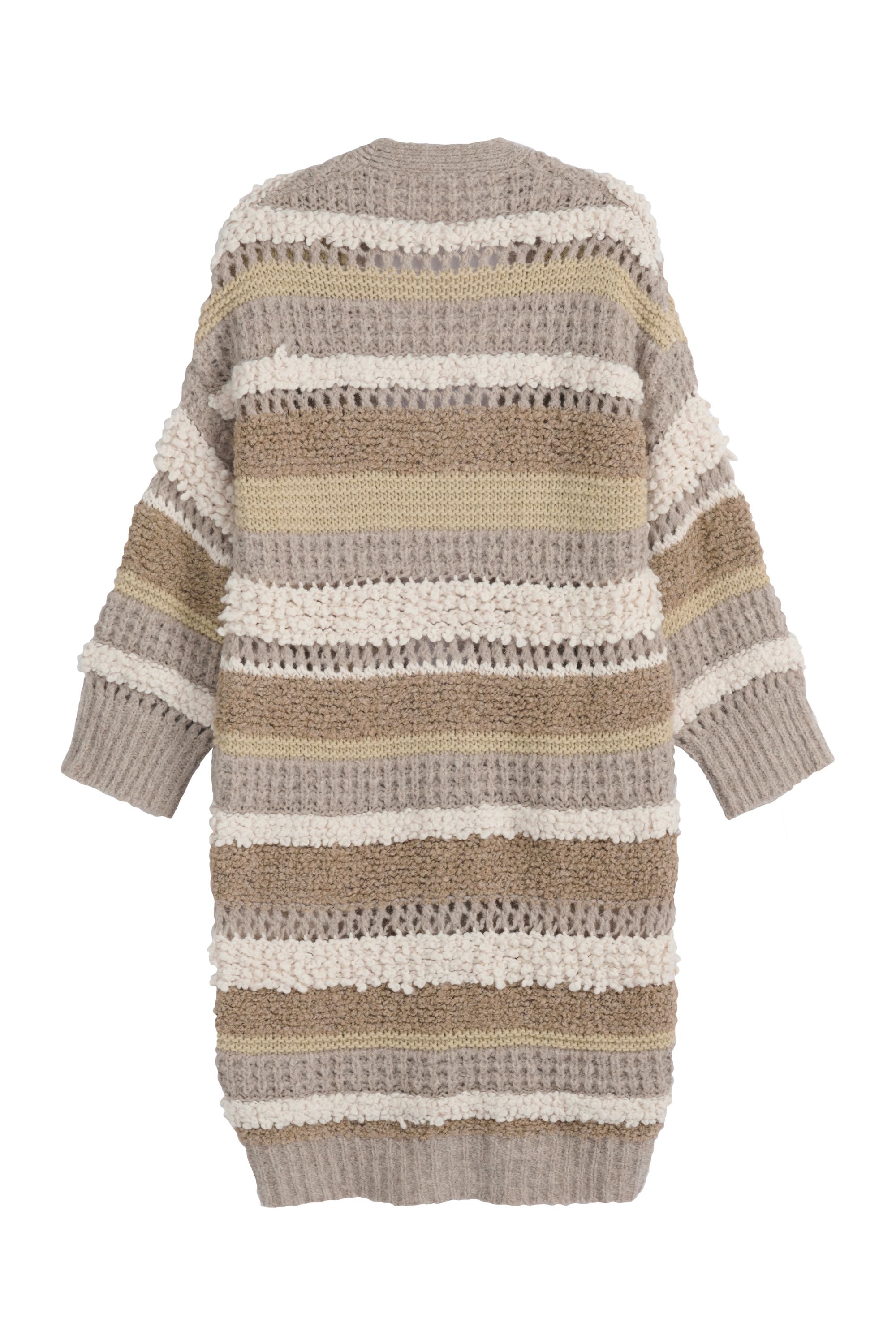 A charmingly relaxed, striped cardigan in a chunky knit with an authentic, hand-knitted feel. Wide ribbed trim at cuffs and hem. No buttoning.