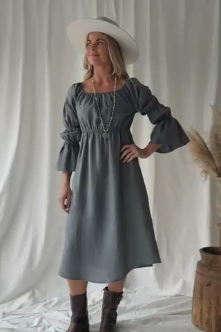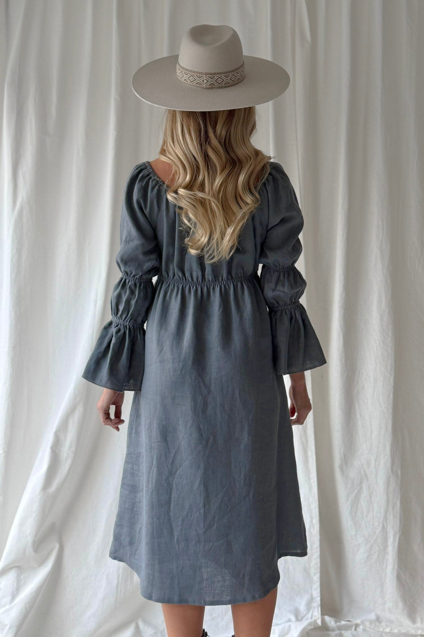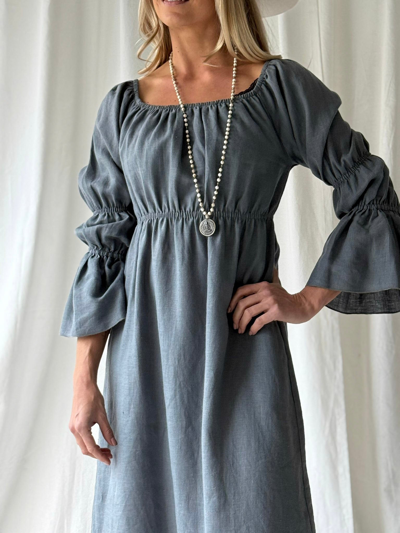 A stunning dress in BYPIAS linen. Elastic gathers at the neckline, waist and sleeves. The neckline can be pulled over or under the shoulders.
