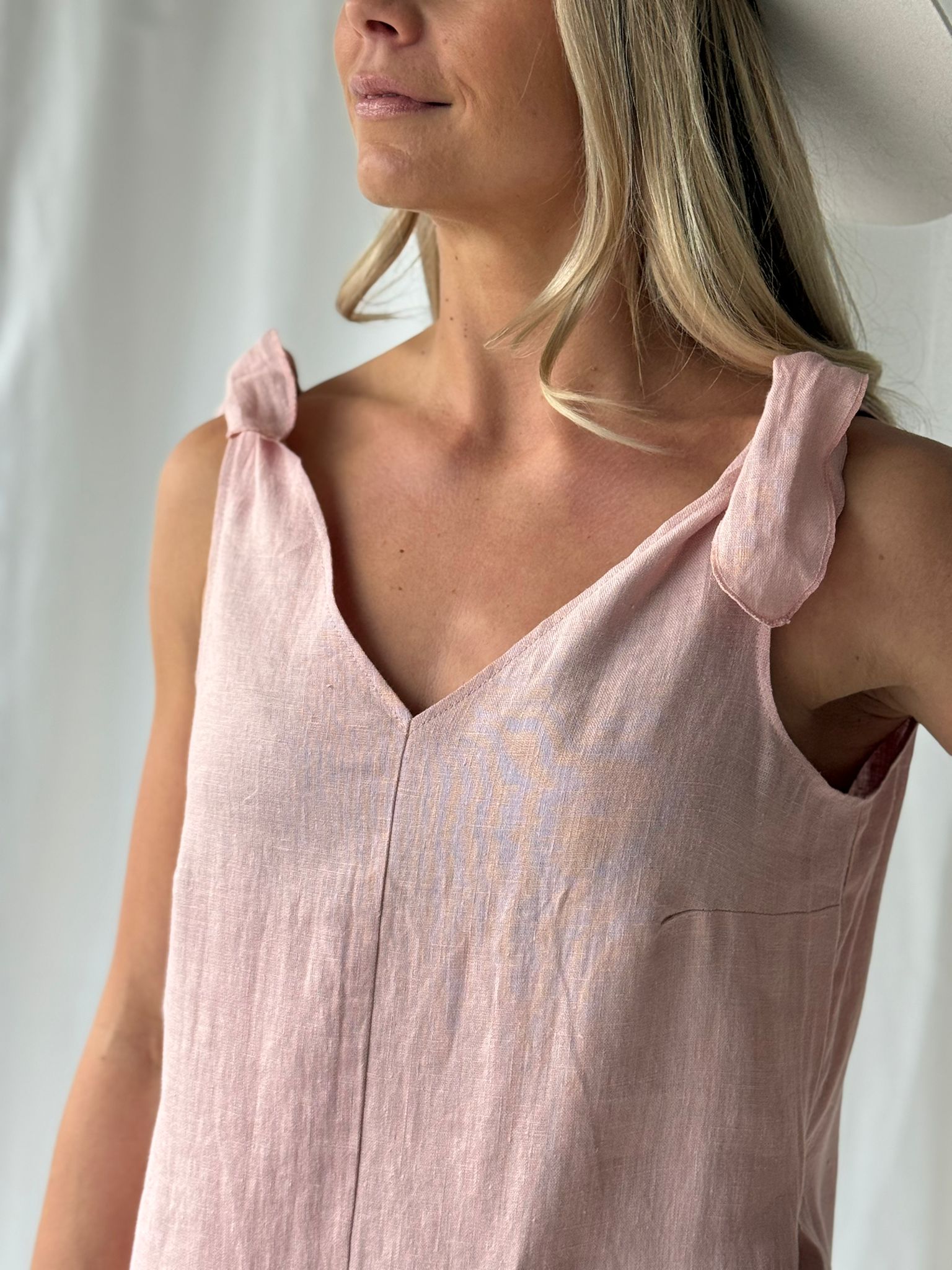 An amazing dress dream BYPIAS linen. Sturdy knotted shoulder straps, a classic flared silhouette and a flattering V-neckline make this dress a true wardrobe staple.