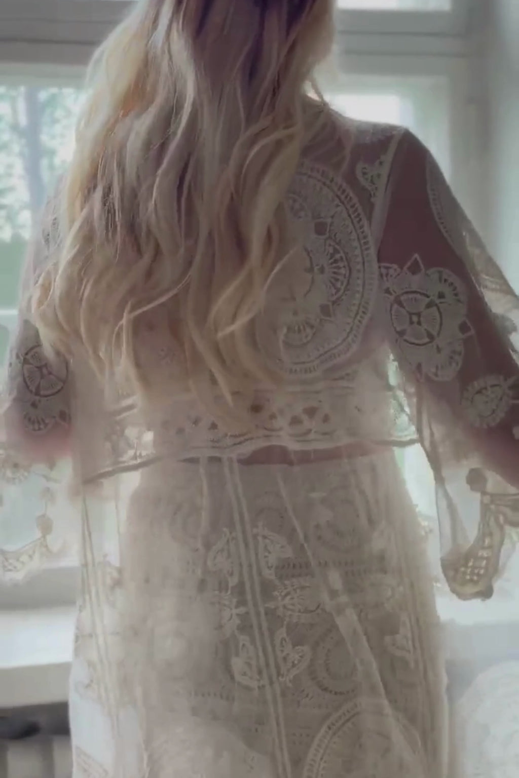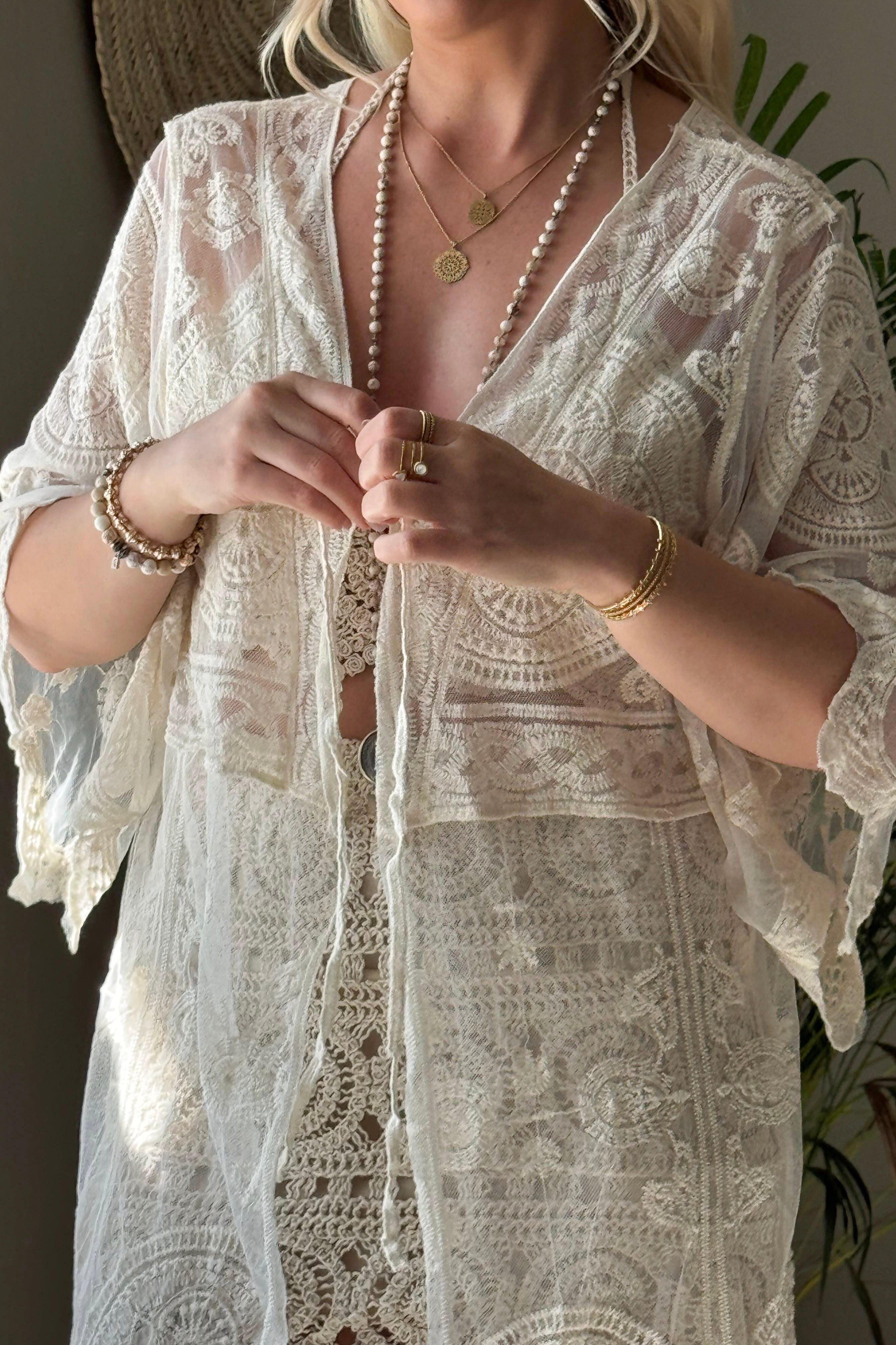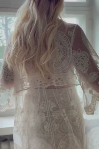 Super beautiful lace kimono from the Hanko Beach Pop-up collection. The lovely translucent lace fabric is perfect for the beach over a swimsuit and also for everyday wear with a linen dress or shorts. The kimono has a drawstring tie at the front. The lace figure may vary.