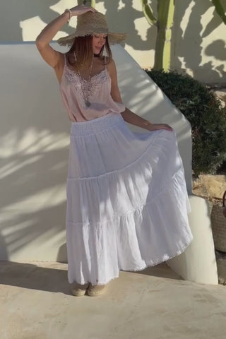 The skirt is made from lightweight and soft linen, which feels pleasant on the skin even on warm summer days. The high, smocked waistband ensures a comfortable and flattering fit, and the multi-layered hem adds a sense of airiness and bohemian elegance to the look. Small, refined seams run along the skirt as details, giving the piece a beautifully finished and detailed touch.