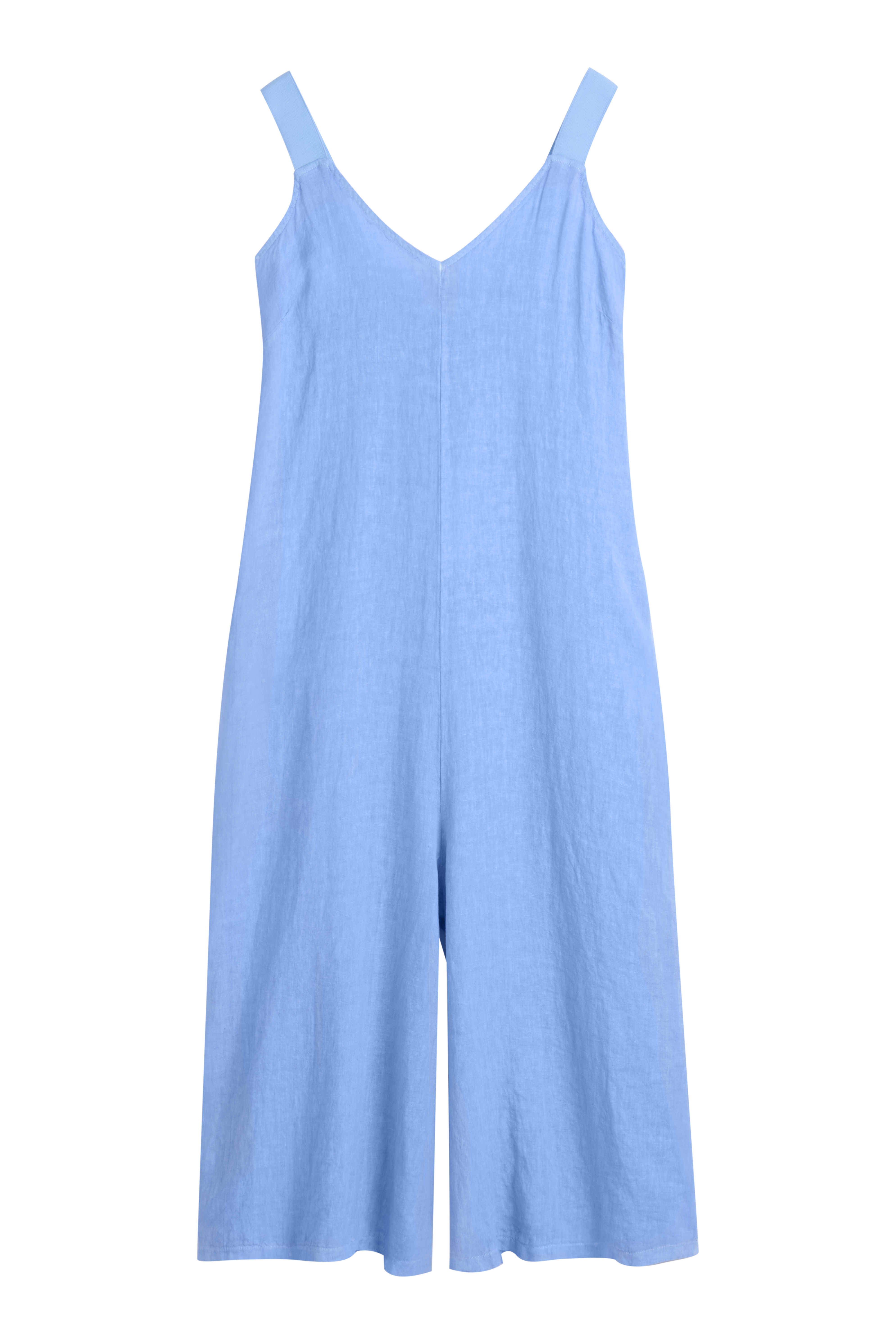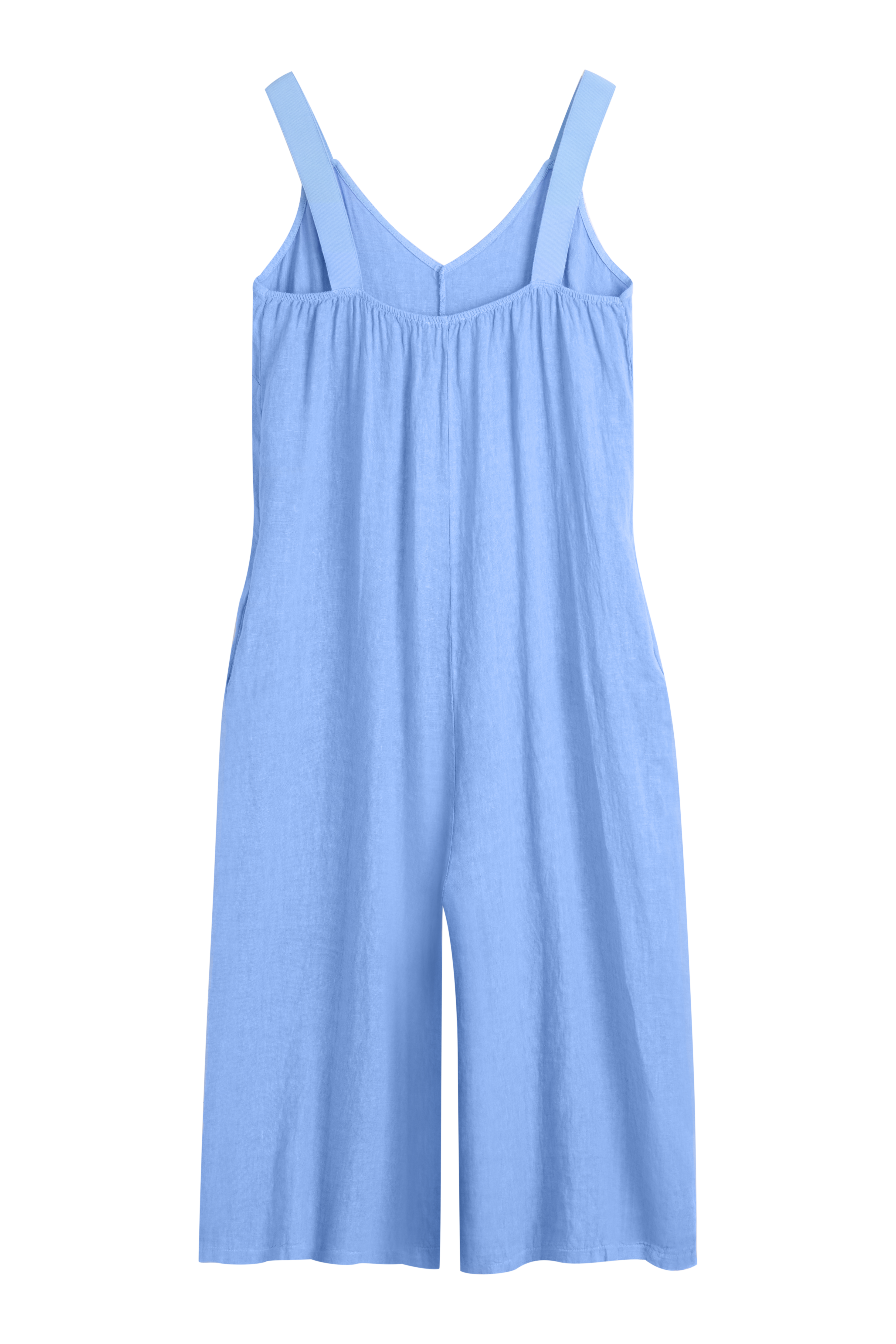 Casual linen jumpsuit with a V-neckline, sturdy shoulder straps and wide, understated legs.