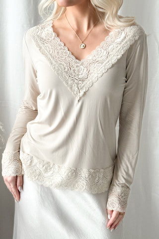 An elegant treasure from the Bamboo Lace Collection: this luxurious top features sensual wide lace at the front V-neckline and sleeve edges. Our model, size XS/S, is wearing size S in the photos. Perfect to layer under V-neck knits. The fabric is a lightweight bamboo jersey.
