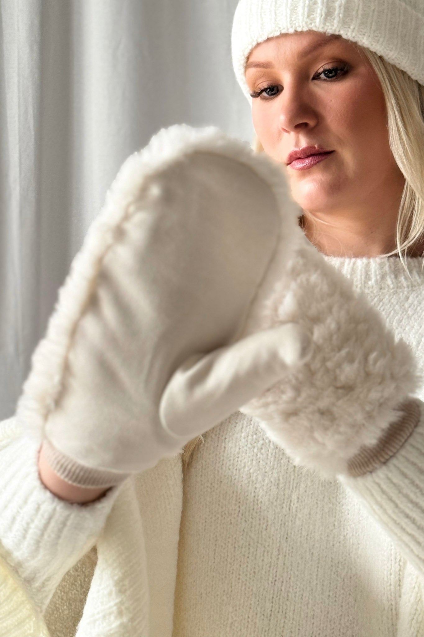 Lovely fluffy and warm mittens. The mitten has a slightly stretchy knitted part that fits comfortably around your arm.