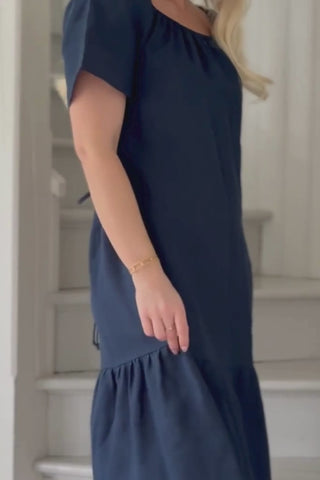 A feminine off-shoulder linen dress featuring a charming frilled hem and a tie-back waist belt to create a beautifully flattering silhouette. Short sleeves and elastic smocking at the neckline add comfort and elegance.