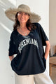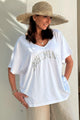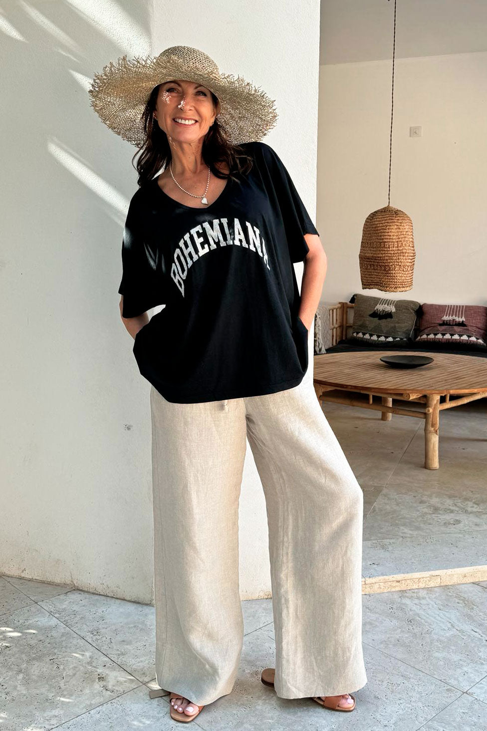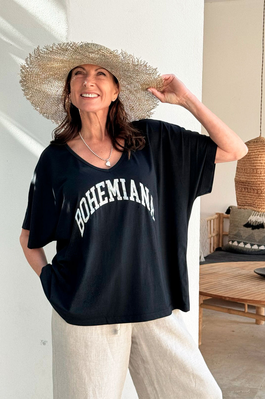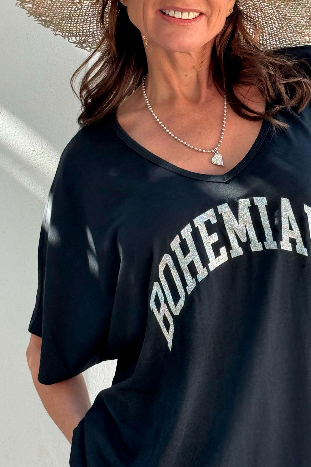 Relaxed v-neck cotton shirt from the Bohemiana with text in glitter print. Loose sizing, suitable for sizes XS-XXL.