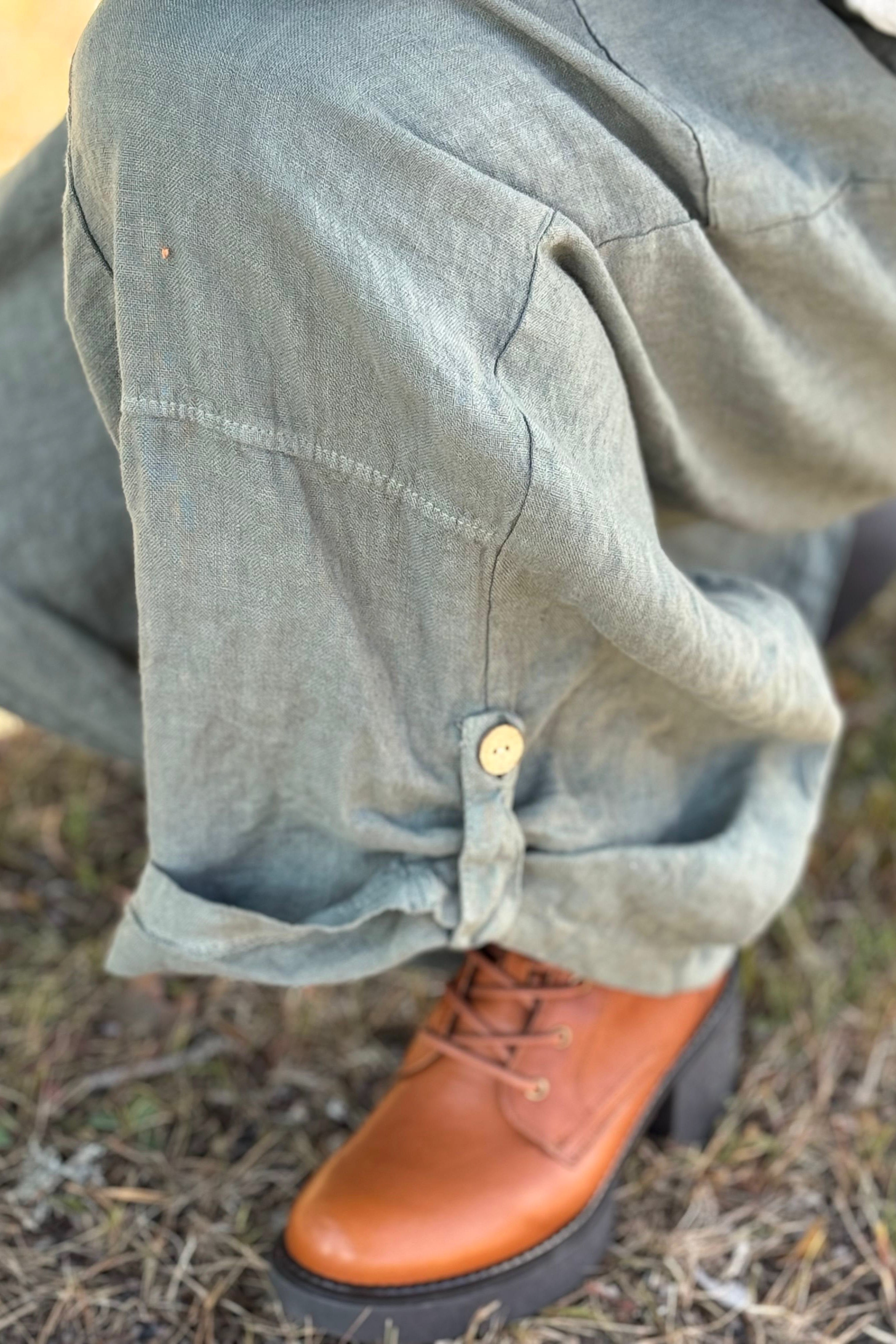 The loose oversize model goes for many sizes, the crotch part hangs down and deep pockets. Tie-down, adjustable straps and button stud detail on the legs. Vintage washed linen.