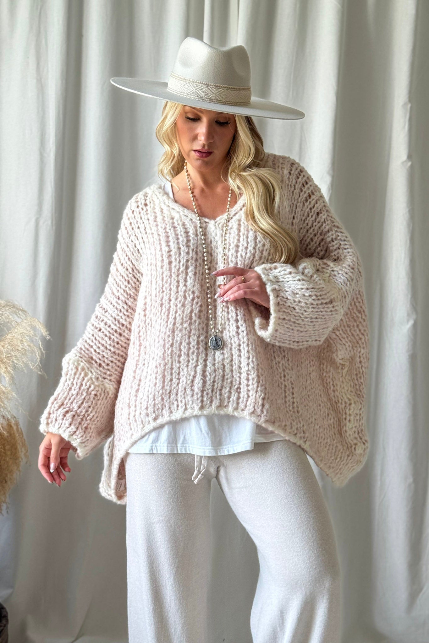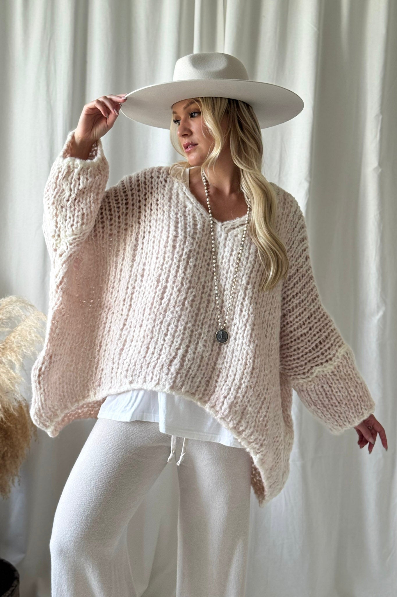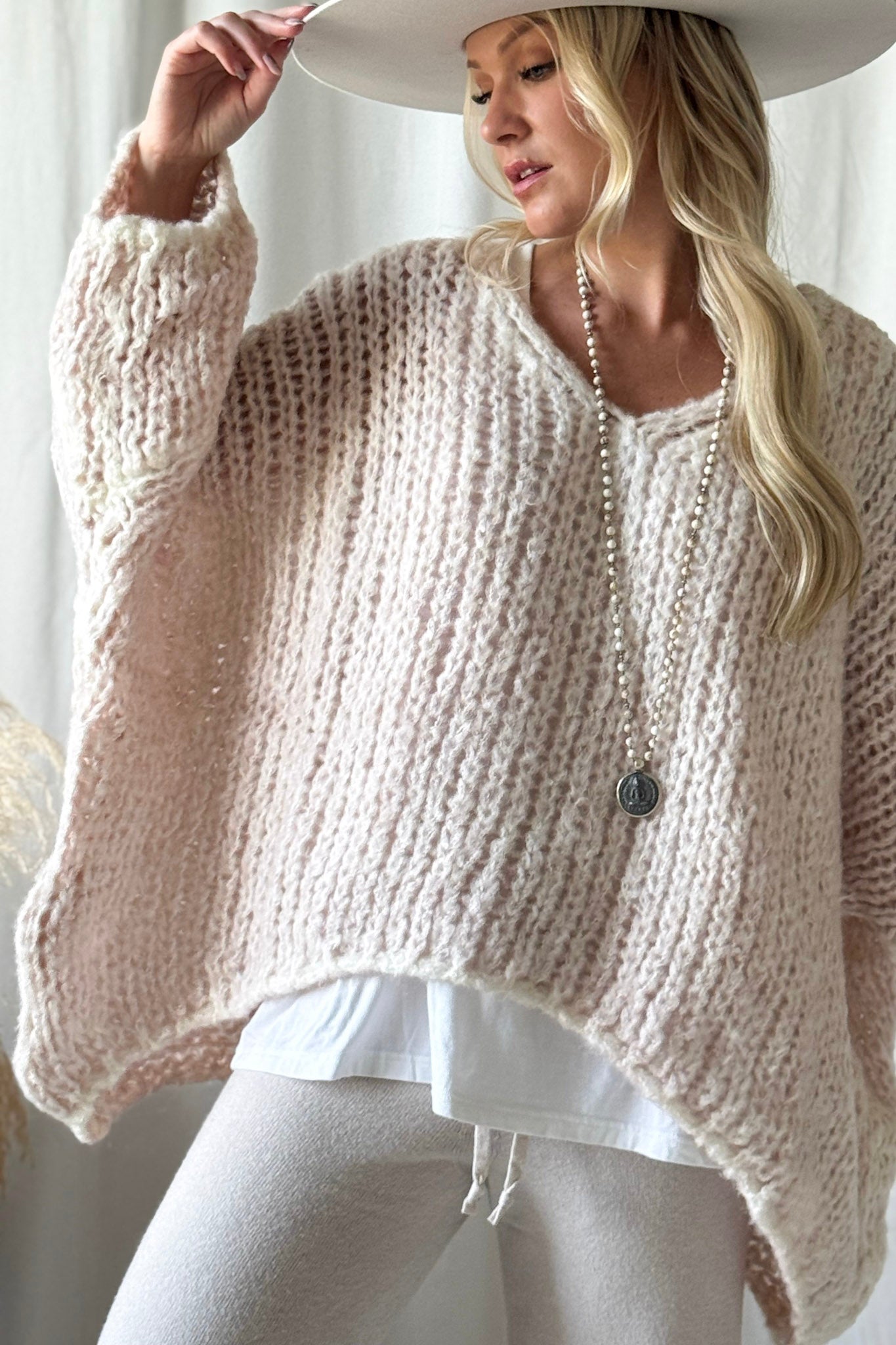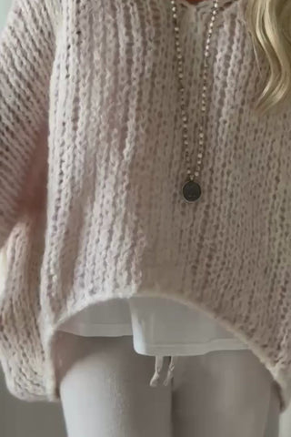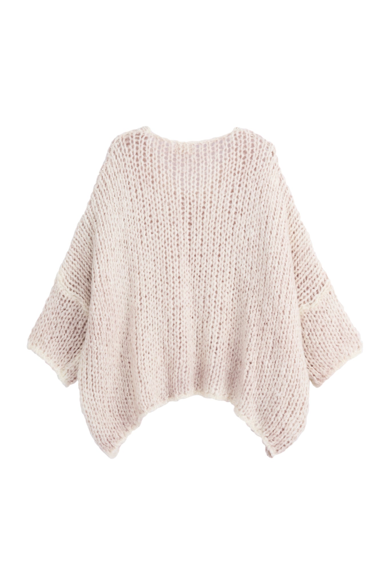 Chunky and luxuriously soft – this ultra-oversized knit features a flattering V-neckline and a dropped shoulder seam. The sleeves are slightly cropped and wonderfully roomy. The loose knit makes it easy to layer, for example, with a bamboo top underneath. The coloring of the knit mimics a "spray-effect" style, creating a beautifully misty and irregular appearance.