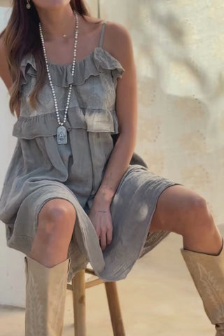 A romantic dress featuring a ruffled collar and a lace panel on the bodice that wraps around the entire dress. Adjustable straps and a ribbed neckline ensure a comfortable fit, and the included slip adds a beautifully flowing drape.