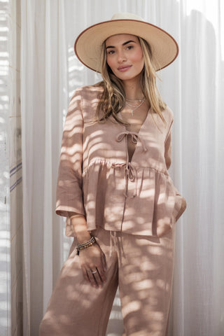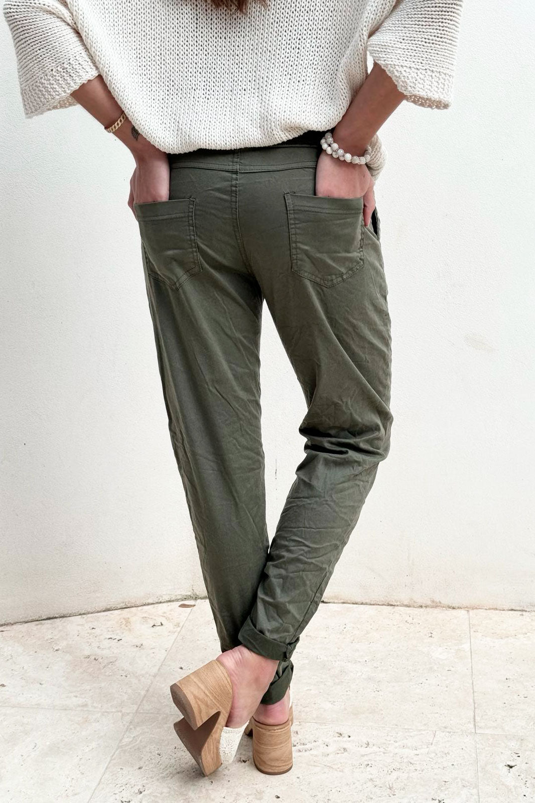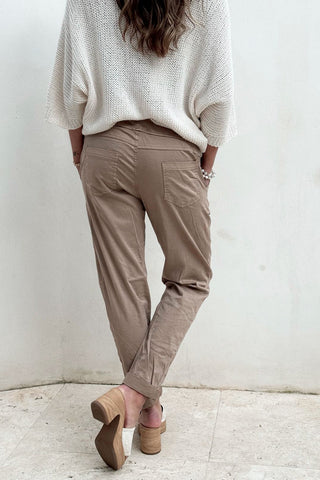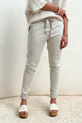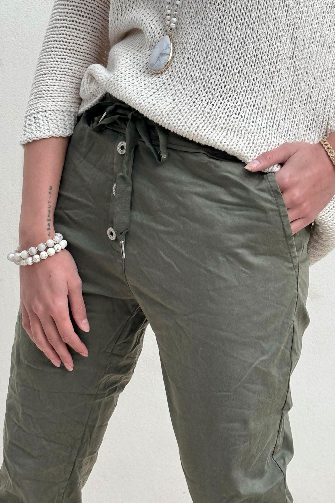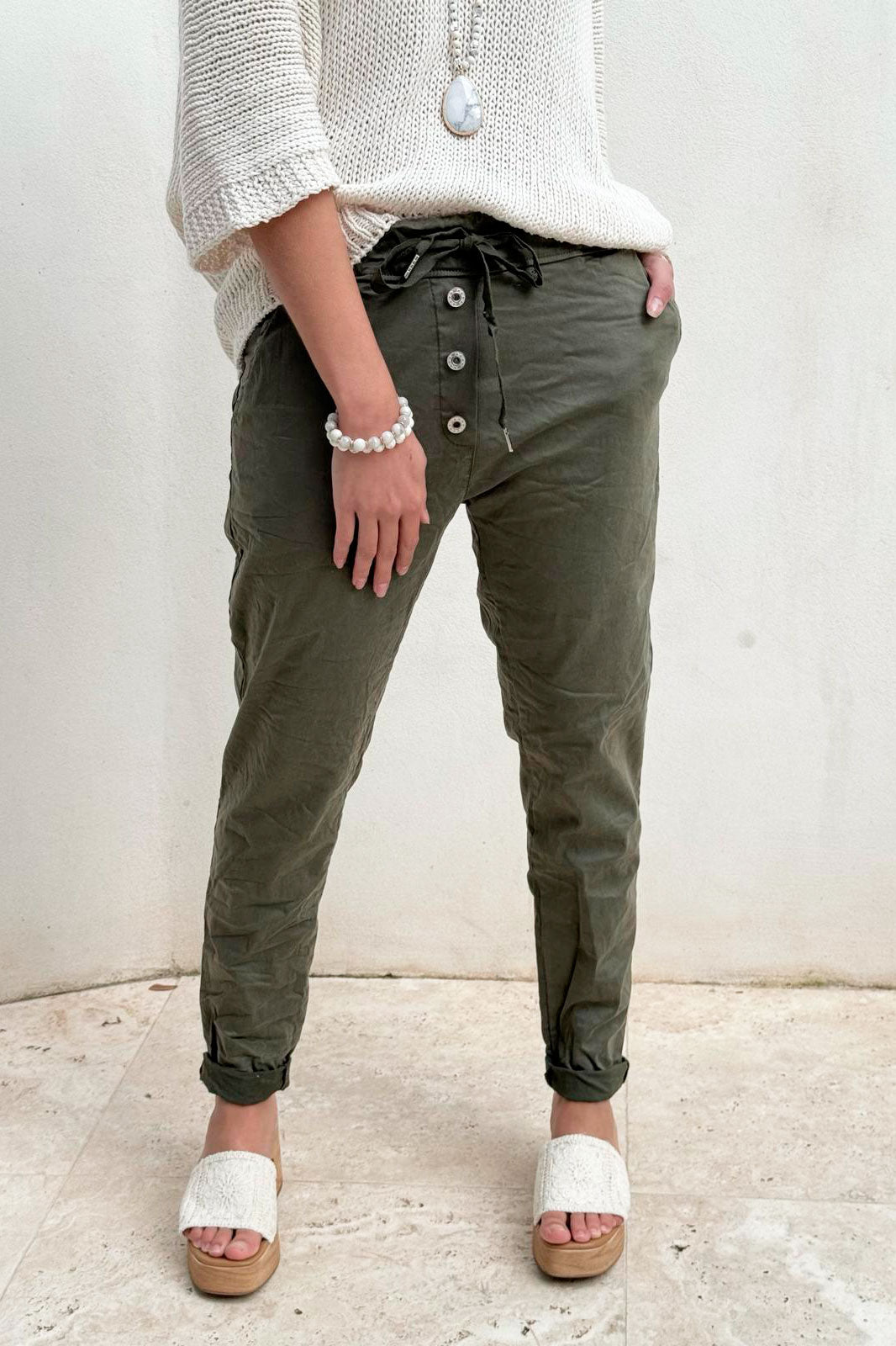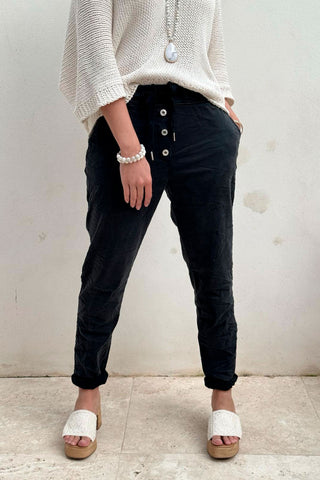 Super comfortable joggers made of soft tencel! The joggers are decorated with three buttons and pockets on the front and they slip on comfortably. Drawstring at the waist.