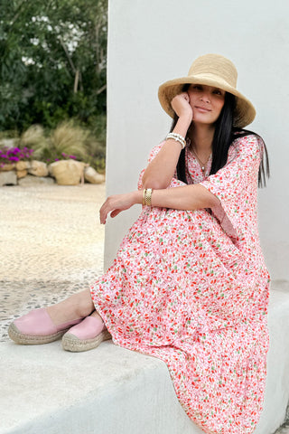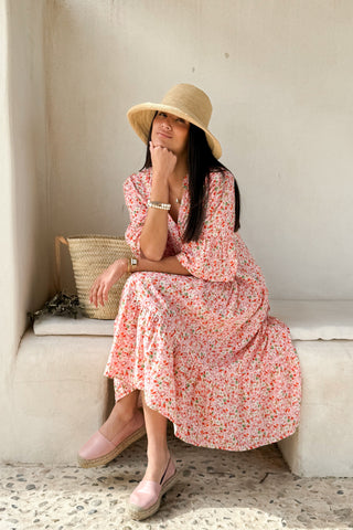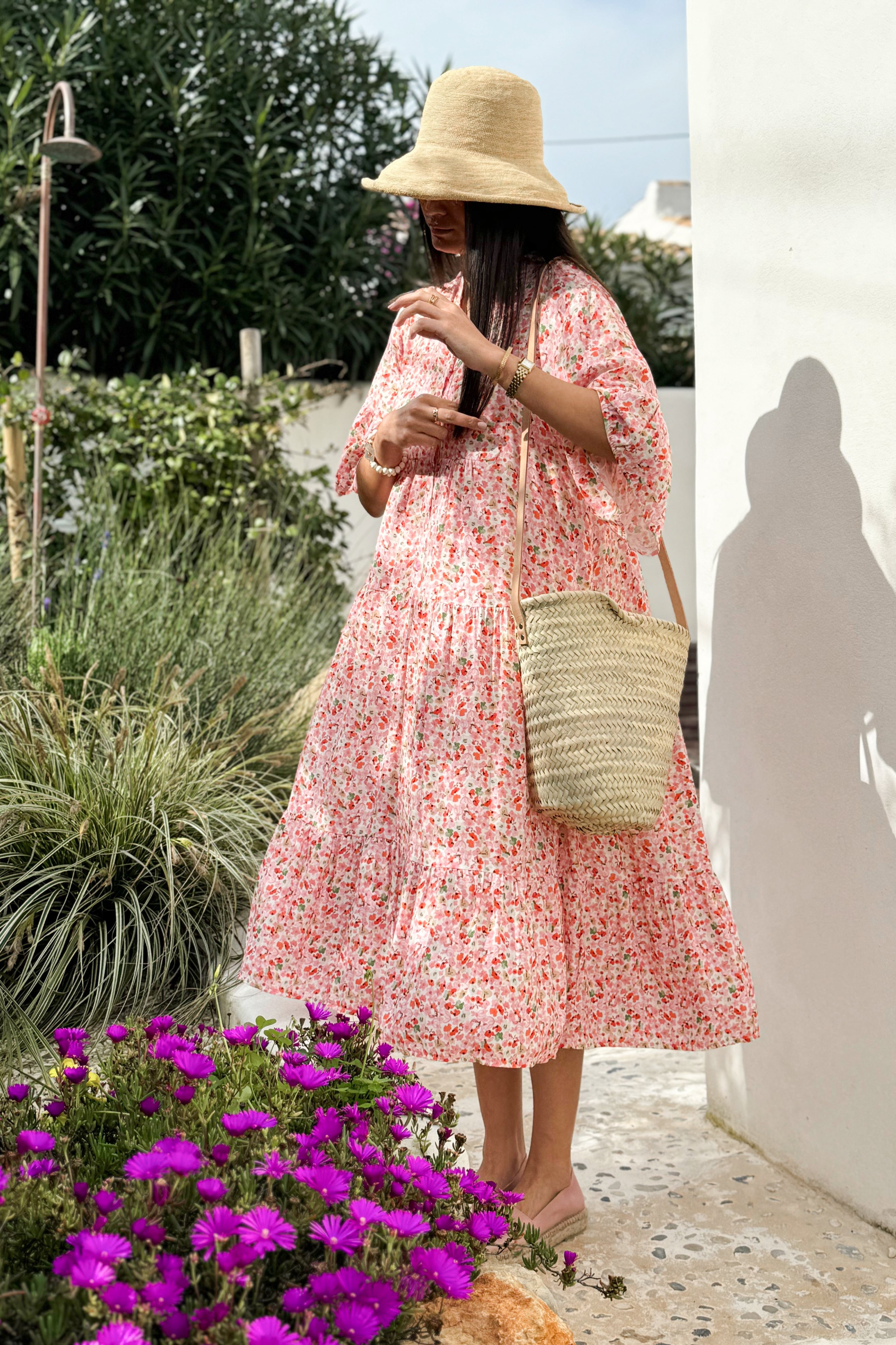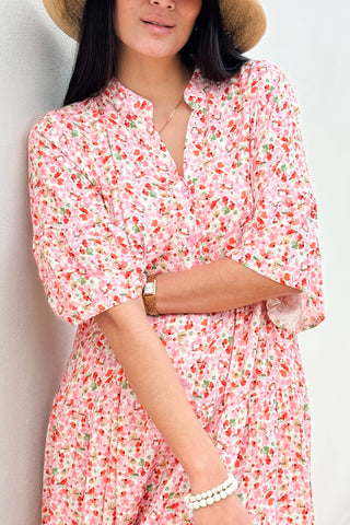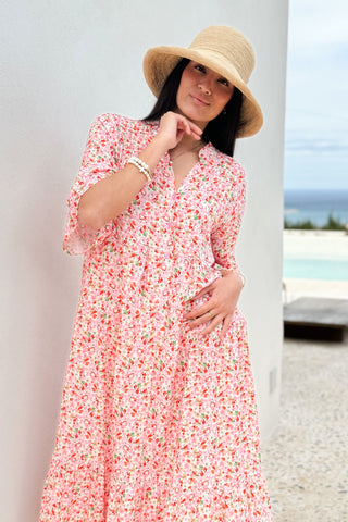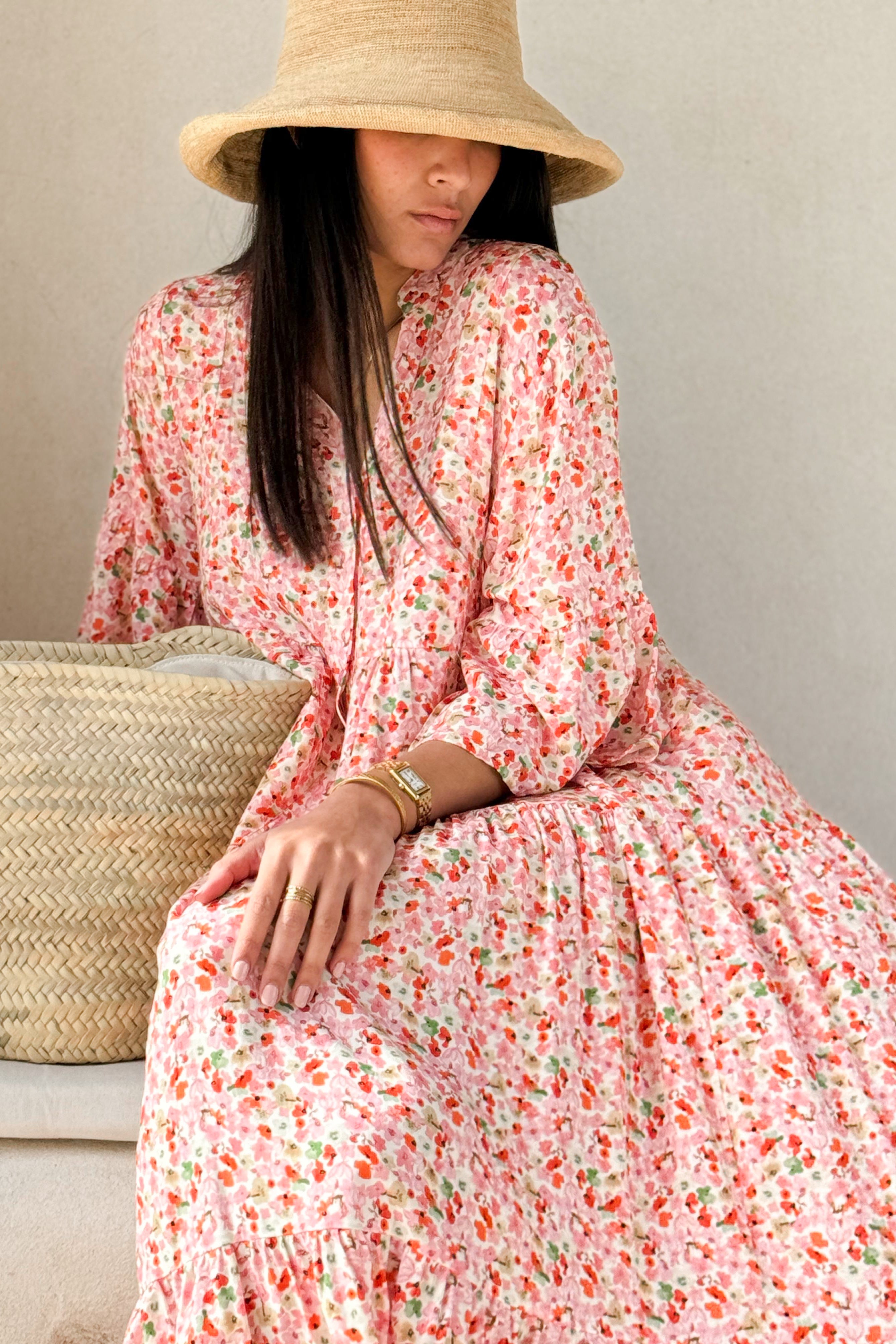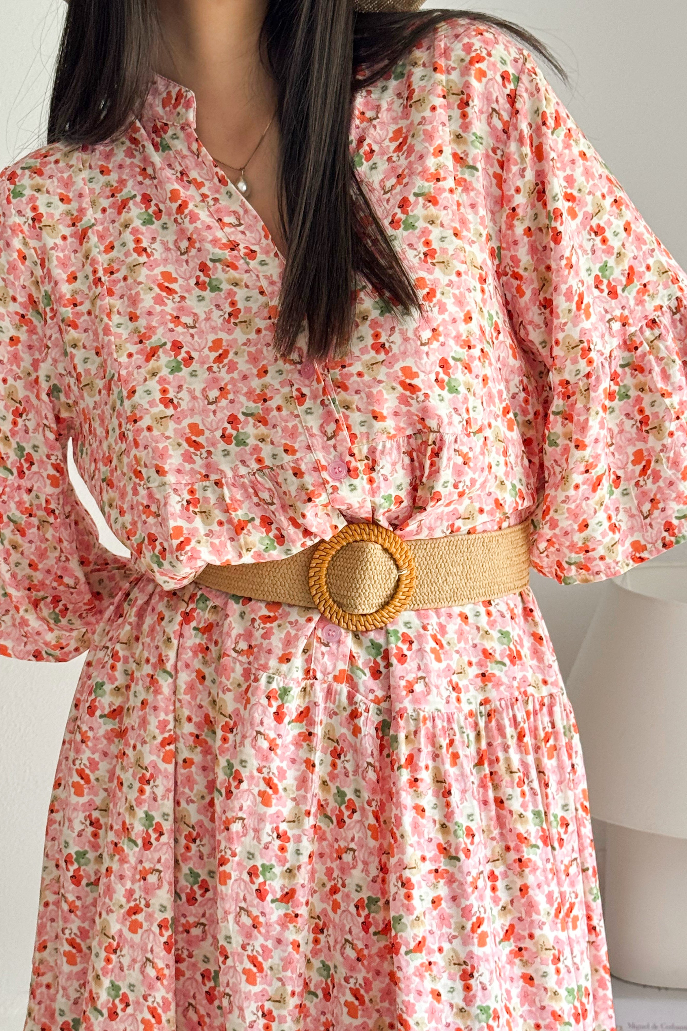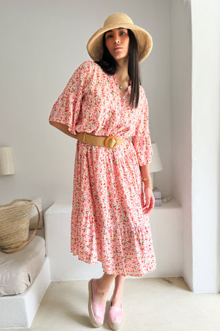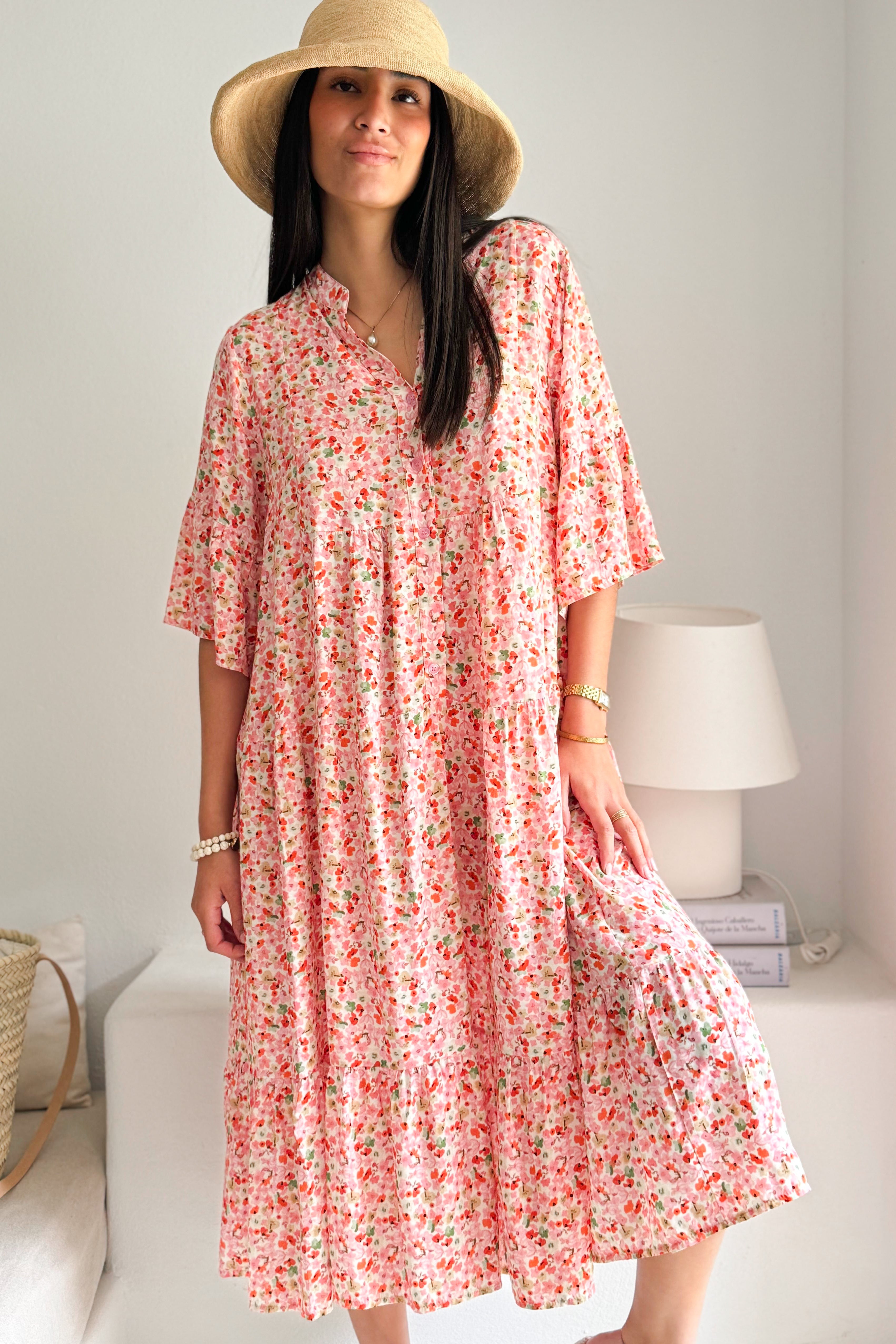 Midi-length viscose dress with beautiful patterns. V-shaped neckline and buttons at the front of the dress. Cross section under the breast. A-line hem and flared cuffs.