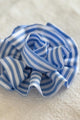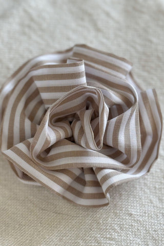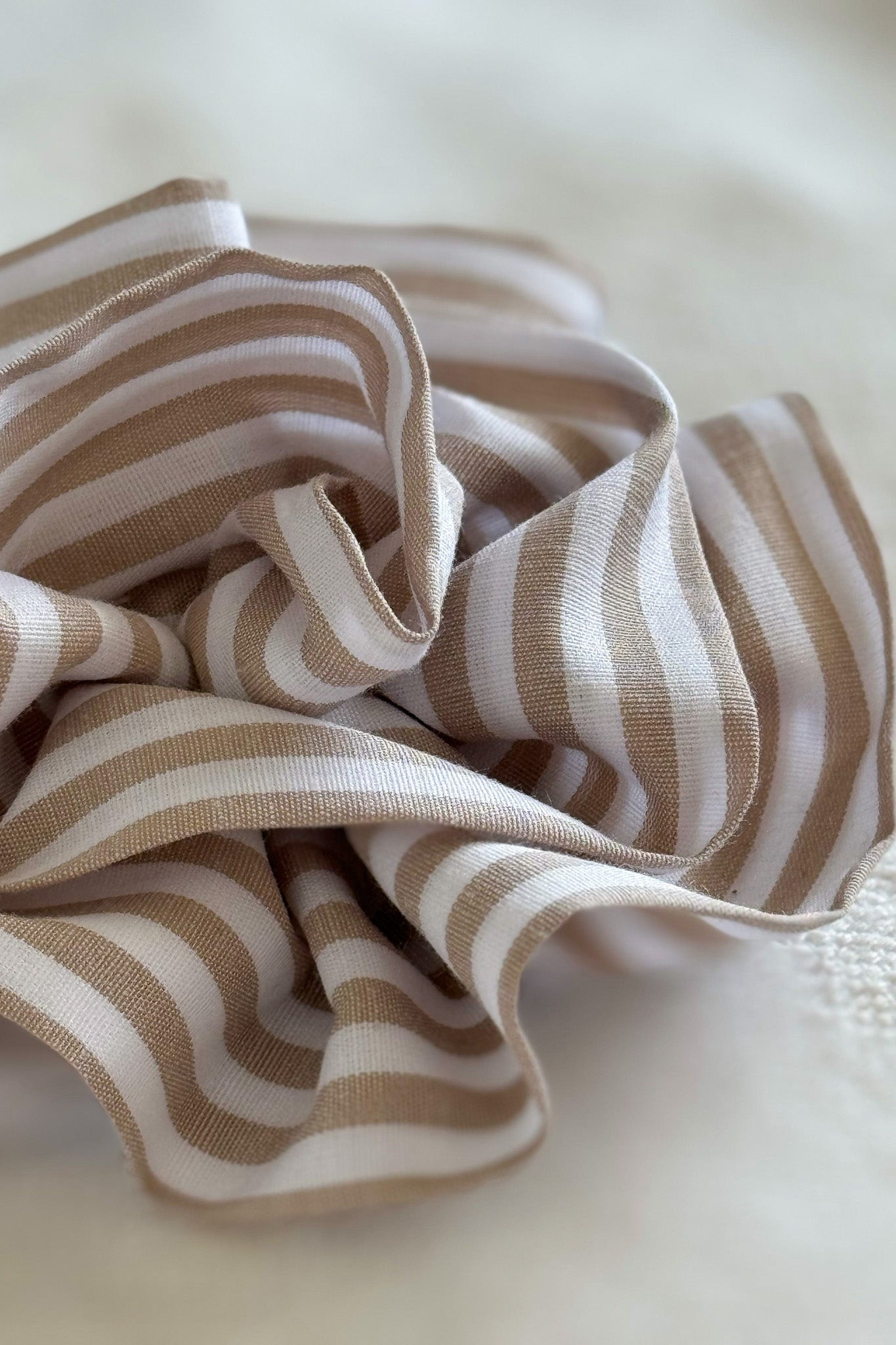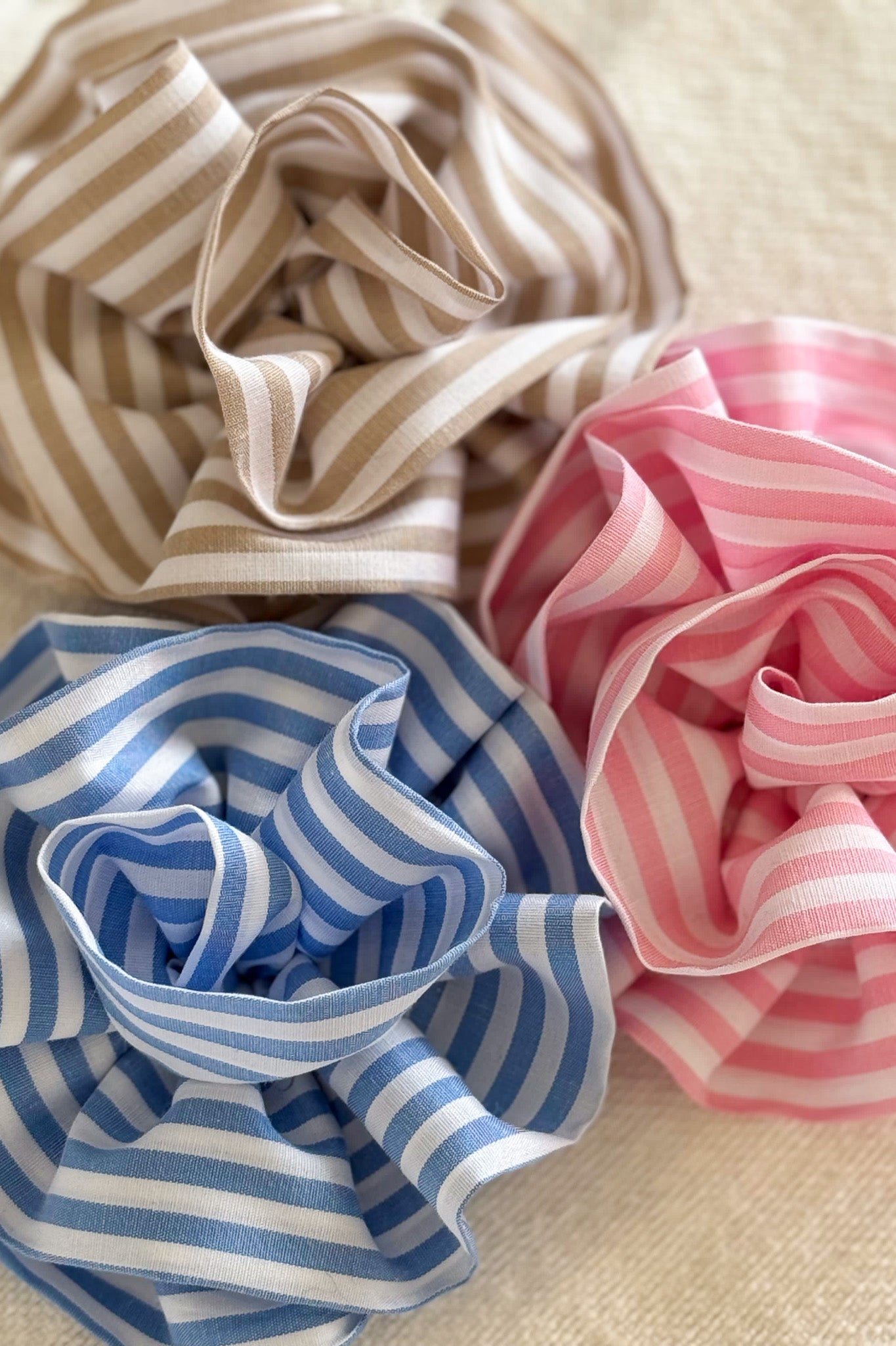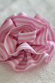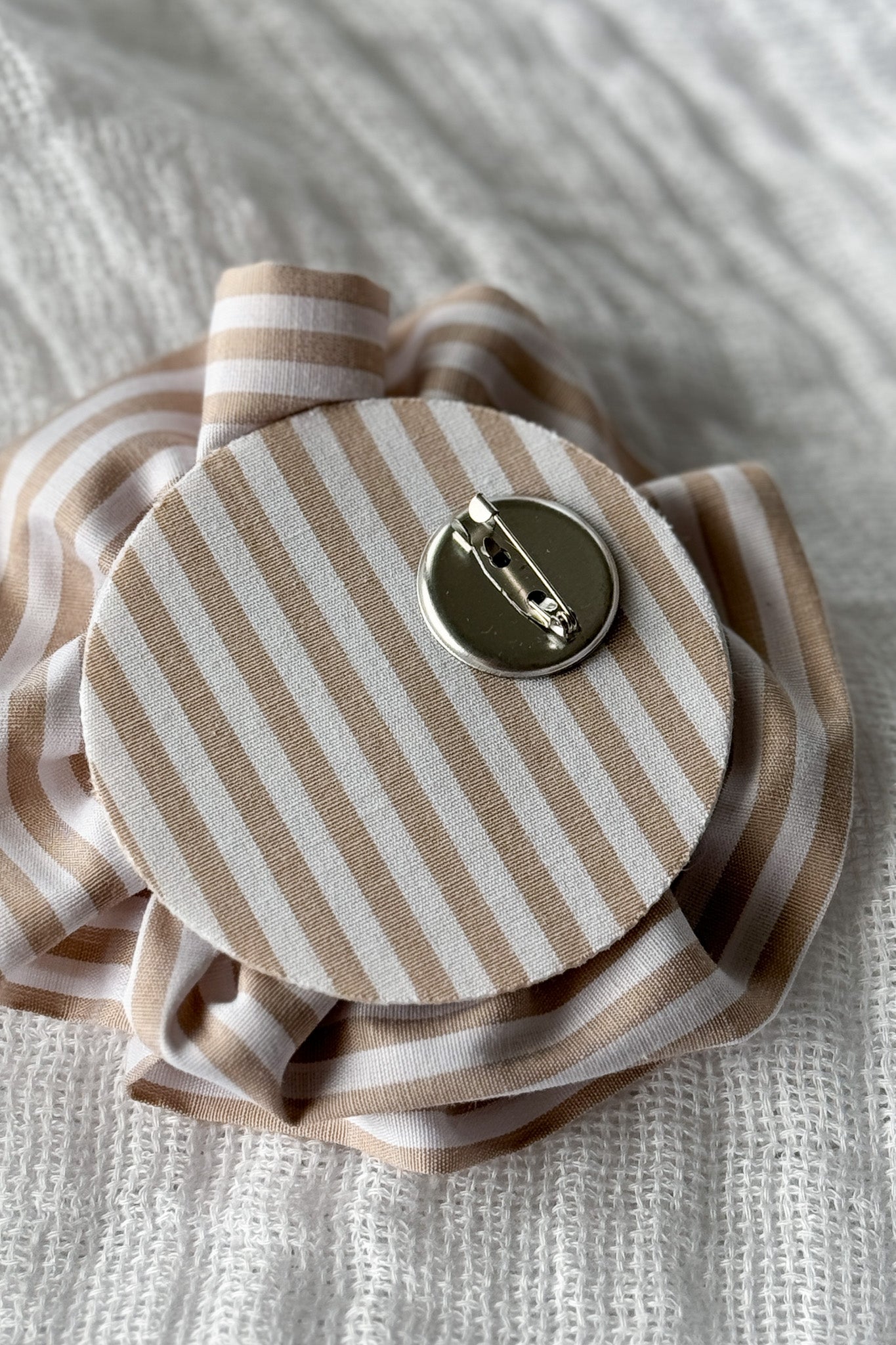 A stylish and carefully crafted fabric flower brooch that adds a striking yet refined detail to your outfit. The petals are elegantly pleated, creating a structured yet softly flowing shape. The striped fabric enhances the depth of the floral design and adds a sense of light movement.