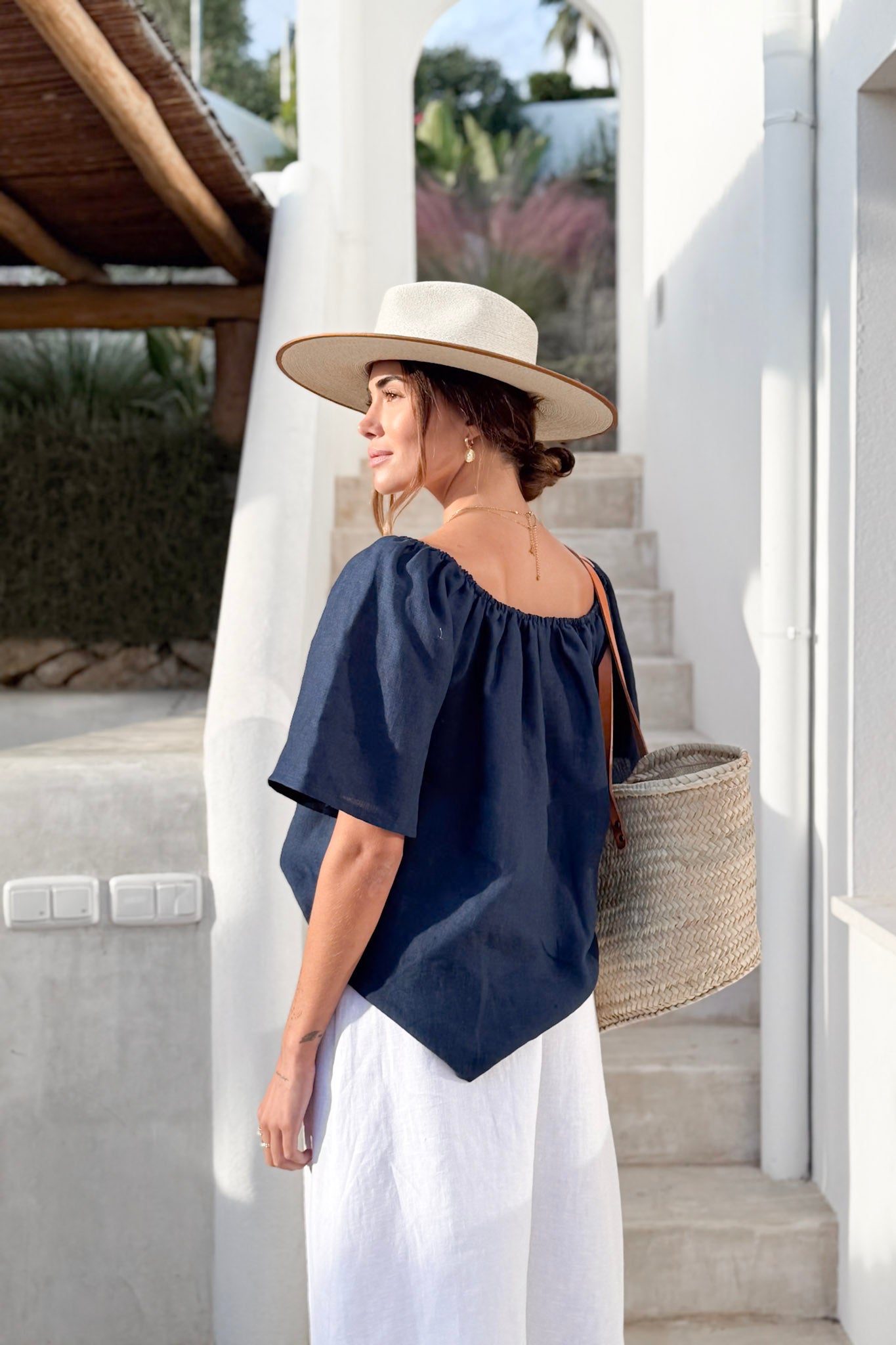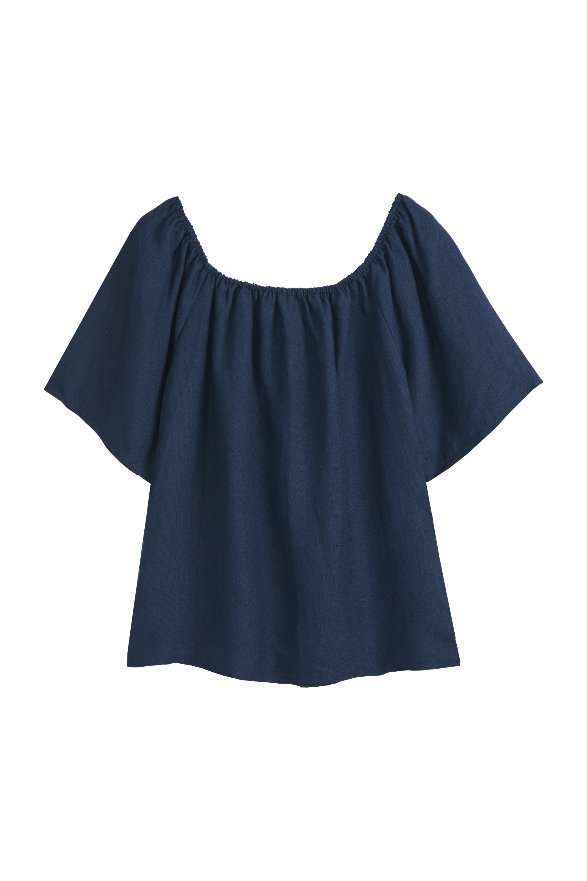 Light and airy linen off-the-shoulder top with an A-line silhouette. Features loose, slightly flared half-length sleeves. Lightweight and beautifully draped, making it an easy choice for summer outfits.