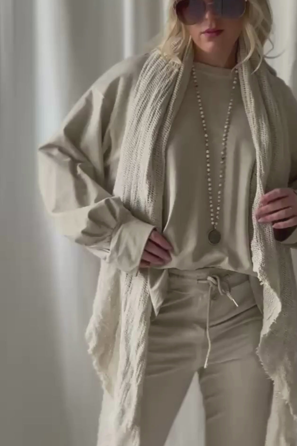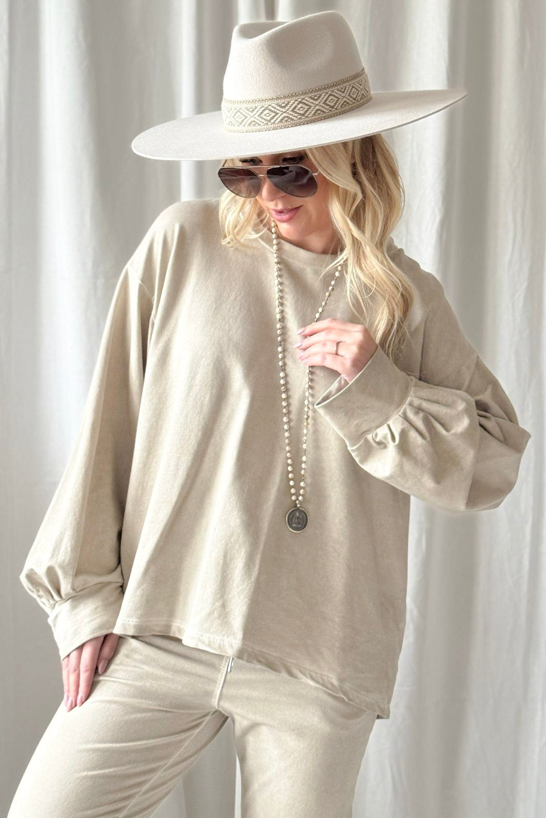 This sweatshirt with a round neckline is designed to bring softness, comfort, and a relaxed style to everyday wear. The material feels pleasant against the skin. A slightly shorter front and longer back create a relaxed, draping silhouette that is easy to pair with different bottoms. Loose sleeves, dropped shoulders, and gathered sleeve details complete the effortless and modern look.