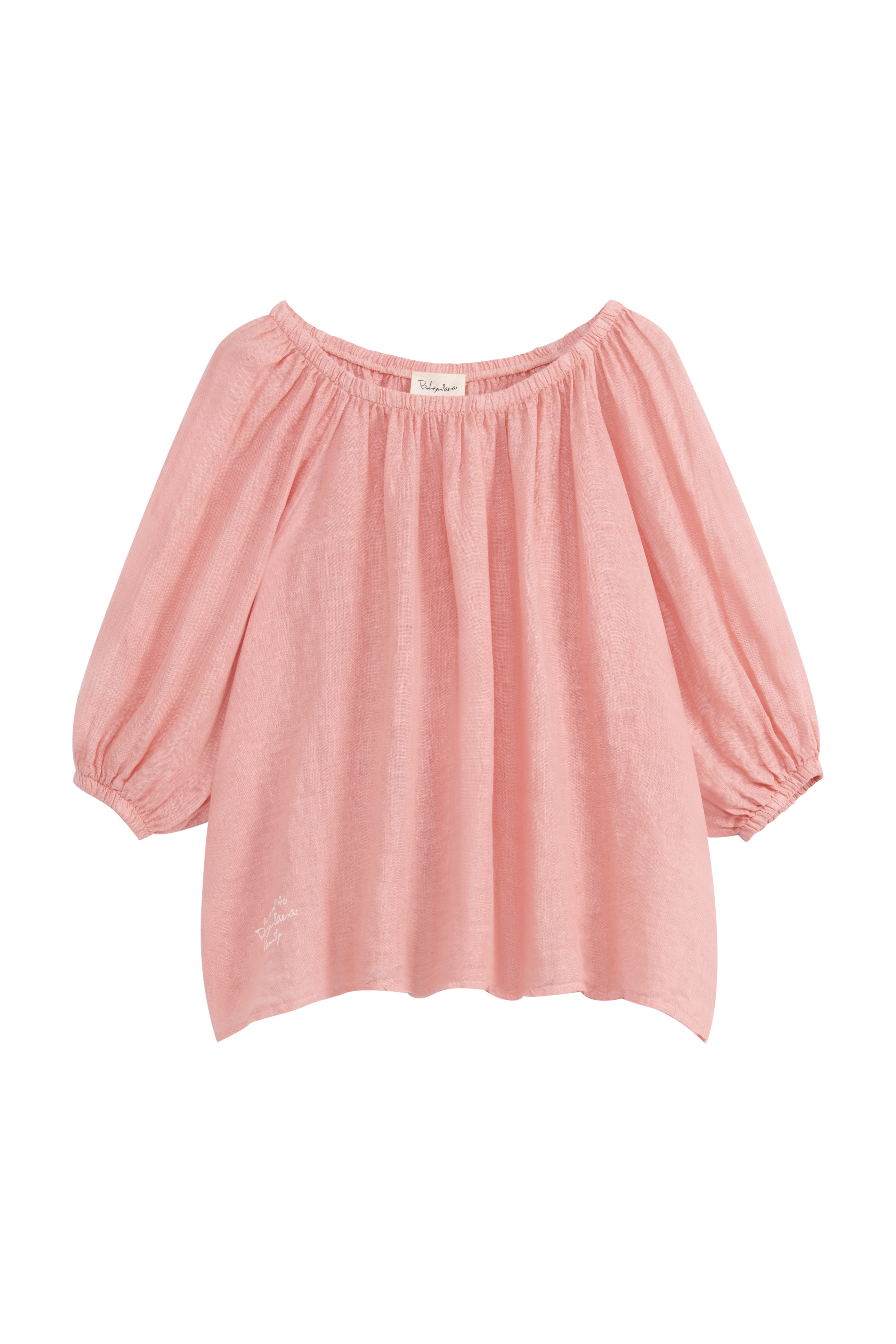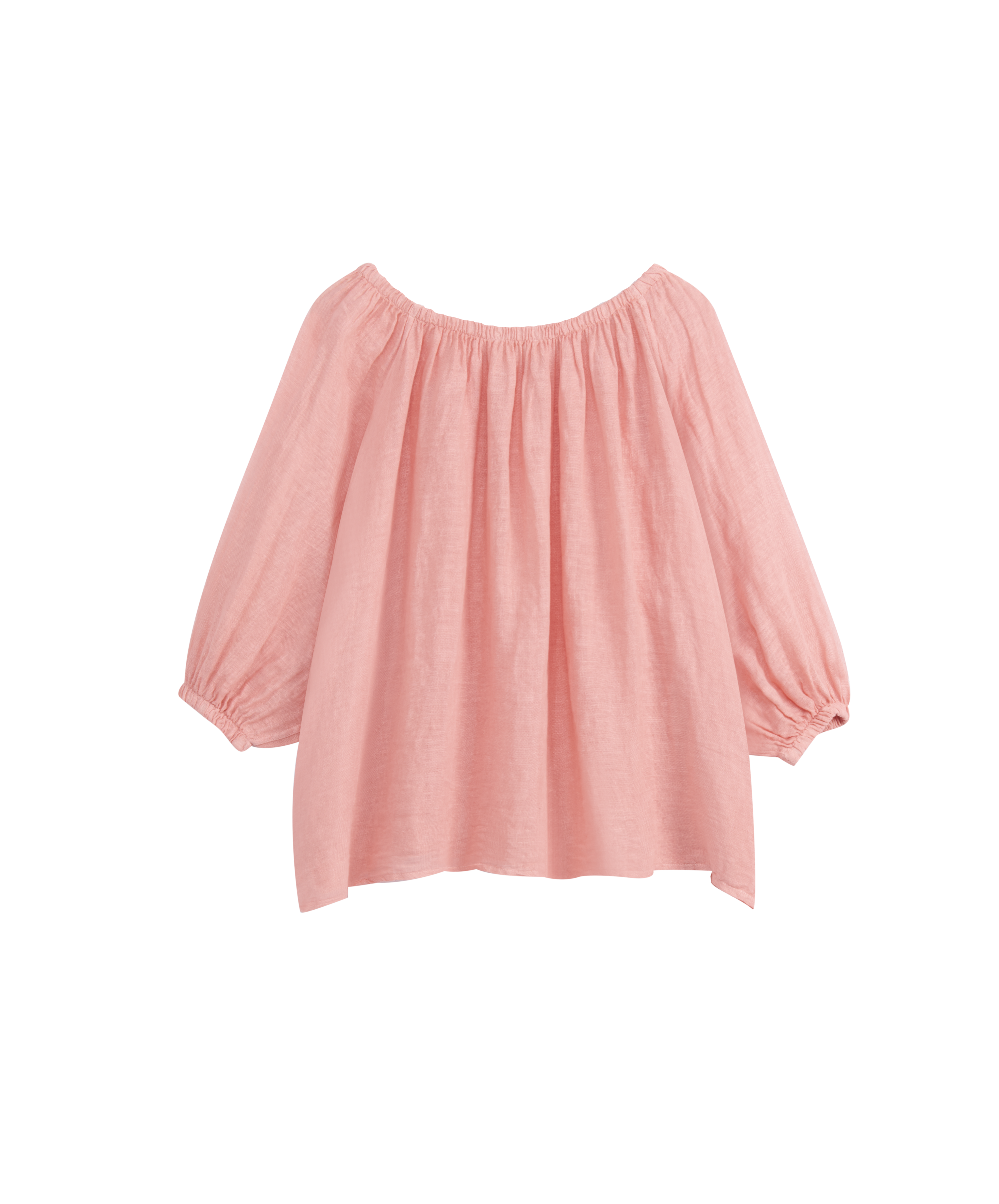 A wonderfully light and romantic linen shirt. The lovely details of the shirt are created by the elastic neckline and the rouching underneath. Thanks to the soft elastic, the shirt can also be worn off-shoulder. The sleeves are 3/4 length and the cuffs are elastic. The shirt has small slits on the sides.