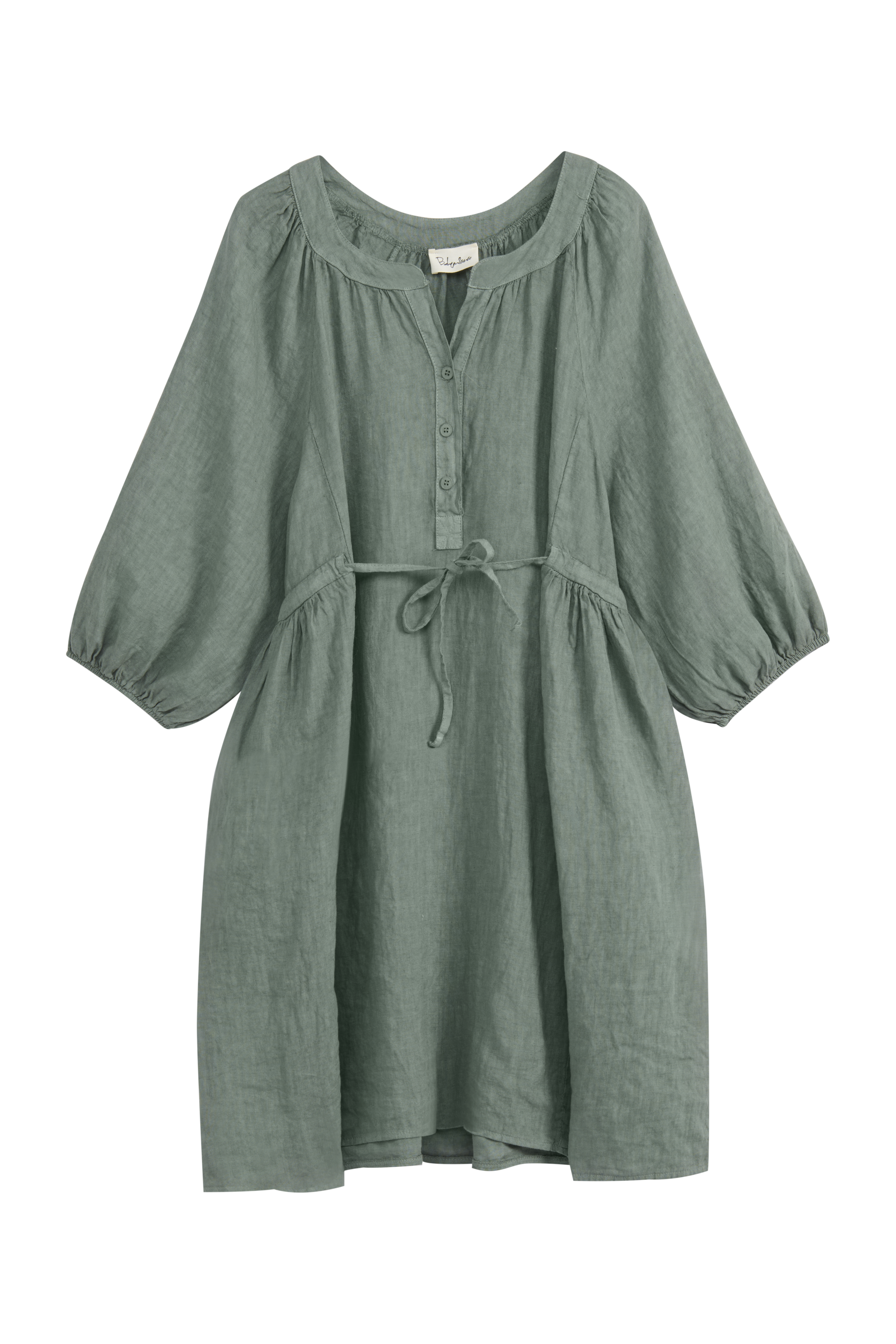 A light and feminine dress with beautiful tie details that accentuate the waist and add gorgeous volume to the hem. Pockets add practicality, front buttons provide a stylish touch, and puff sleeves with subtle cuffs complete the look