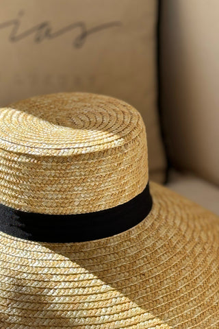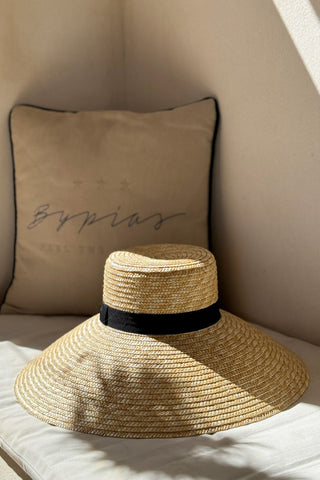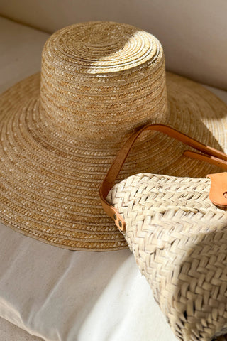 Lovely big brimmed hat weaved from palm leaves. The brim has a hook so the hat can also be used as a decoration.