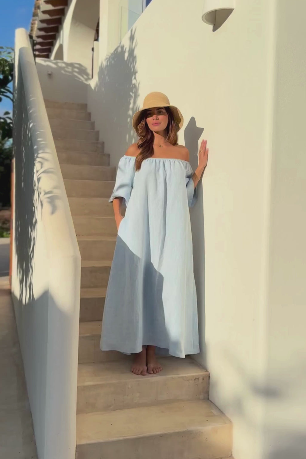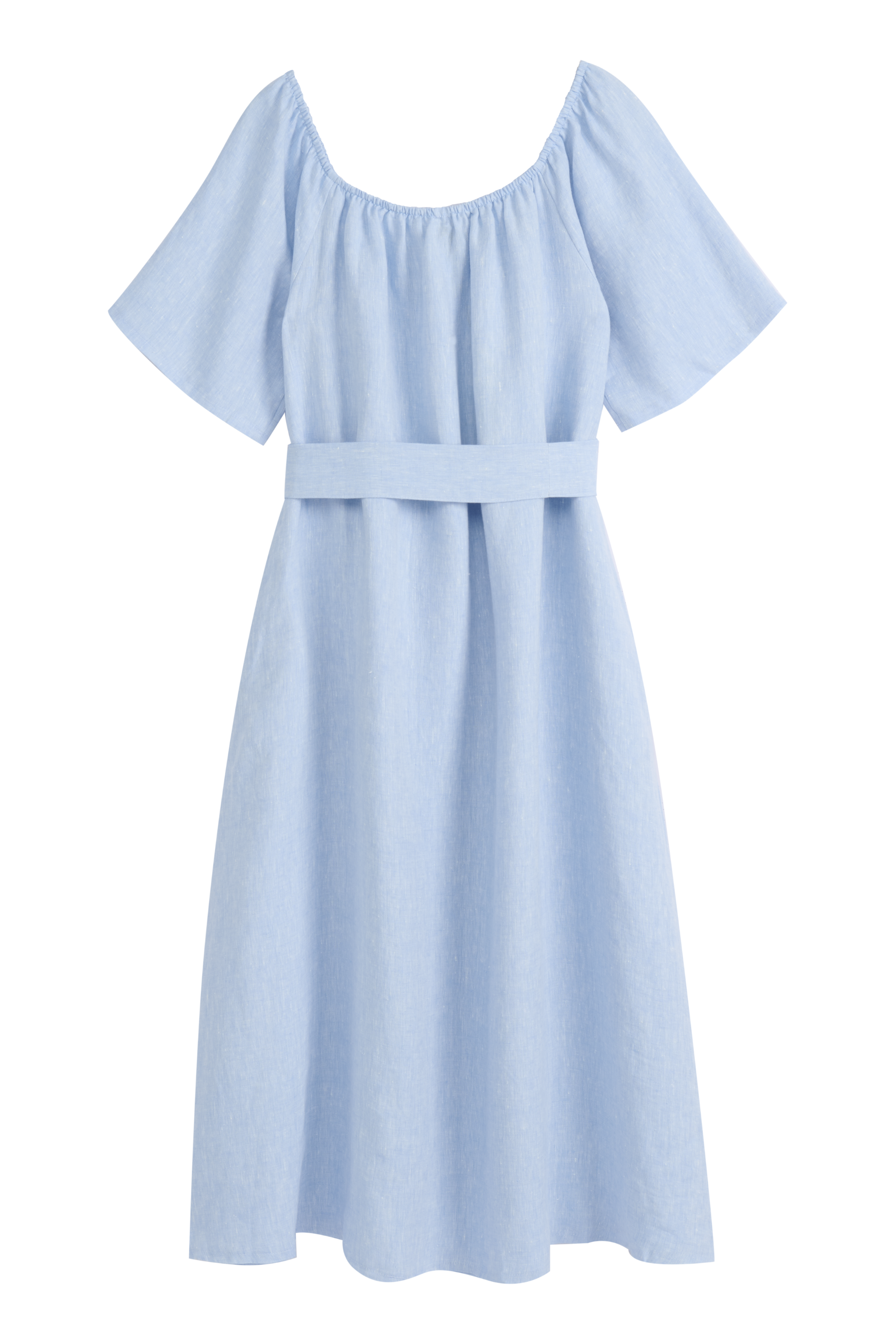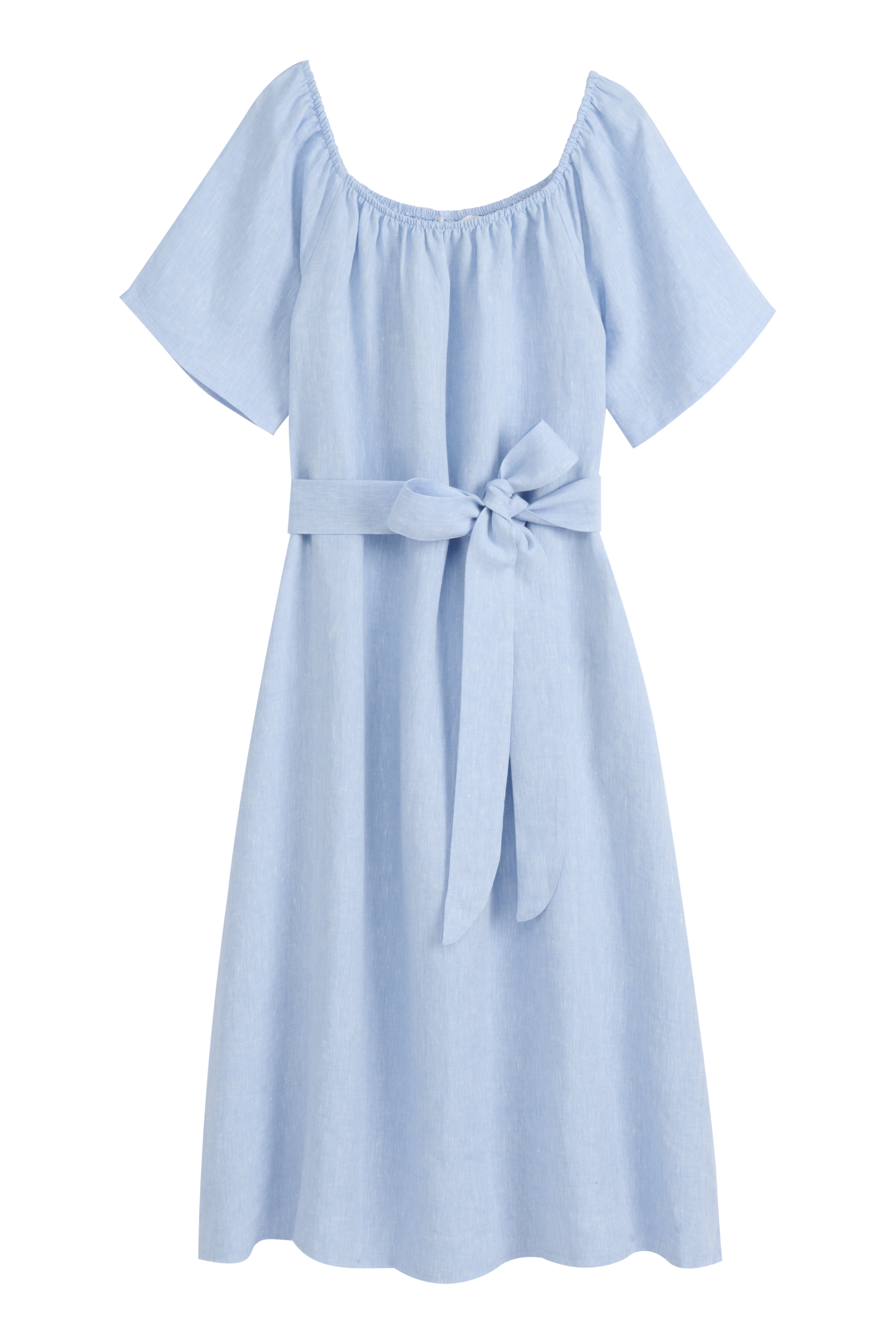 This lightweight and airy linen dress is a perfect choice for warm summer days. The off-the-shoulder design gives a feminine and relaxed look, while the waist tie beautifully accentuates the silhouette. The dress is made from 100% high-quality linen, which breathes exceptionally well and feels comfortable against the skin. Roomy fit.