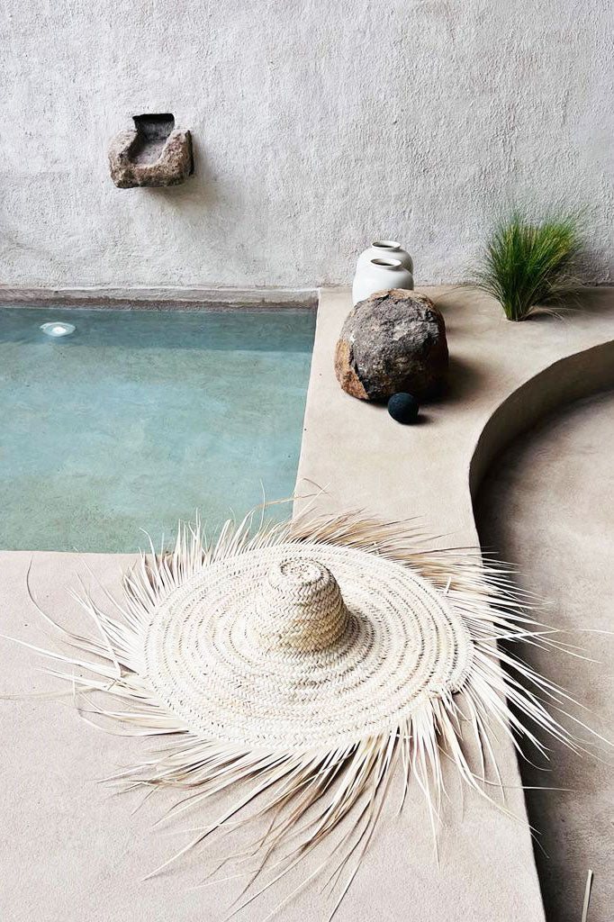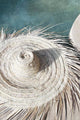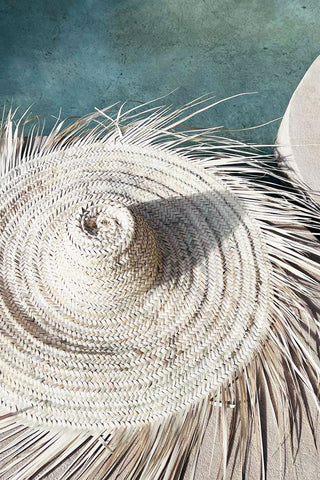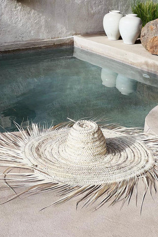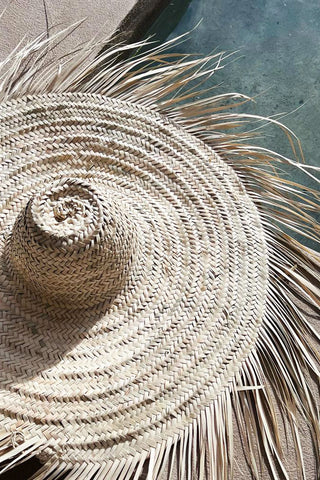 Lovely big brimmed hat weaved from palm leaves. The brim has a hook so the hat can also be used as a decoration.