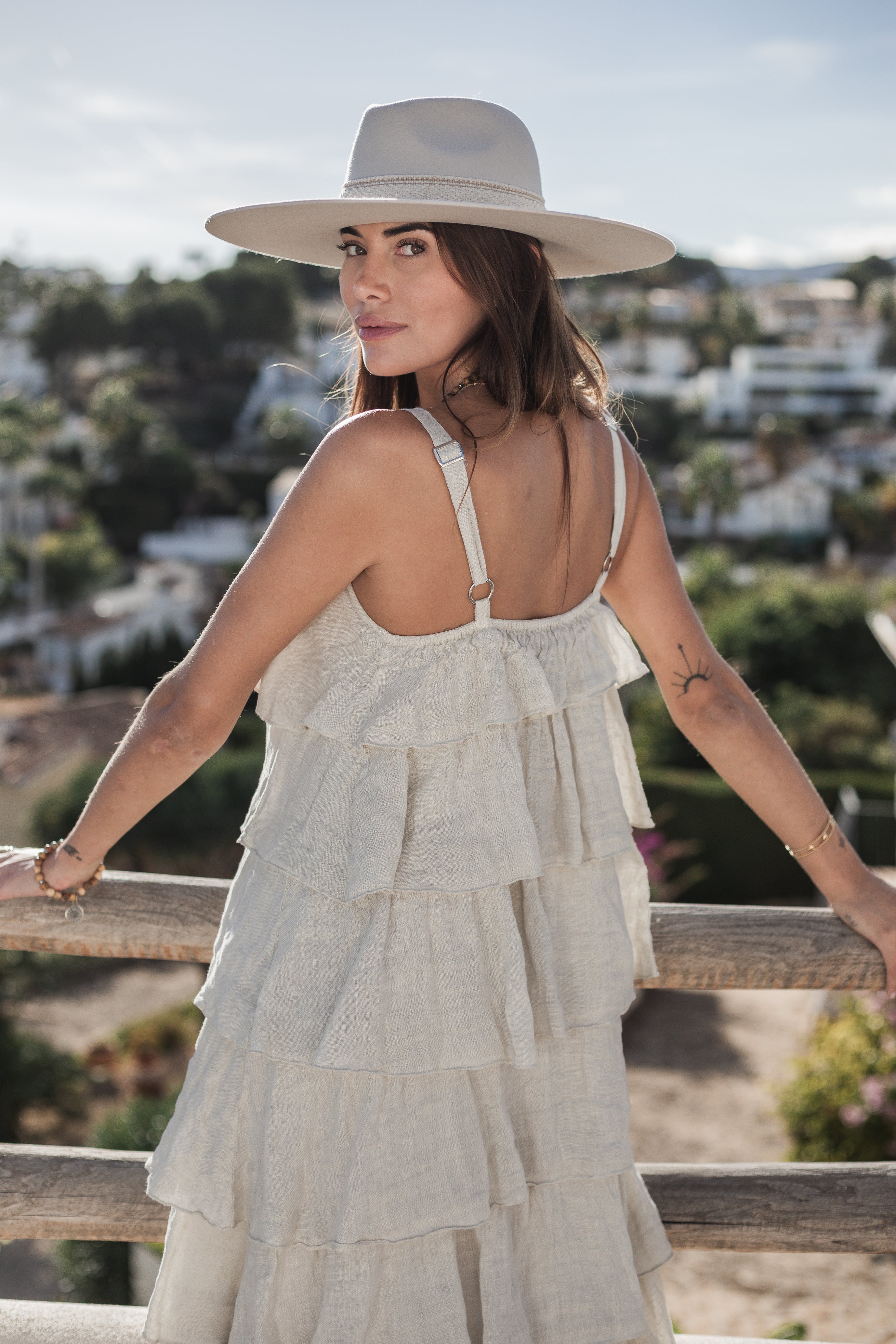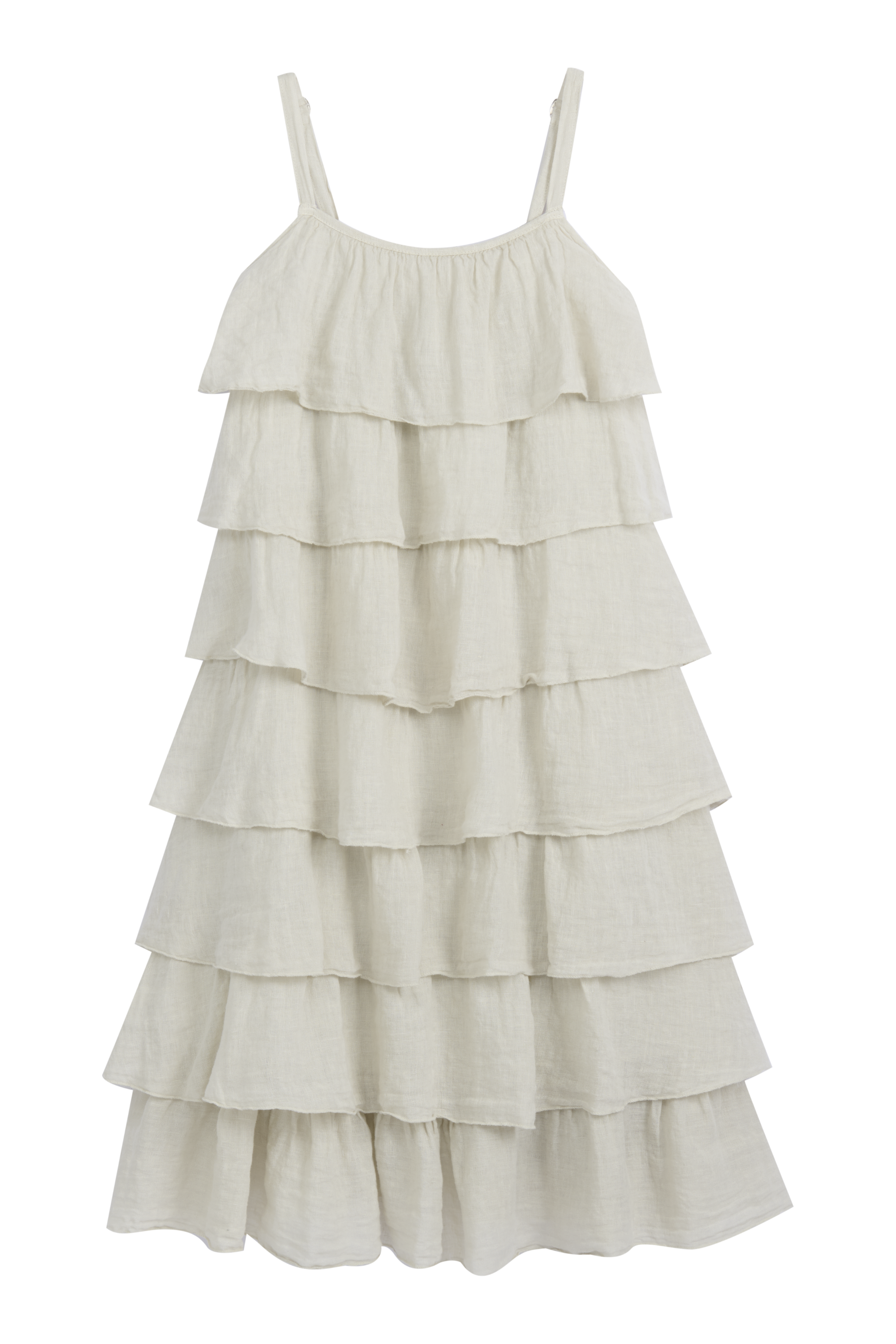 An eye-catching ruffle dress with adjustable straps, featuring layered ruffles that create beautiful volume. Ribbed details on the sides of the neckline and at the back ensure a comfortable fit. The dress runs small in size.