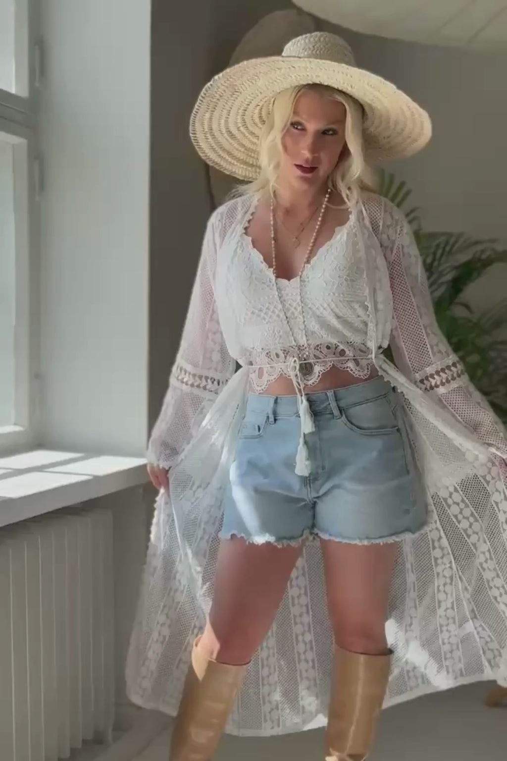 A lovely luxurious lace kimono from the Hanko Beach Pop-up collection. Long kimono with lovely lace details that can be tied with a string at the waist. Full-length trumpet sleeves. Wear our other Hanko Beach Pop-up products or our lovely linen clothes under the kimono.