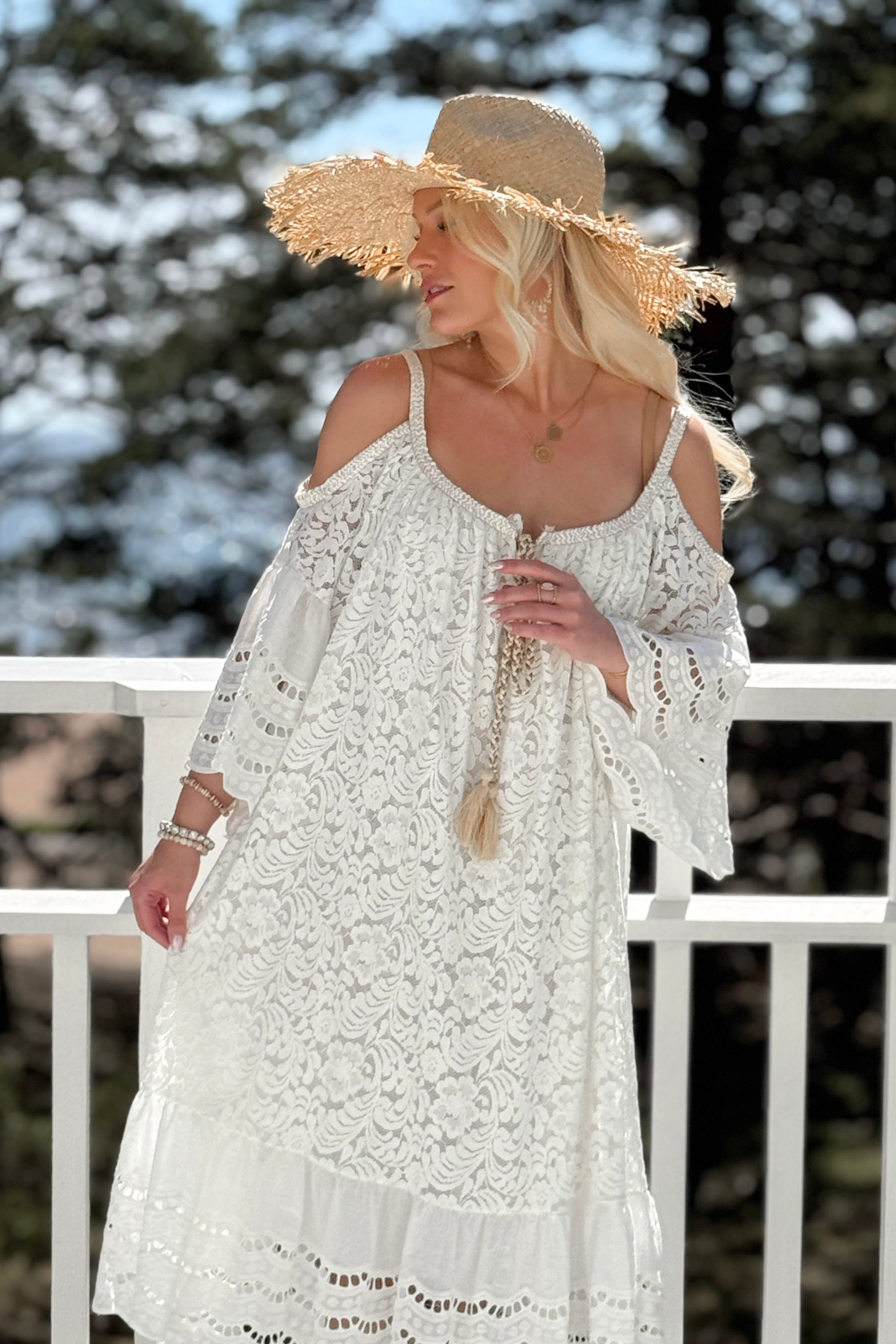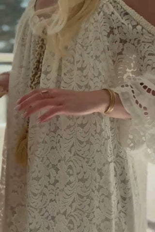 Lovely straight-line dress from the Hanko Beach Pop-up collection. The dress's lovely embroidered butterfly sleeves and braided collar and straps decorated with gold thread give the wearer a fun and stylish look for parties and the beach. The outer fabric of the dress is lace. The skirt has a frill. The dress has a petticoat.