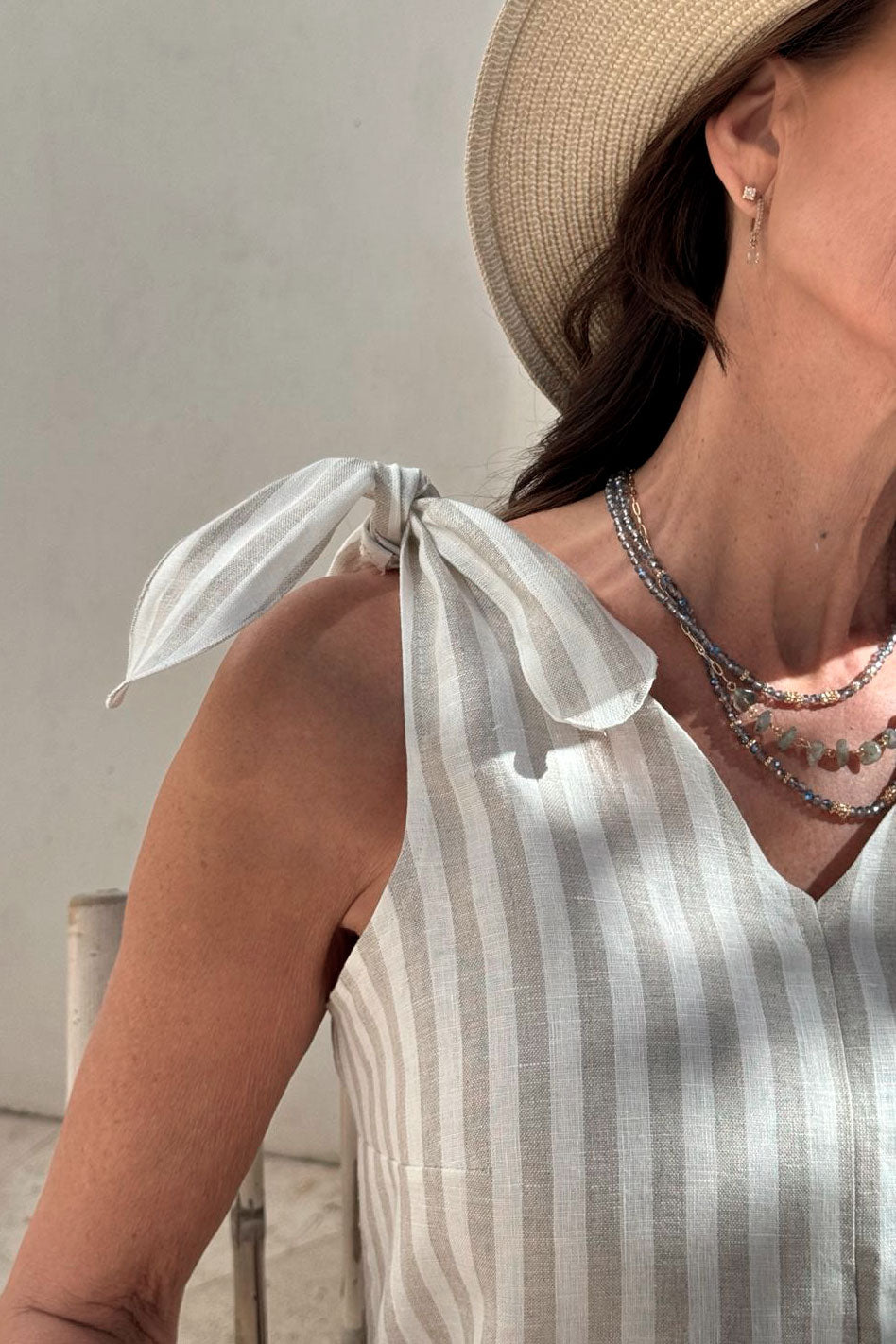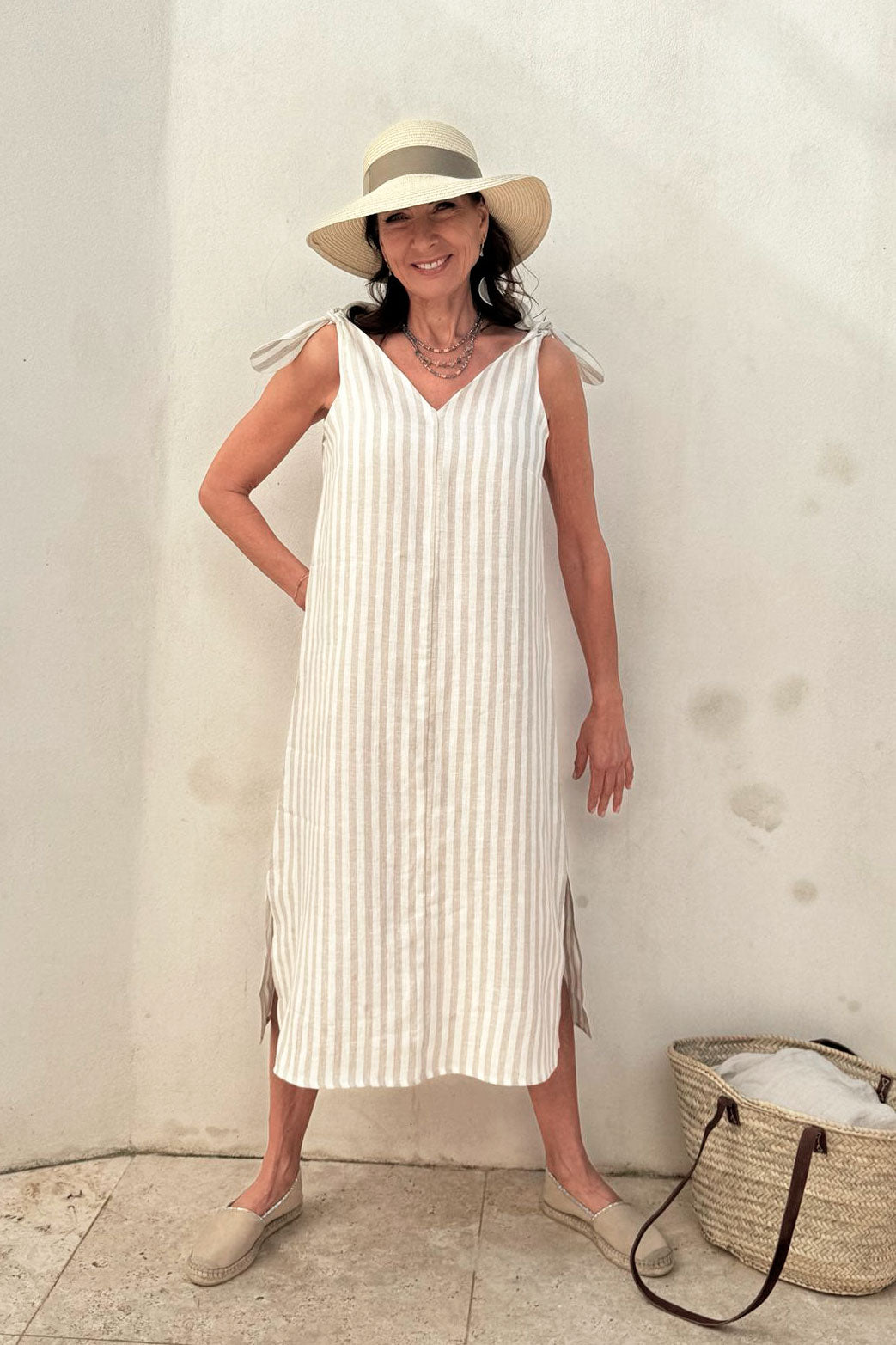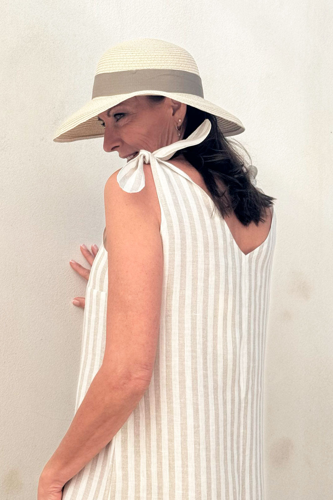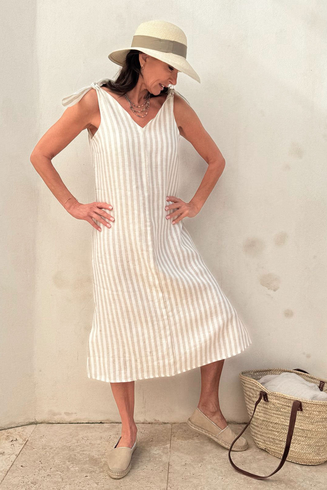 An amazing dress dream BYPIAS linen. Sturdy knotted shoulder straps, a classic flared silhouette and a flattering V-neckline make this dress a true wardrobe staple.