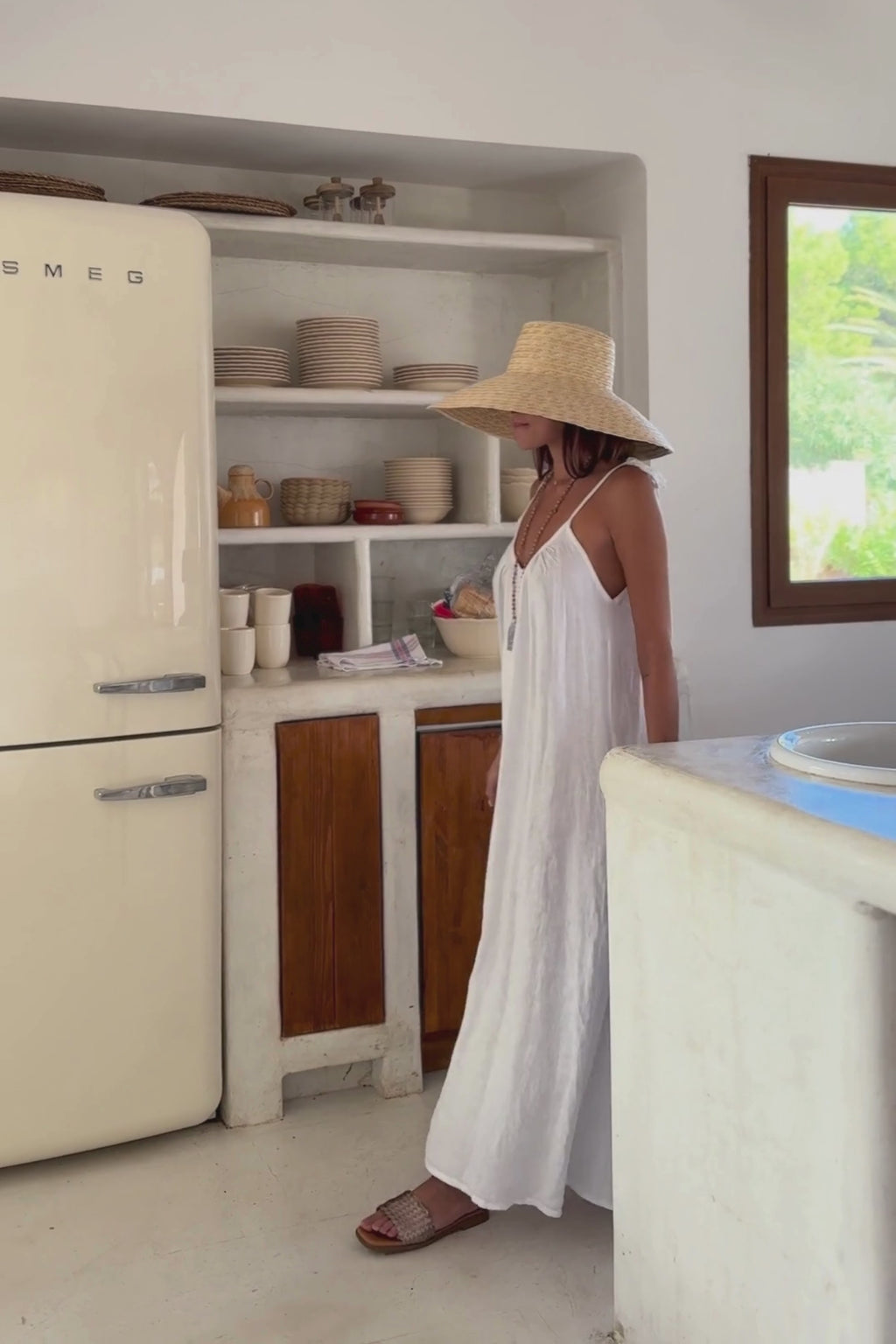 A light and airy long A-line dress with tie-up straps and a striking deep back. The dress drapes beautifully, highlighting the elegance of a relaxed, effortless style – a perfect choice for warm summer days.
