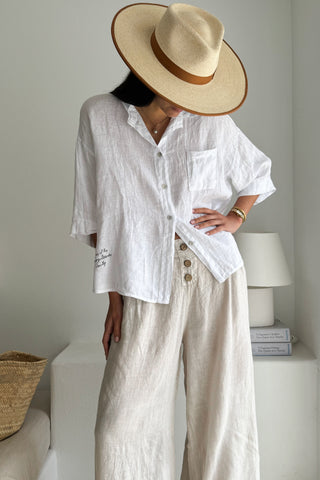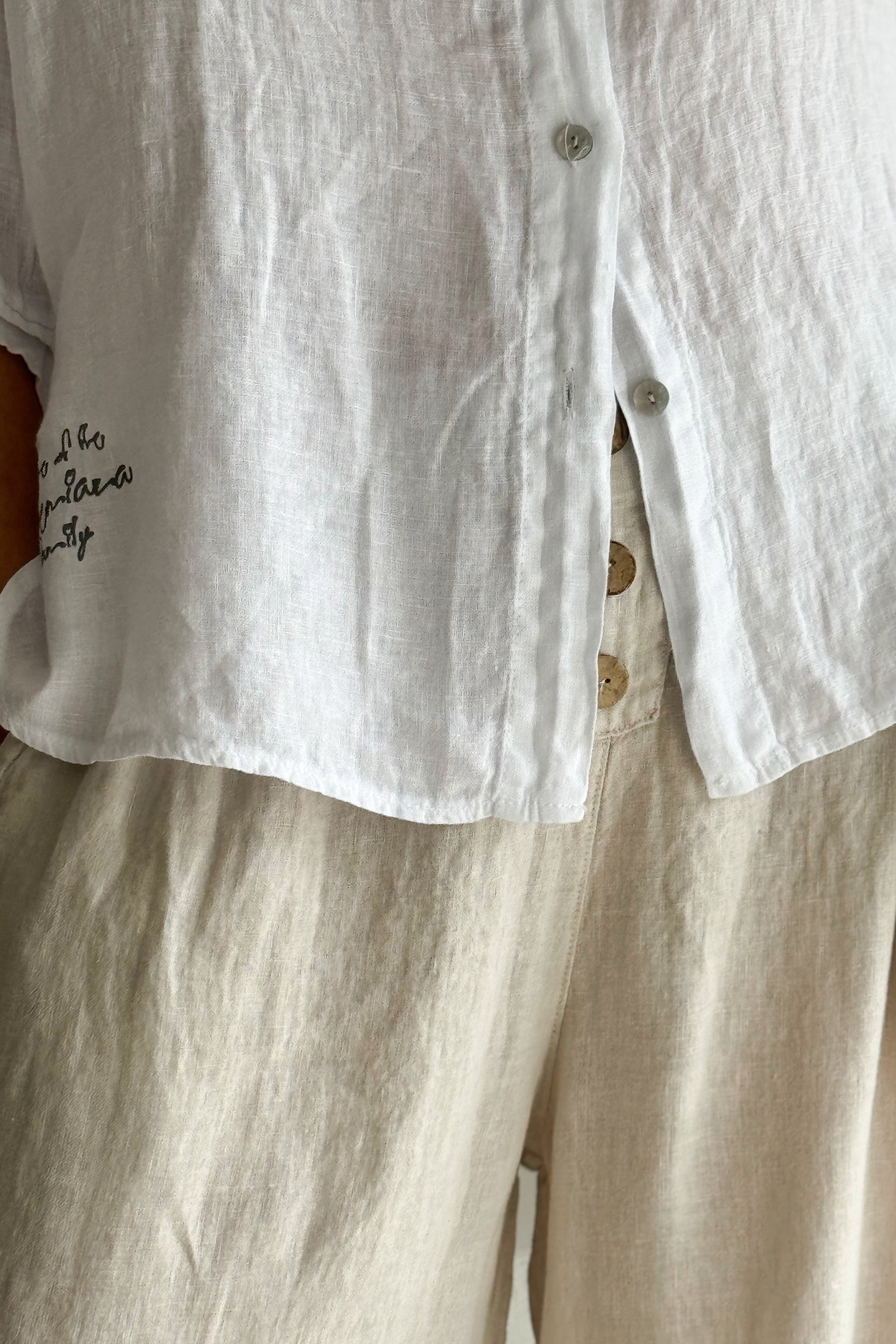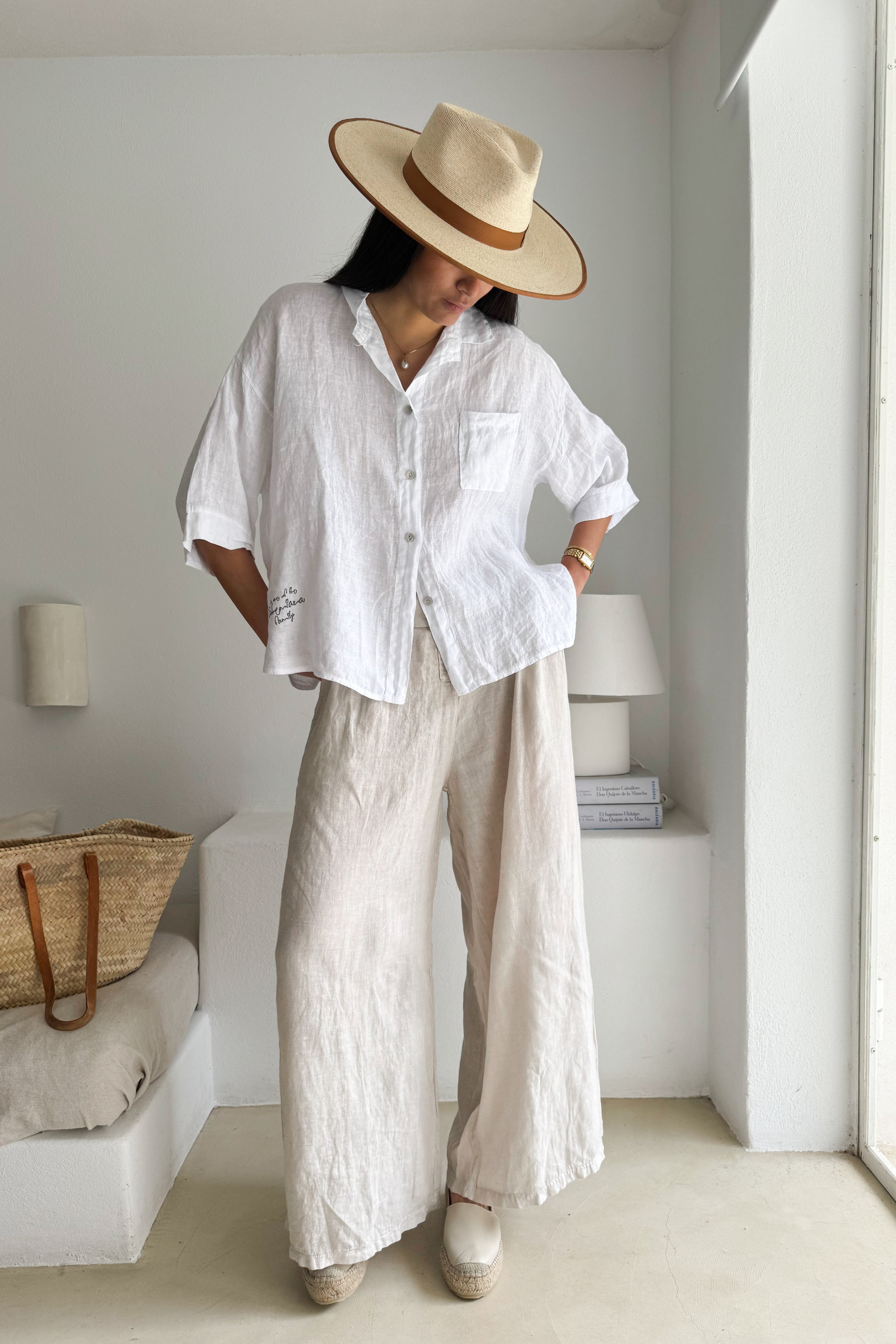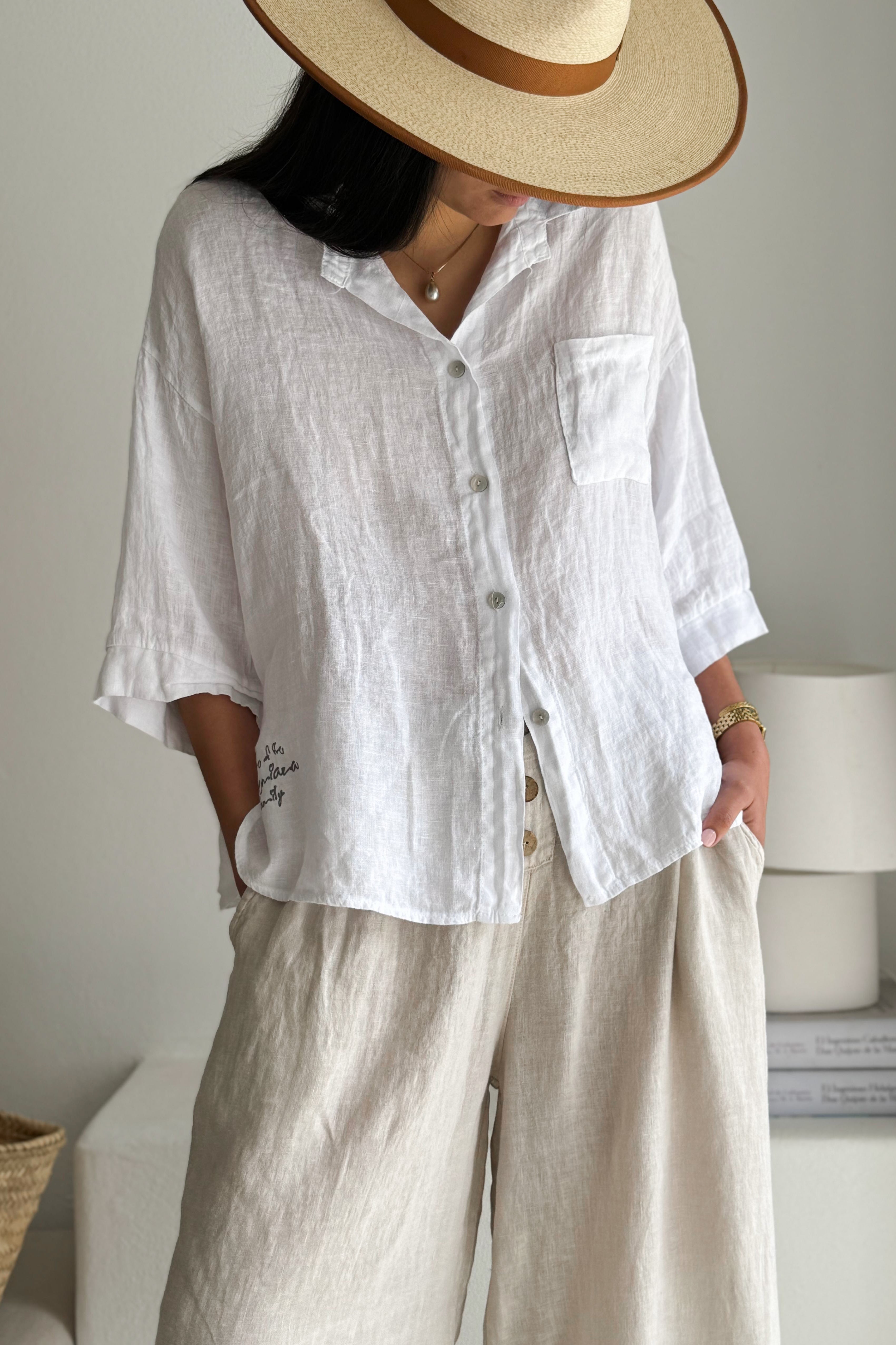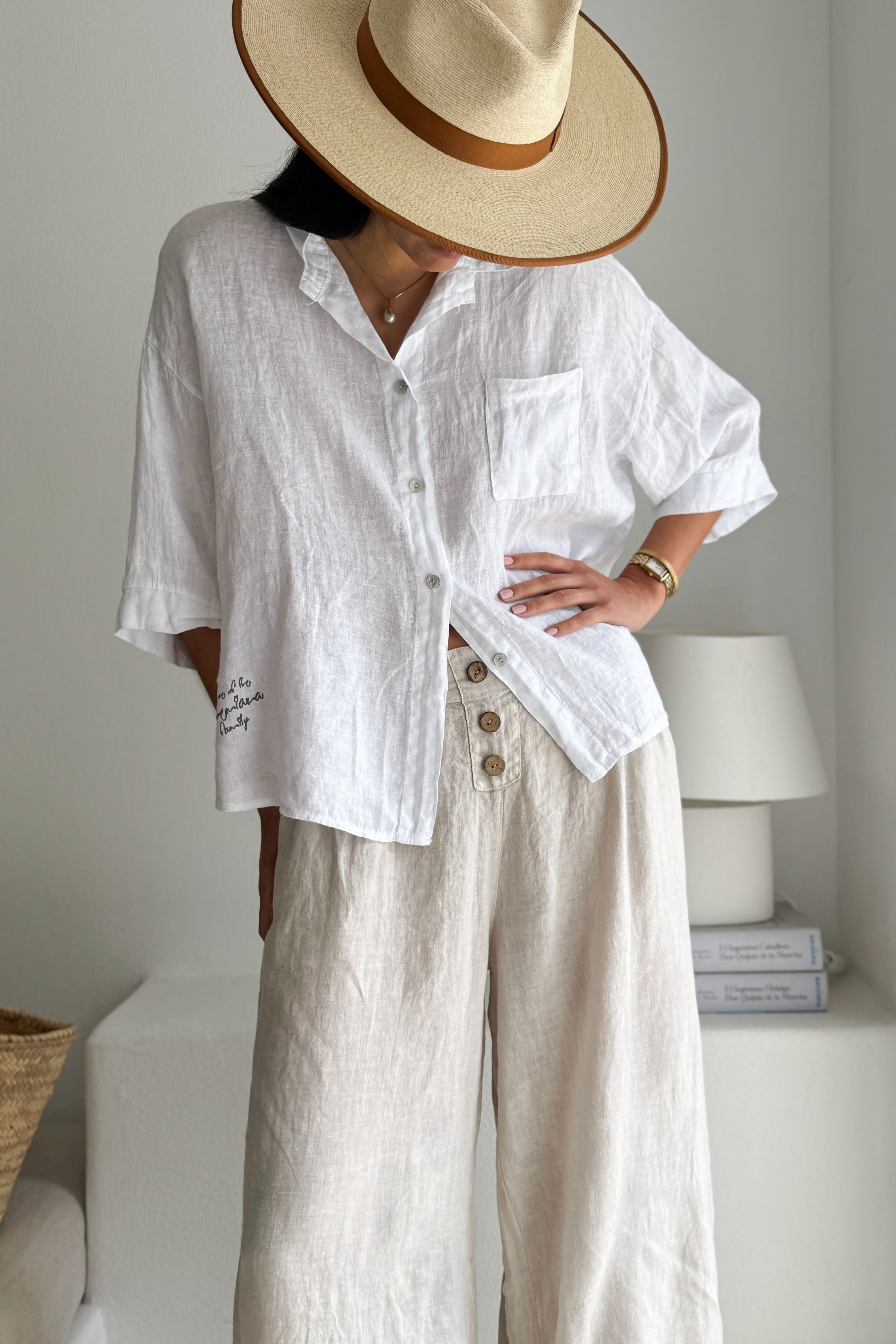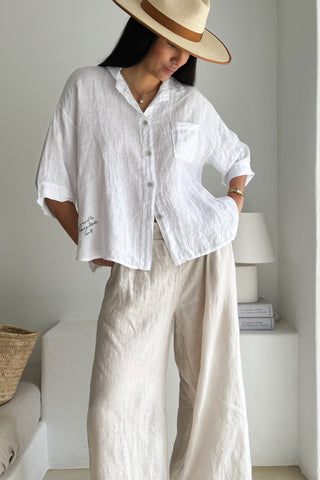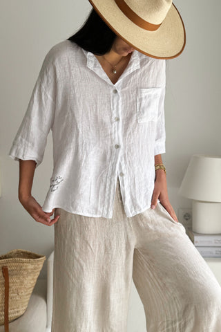 A gorgeous Bohemiana family shirt in soft and airy linen. The shirt has a dropped shoulder line and pearl buttons on the front.